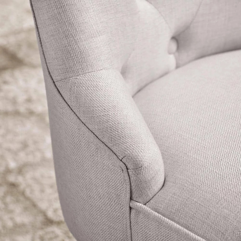 Get working on a farmhouse-chic style with the Abbeyville Button Tufted Upholstered Office Chair in Biscuit Beige. Covered in a beige linen-finish fabric and accented with elegant button-tufts and piped edge detailing, this office chair brings all of the elegant charm to your home office. The high, scroll-back design paired with a plush foam filling offers continuous comfort and support throughout the day. For added style, the sturdy wooden base is finished in a gray-wash and includes five legs with rolling caster wheels. The chair’s base also includes a swivel mechanism, and a lever-operated lift to adjust the seat height from 19 in. to 22 in. The Abbeyville Button Tufted Upholstered Office Chair in Biscuit Beige is exclusively offered by Home Depot’s Home Decorators Collection and is sure to add extra style and comfort to your home.