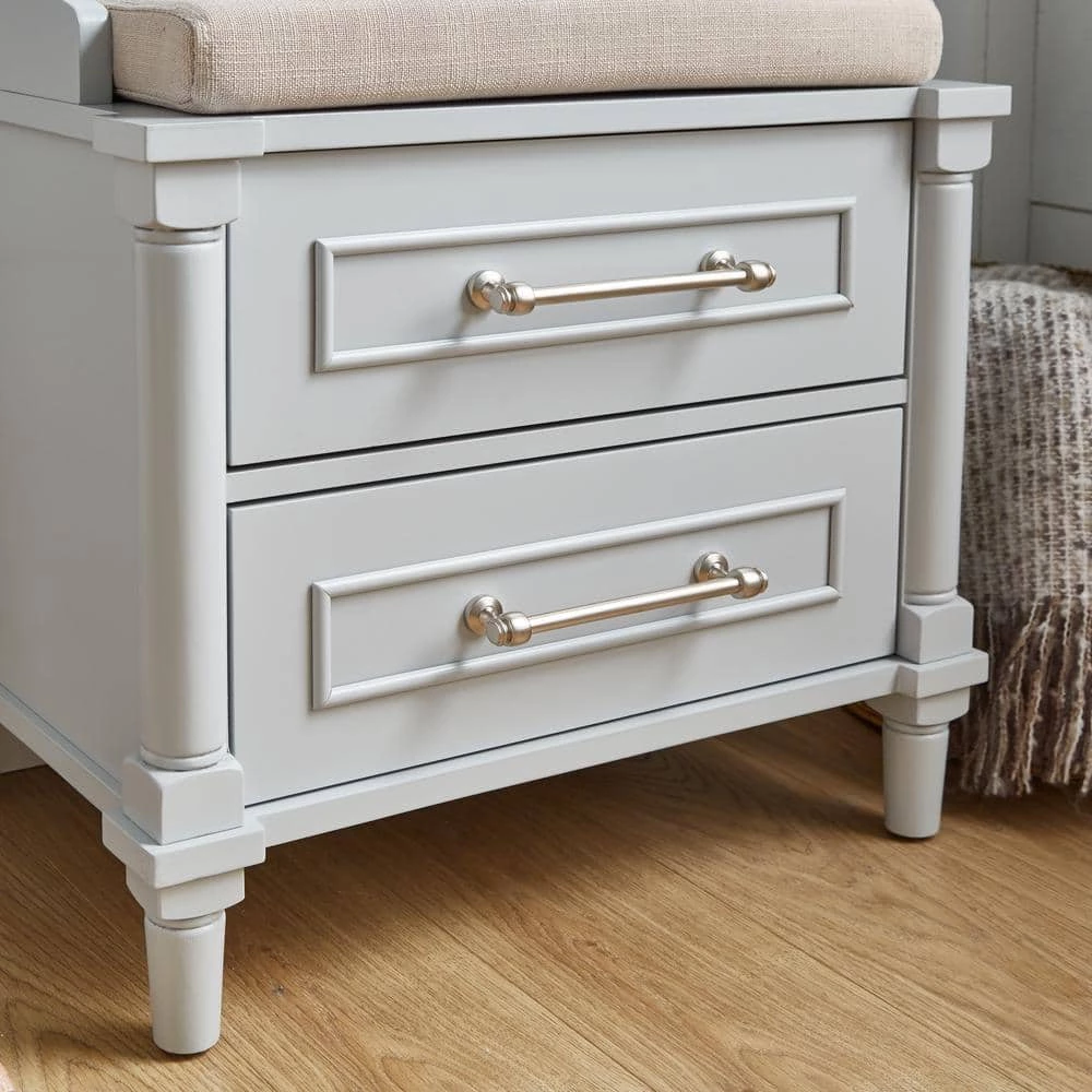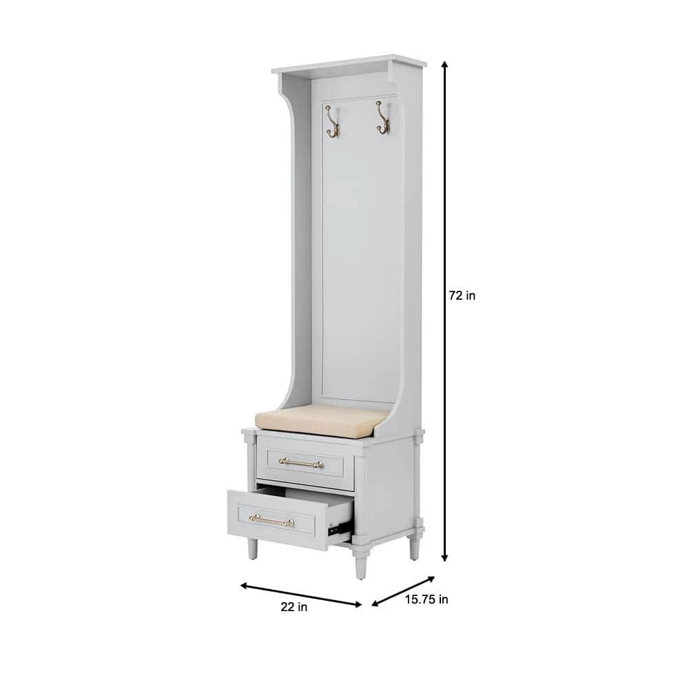 Meet the perfect entryway accessory. The Aberdeen Hall Tree from Home Decorators Collection offers functional storage with panache. At 72 in. H x 22 in. W, this hall tree maximizes the vertical space of hallways, entryways and mudrooms. Hang jackets, scarves and hats from its satin-finished double hooks and easily store away accessories in the 2-drawers below the comfy half-width bench seat. This hall tree offers a uniquely contrastive design. The square caps of the decorative posts echo the rectangle shape of the framing trim on the back panel and drawer fronts. Meanwhile, smooth curves arc down from the top shelf and out at the seat, and the piece is grounded by cylindrical feet. This theme of straight lines and curves continues in the designs of the double hooks and drawer pulls. Finished in a soft dove grey, the Aberdeen Hall Tree keeps important items handy while making convenient, high-traffic areas more functional, inviting and organized.