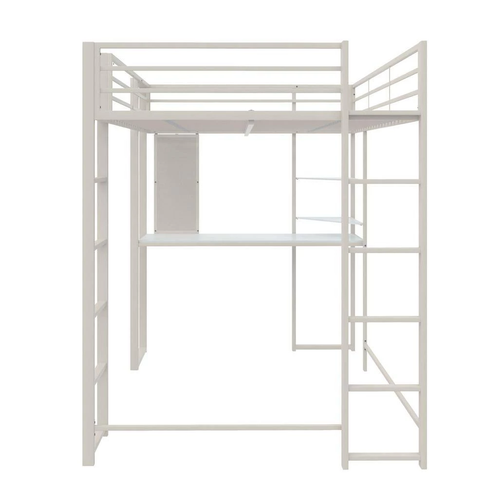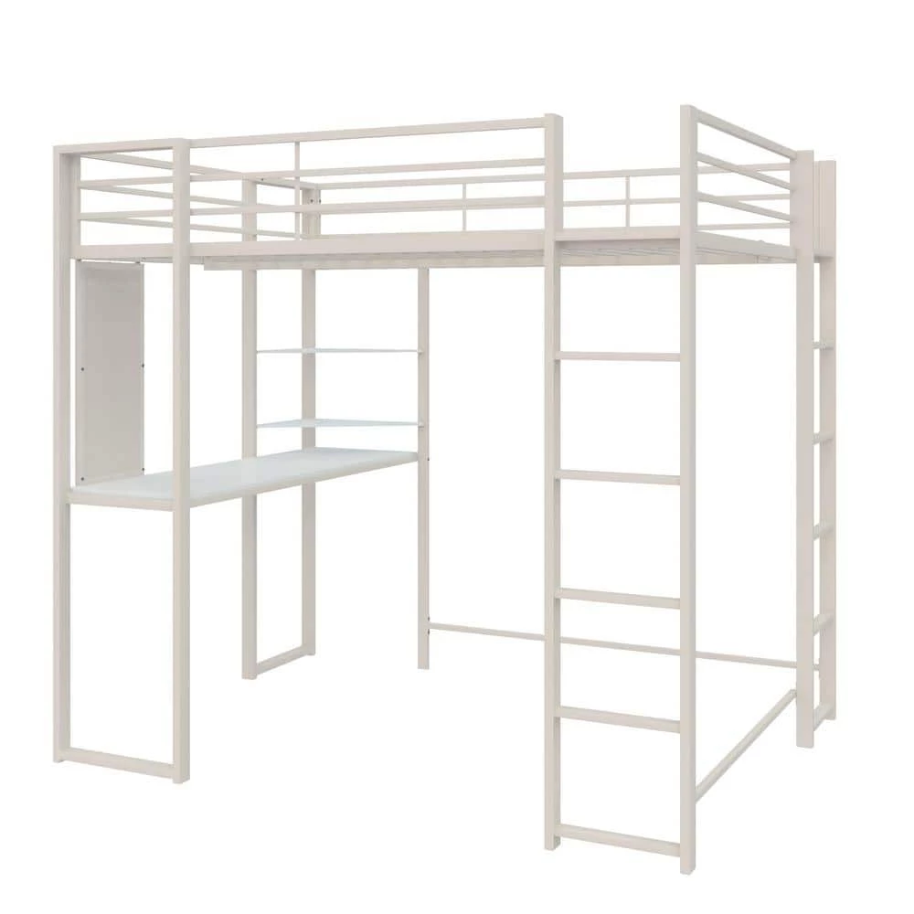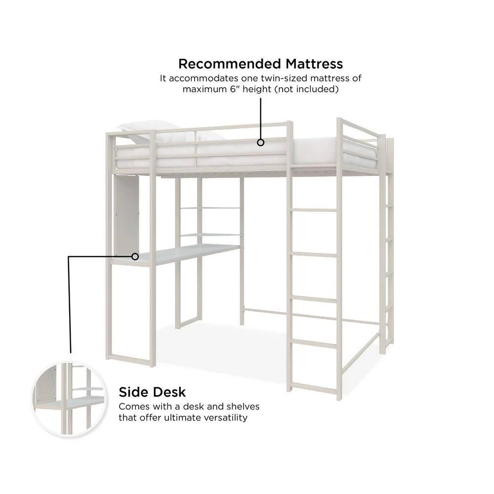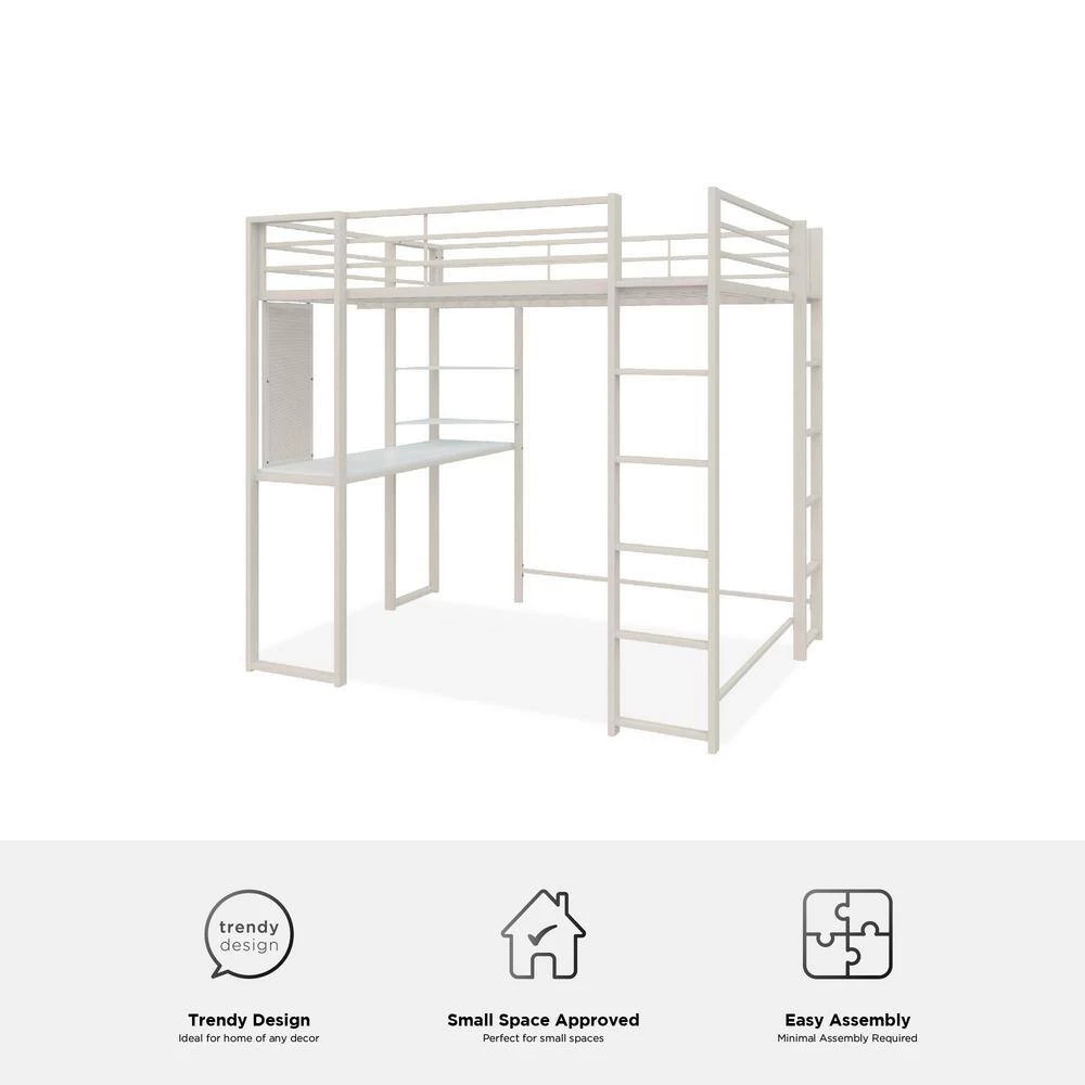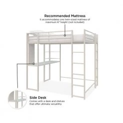 The DHP Alana Loft Bed is a versatile and compact space-saving solution. The sturdy metal frame is stable and durable; it includes metal slats that will support your mattress without the need of a foundation, this all-in-one unit comes with a desk, shelves and a pegboard that offer ultimate flexibility when space is limited. The Alana accommodates a full-size mattress (sold separately – recommended thickness of 6 in. maximum) and it has 2 ladders: 1 on the front and 1 on the side, along with upper guardrails for added safety.