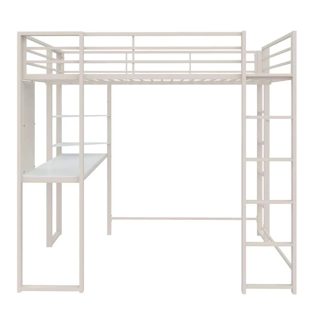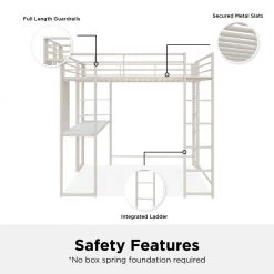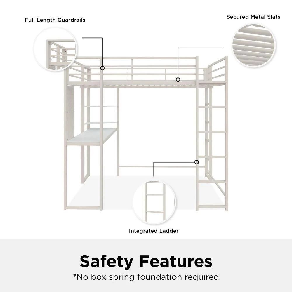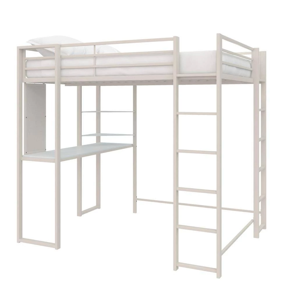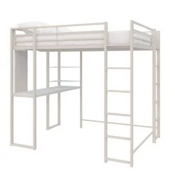 The DHP Alana Loft Bed is a versatile and compact space-saving solution. The sturdy metal frame is stable and durable; it includes metal slats that will support your mattress without the need of a foundation, this all-in-one unit comes with a desk, shelves and a pegboard that offer ultimate flexibility when space is limited. The Alana accommodates a full-size mattress (sold separately – recommended thickness of 6 in. maximum) and it has 2 ladders: 1 on the front and 1 on the side, along with upper guardrails for added safety.