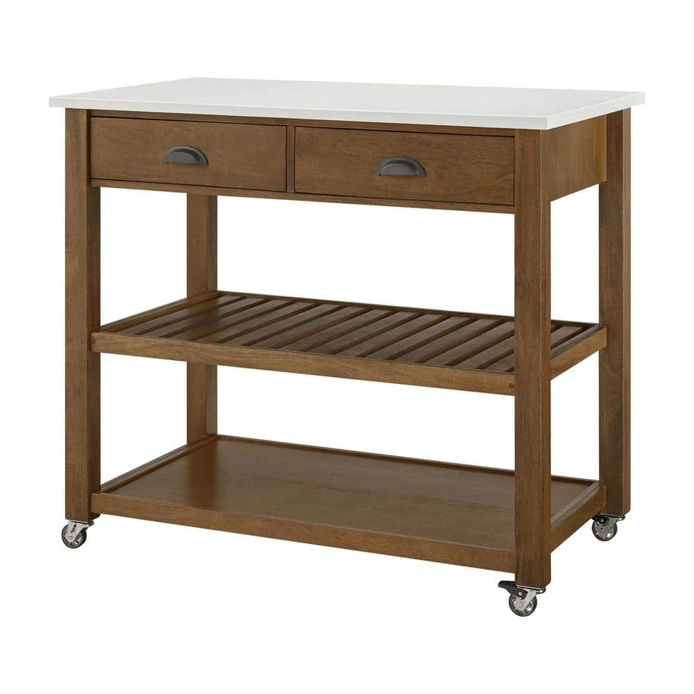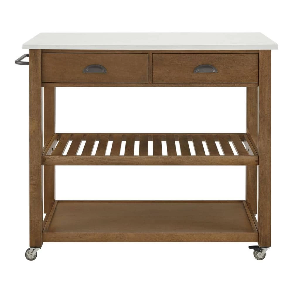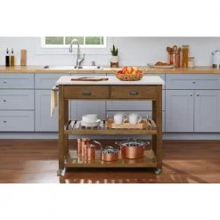 Bring a quaint, cozy look to your home with this Alstead Wooden Farmhouse Kitchen Cart by our exclusive Home Decorators Collection. Two open shelves offer perfect perches for serving bowls, baskets of fruit and other kitchen items, while the two drawers provide concealed storage for utensils and flatware. A beautiful stone-finish top provides lasting durability and lets you expand the available work area in your kitchen. Use the integrated rack to organize towels, aprons and hot pads. The HDC Alstead Kitchen Cart also boasts locking casters, making it easy to move and station throughout your home. This cart requires partial assembly as only the hardware and marble top need to be installed to the pre-assembled cabinet base.
