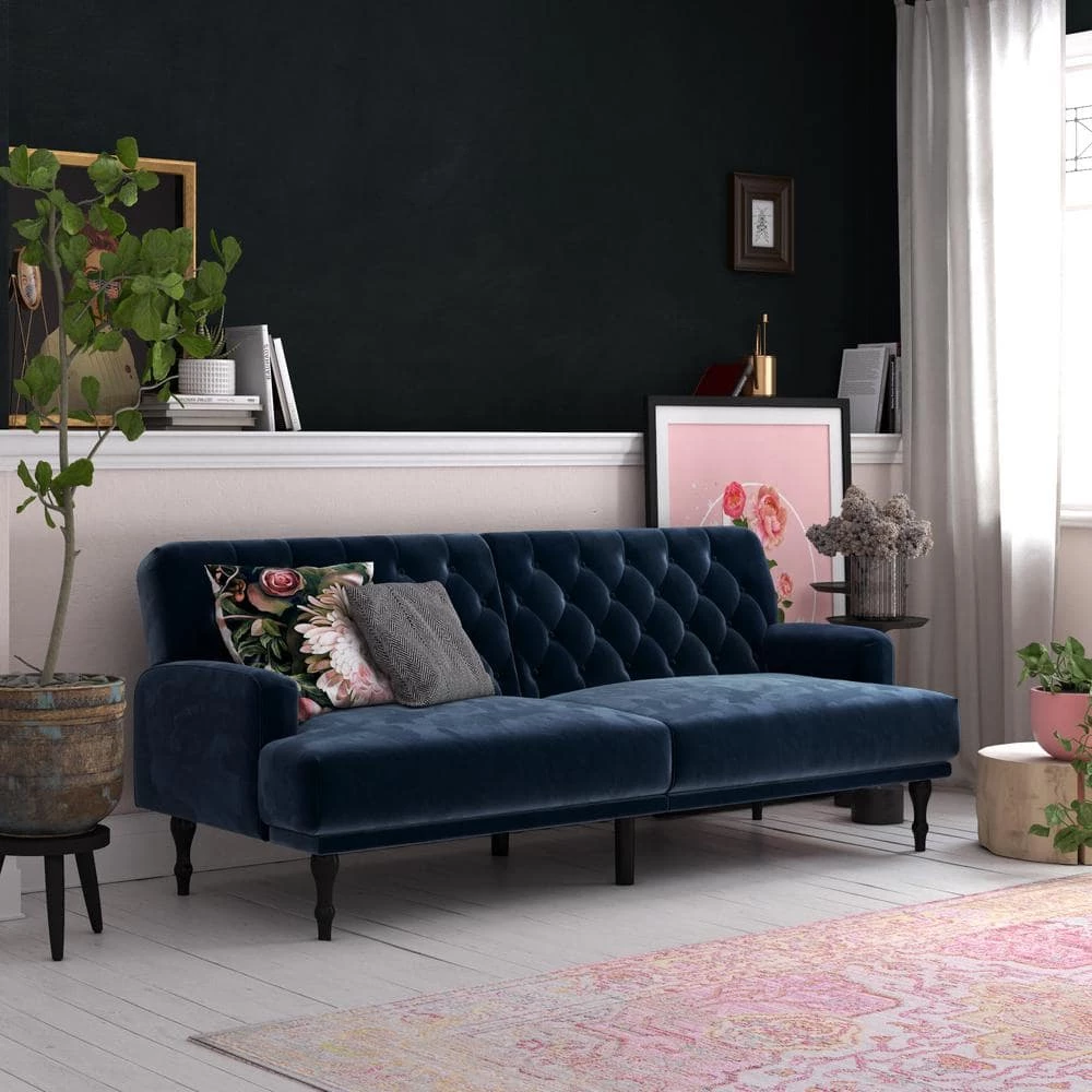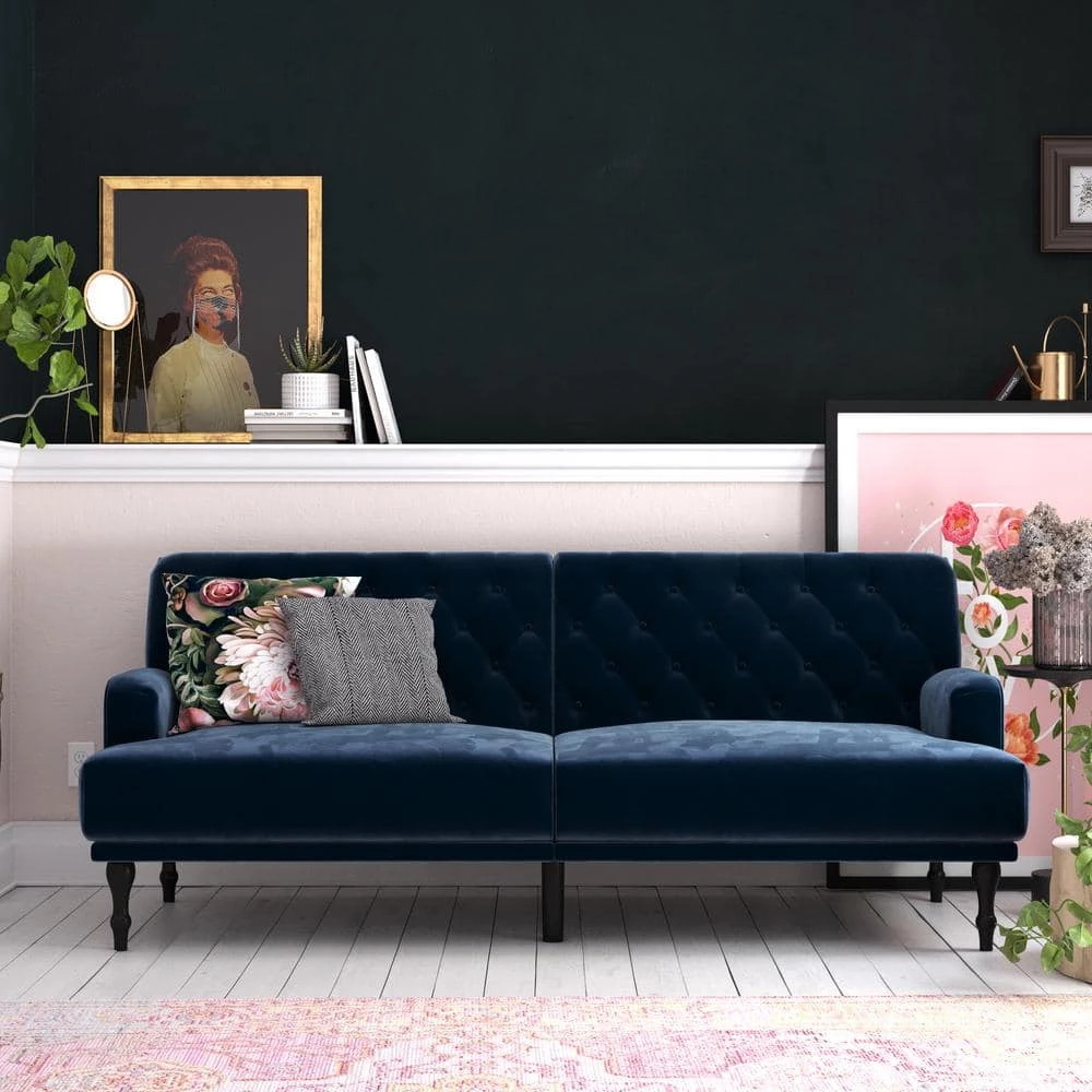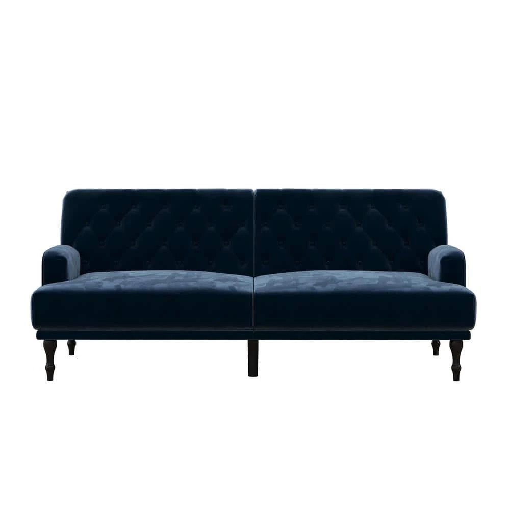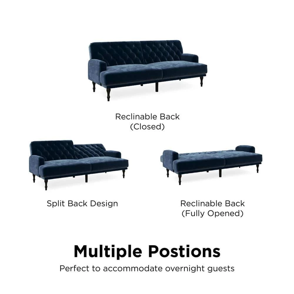 Bring a little touch of both old and new styles into your home with the help of the DHP Ayla Upholstered Futon. Designed with a lush velvet upholstery, diamond-tufted detailing, and solid wood fluted legs, the Ayla has a 50s vintage charm with a modern-day flair. Its sturdy wood construction includes a multi-functional split-back design that can be easily converted between three positions: sitting, lounging, and sleeping. With a simple push or pull motion, you can lounge the seat back to watch a movie or recline all the way to a sleeping position to provide your guests with a comfortable bed to sleep overnight. Offered in multiple beautiful color options, we have no doubt you will be able to find the perfect DHP Ayla Upholstered Futon for your home.