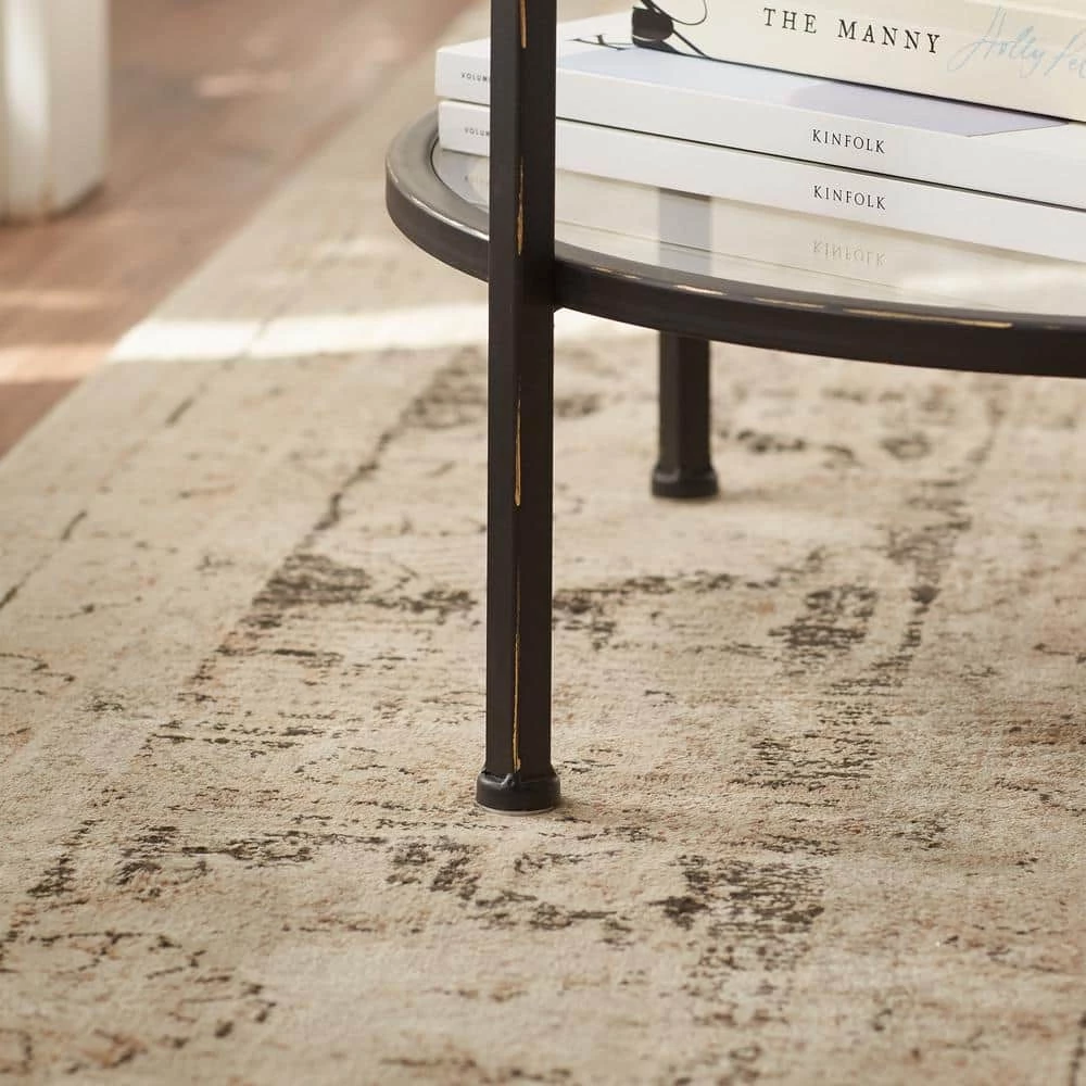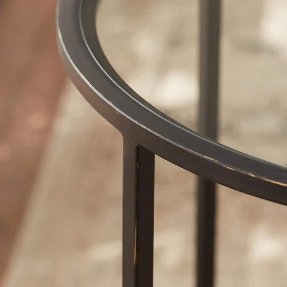 Our Home Decorators Collection Bella round accent table is poised to steal the show in a living room or bedroom. Tempered glass forms the tabletop and lower shelf. An antique bronze finish warms the side table’s sleek round metal frame.