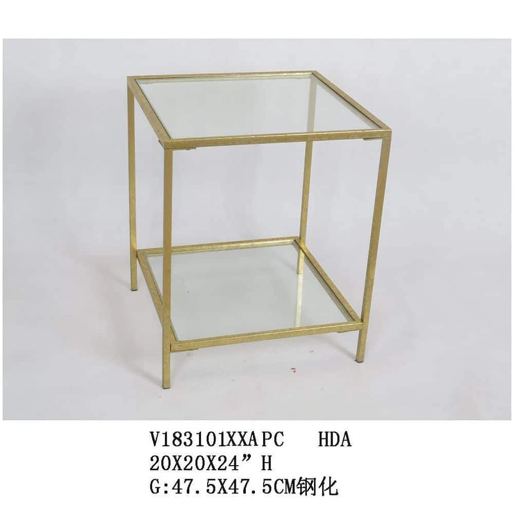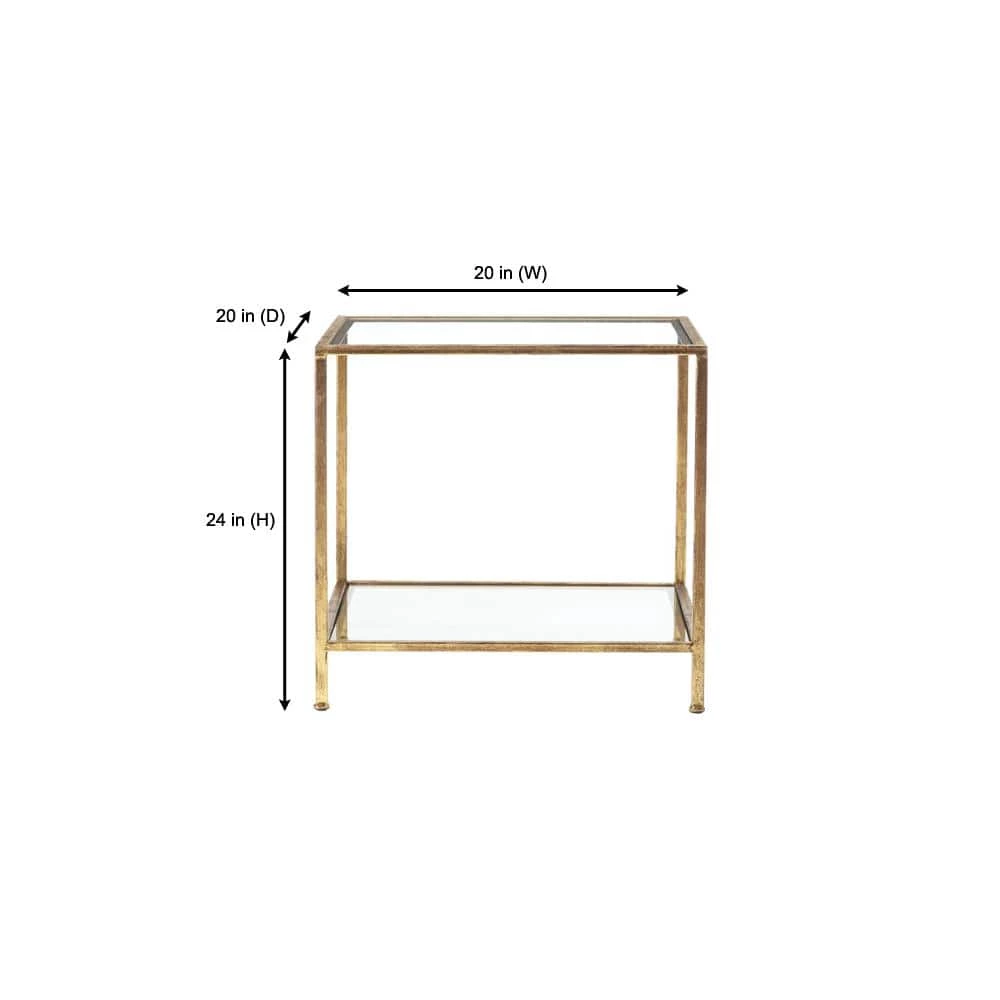Our Home Decorators Collection Bella square accent table is poised to steal the show in a living room or bedroom. Tempered glass forms the tabletop and lower shelf. A gold leaf finish lightens the side table’s sleek square metal frame.