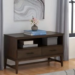 Our Home Decorators Collection Bellamy TV stand combines storage with a pleasing modern design. The streamlined rectangular cabinet is an understated showcase for up to a 60 in. TV and accompanying media components. There’s room in the drawers for games, electronics and more.