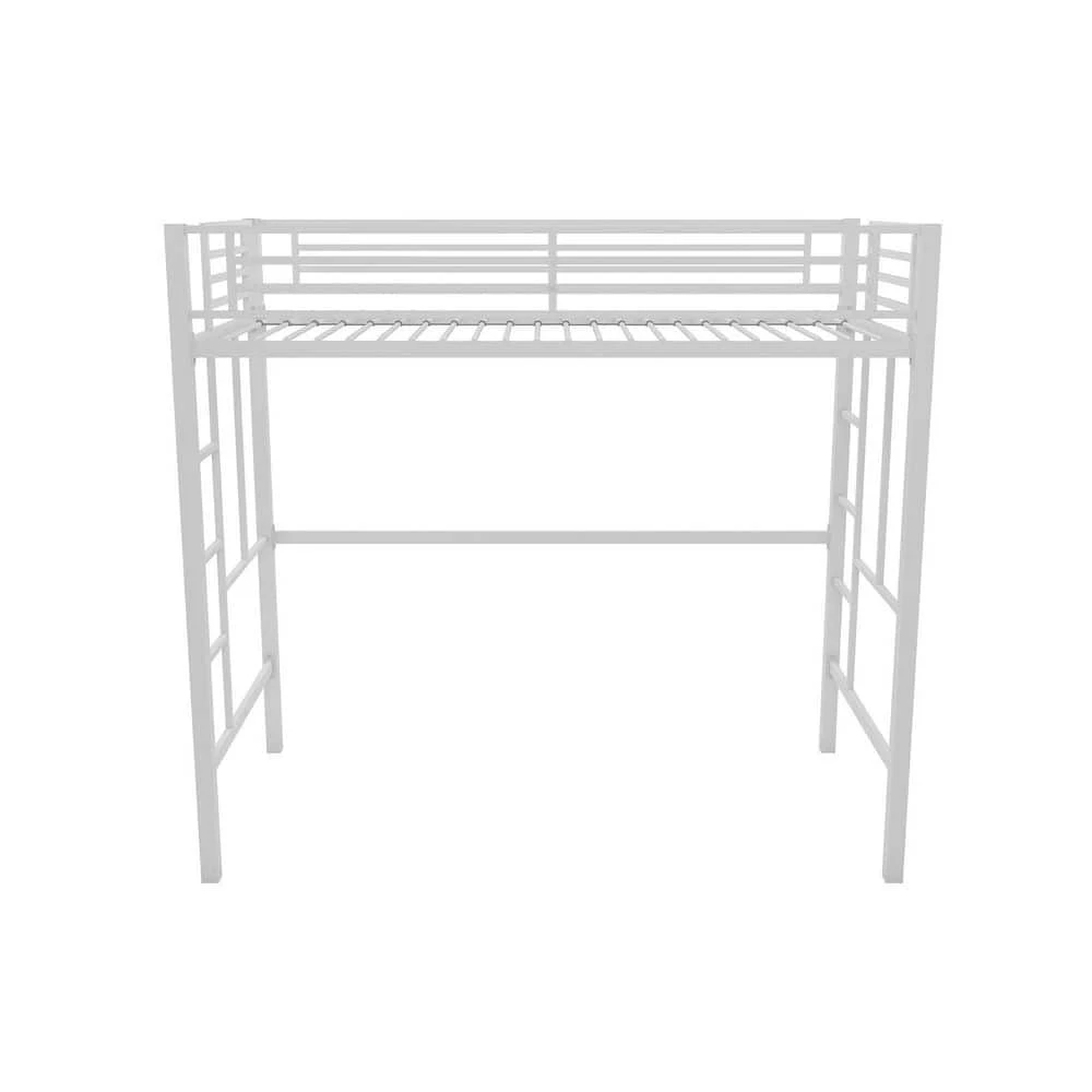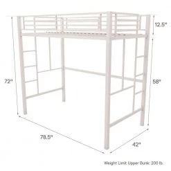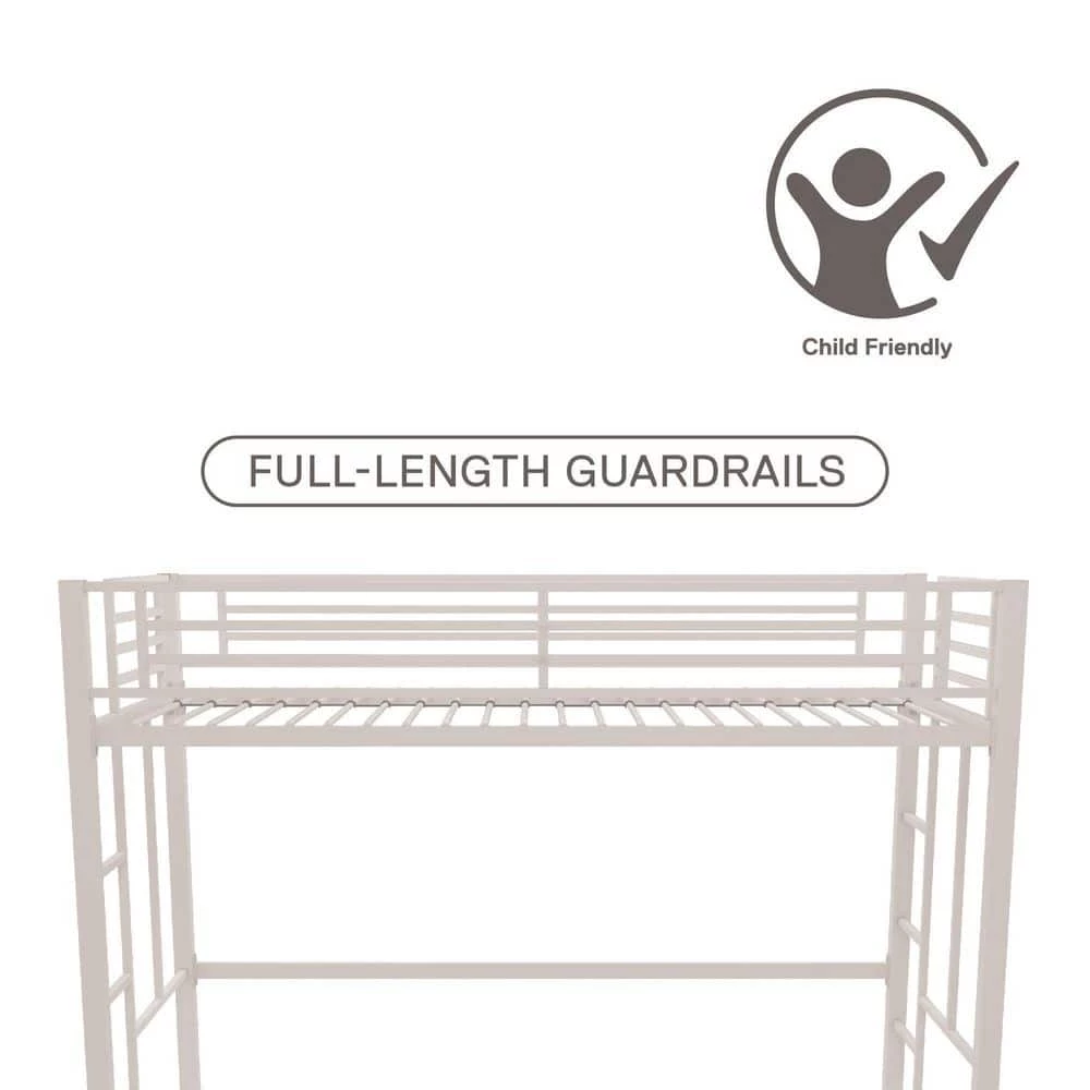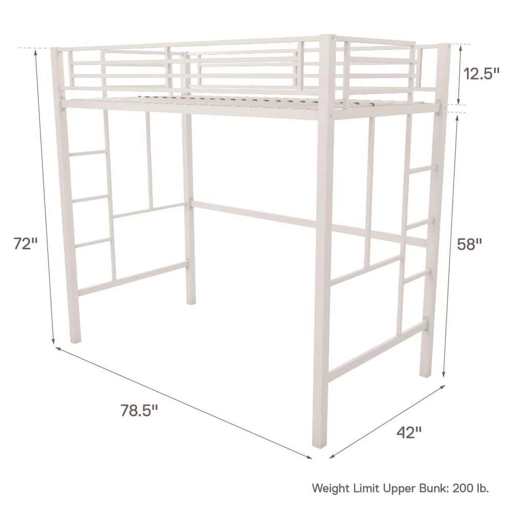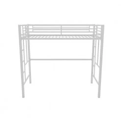 A smaller sized kid’s bedroom is no match for the DHP Benjamin Twin Metal Loft Bed. This furniture solution gives any teenager or child a perfect spot for sleep, study or solitude with a large 58 in. clearance below the top twin bunk that can be used as a gaming hub, study nook or storage center. Constructed with a sleek metal frame that is both strong and modernly styled with vertical and horizontal angular lines, the bed features 2 integrated ladders, each on opposite ends, to make climbing in and out of bed simple. And full-length guardrails blend effortlessly with the bed’s design while providing safety against accidental falls. Featuring a durable metal slat base on the upper bunk, your child’s mattress will be fully secured so no additional box spring or foundation is required. A quality addition to your home, the DHP Benjamin Twin Metal Loft Bed is a style and space saving winner. Twin size mattress not included.
