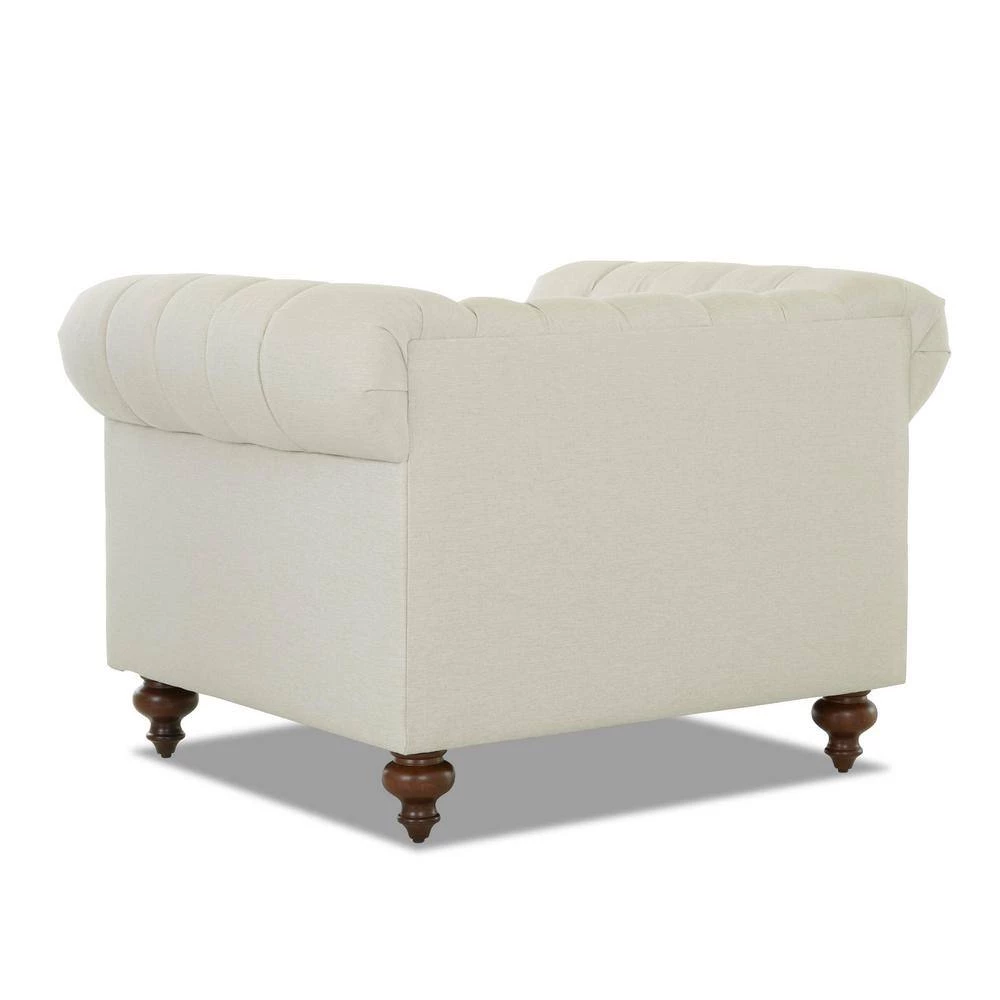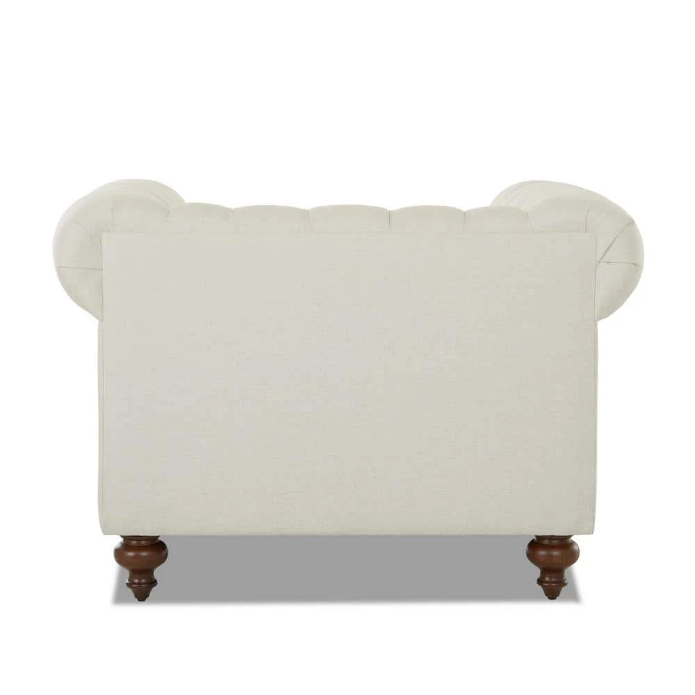 Update your space in elegant comfort with the Blakely Fabric Chair. The Chesterfield design features a luxurious, deeply button-tufted back neatly framed by classic rolled arms. The arms are lightly pleated for an added dose of flair and feature antique nickel nail head detailing for a little extra style. Loose seat cushion is filled with down for a plush seating surface that only becomes more comfortable over time. Turned, black walnut finished wood legs round out the style. Hand crafted in the USA from fine domestic and imported materials. All orders of the Blakely Chair are made-to-order and considered custom orders. Please note, custom orders must be cancelled within 48 hours of purchase to be eligibile for returns.