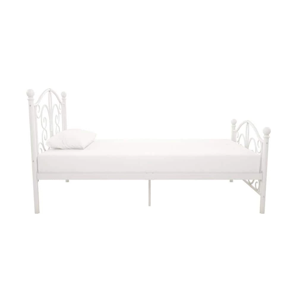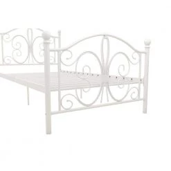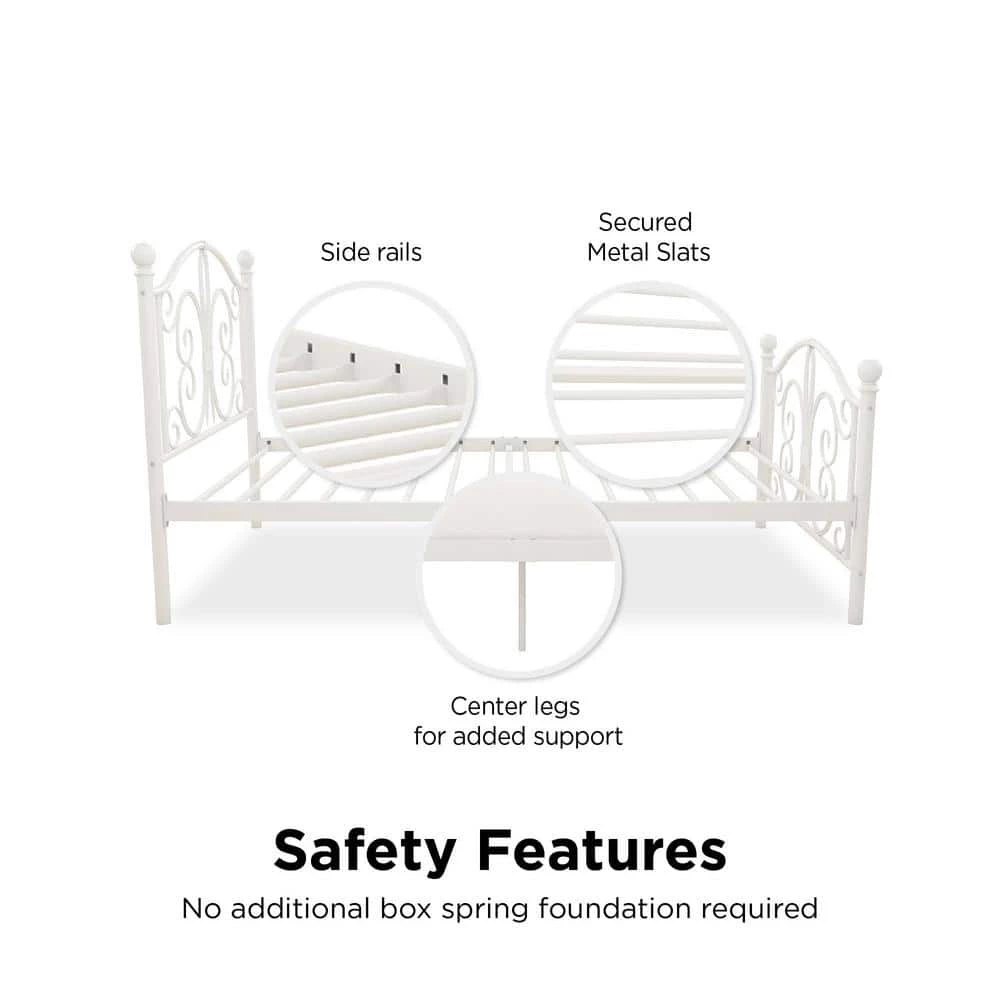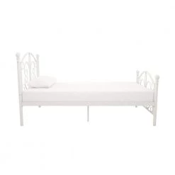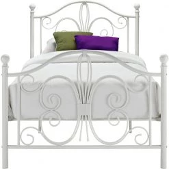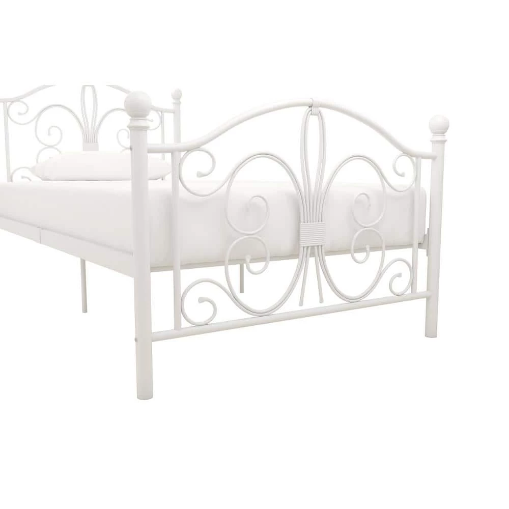 Add a touch of elegance to your bedroom with the DHP Bombay Metal bed. The headboard and footboard boast traditional scrollwork curves with round finial posts to provide a simple, yet classic look. Complete with metal slats and supporting legs, this bed does not require a box spring or bunkie board. Available in a white finish that compliments a multitude of room decors, the DHP Bombay Metal Bed will be the focal point of your bedroom.