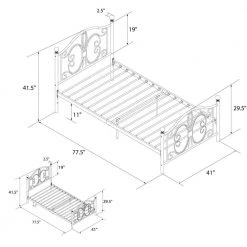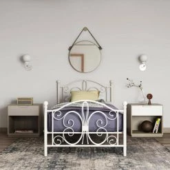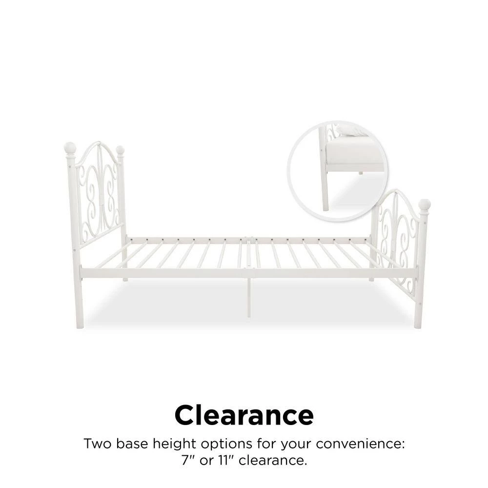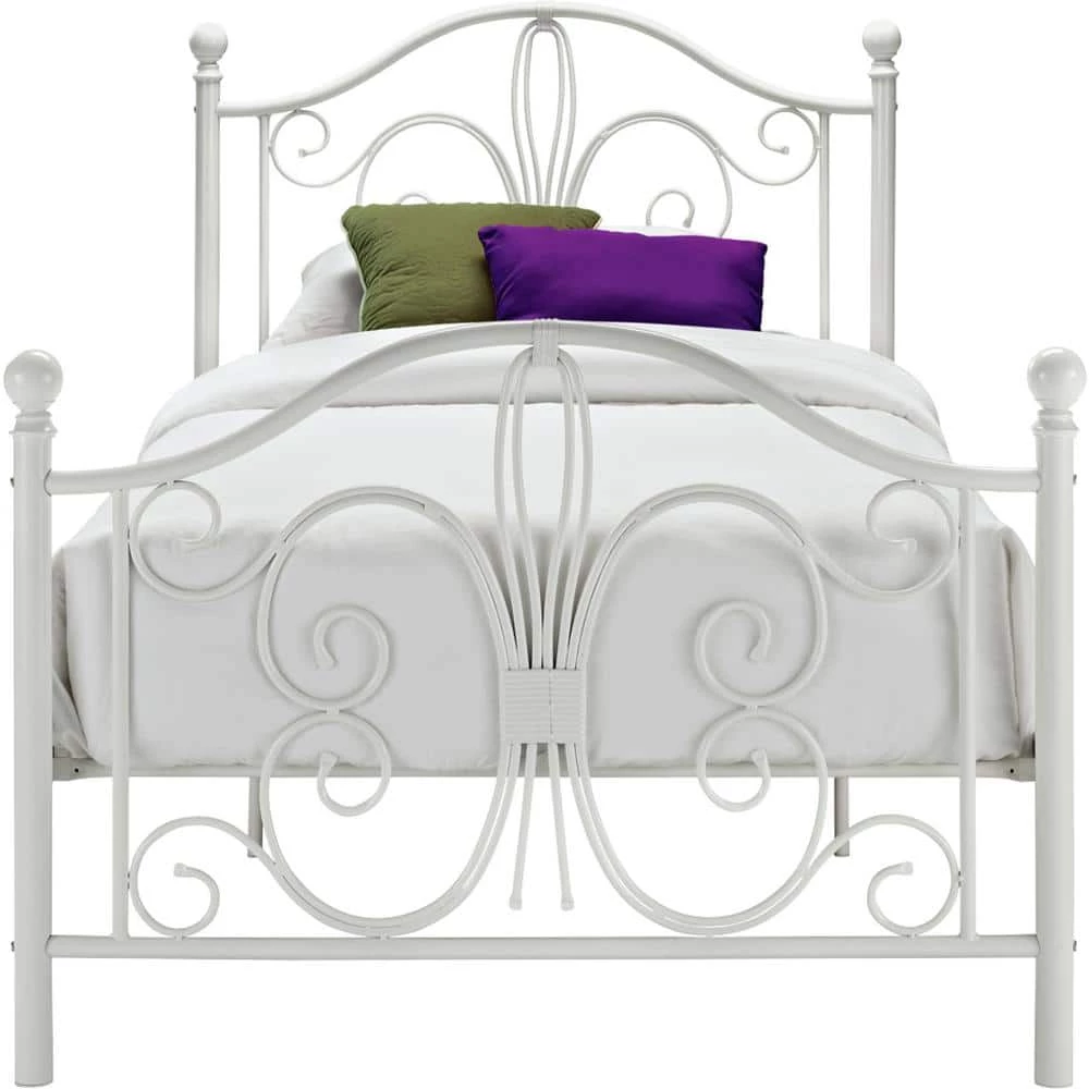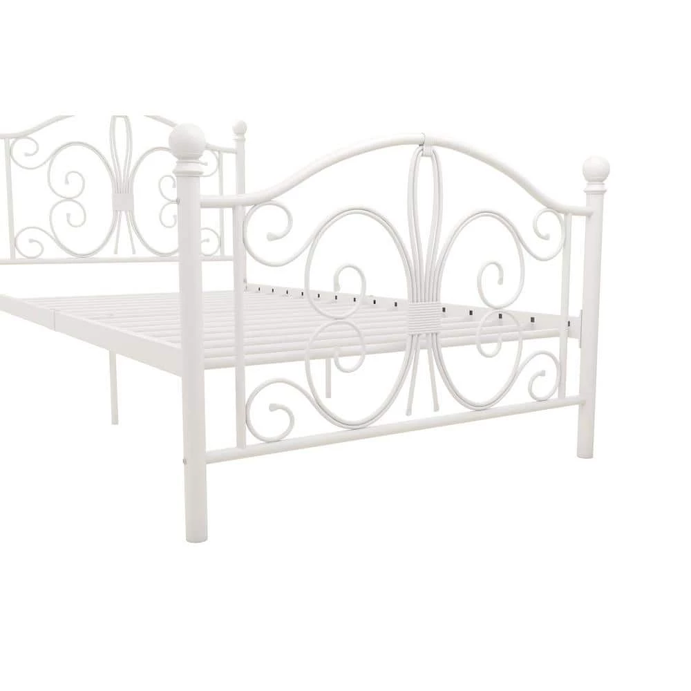 Add a touch of elegance to your bedroom with the DHP Bombay Metal bed. The headboard and footboard boast traditional scrollwork curves with round finial posts to provide a simple, yet classic look. Complete with metal slats and supporting legs, this bed does not require a box spring or bunkie board. Available in a white finish that compliments a multitude of room decors, the DHP Bombay Metal Bed will be the focal point of your bedroom.