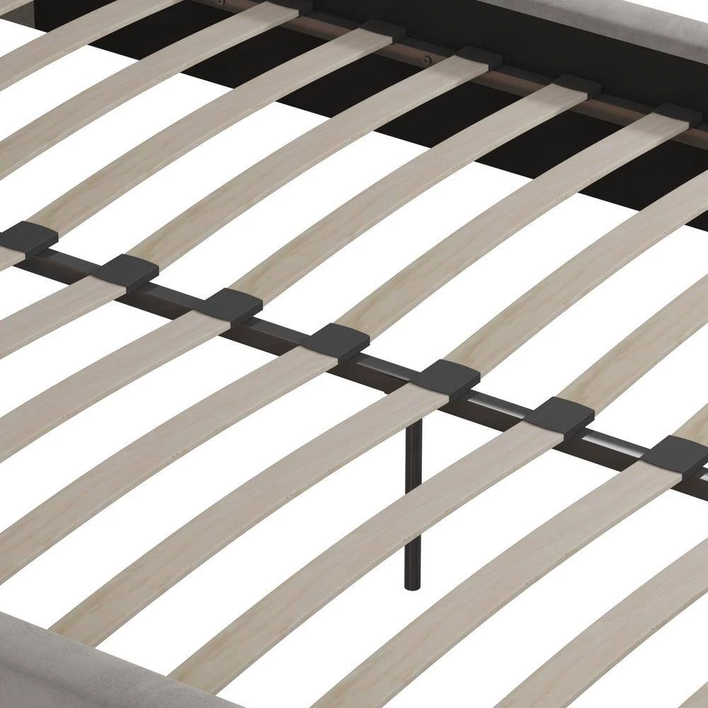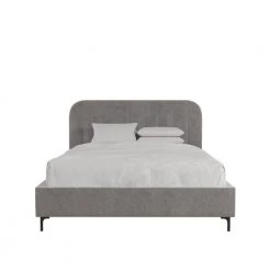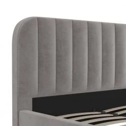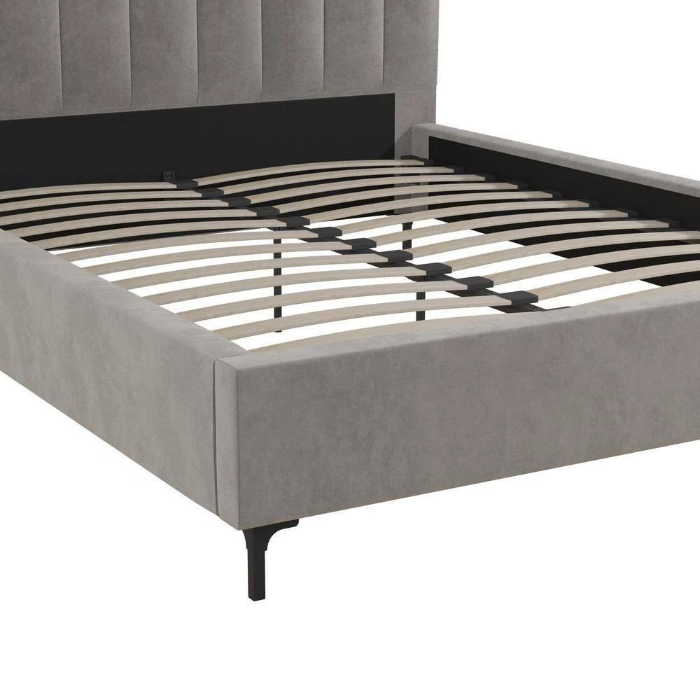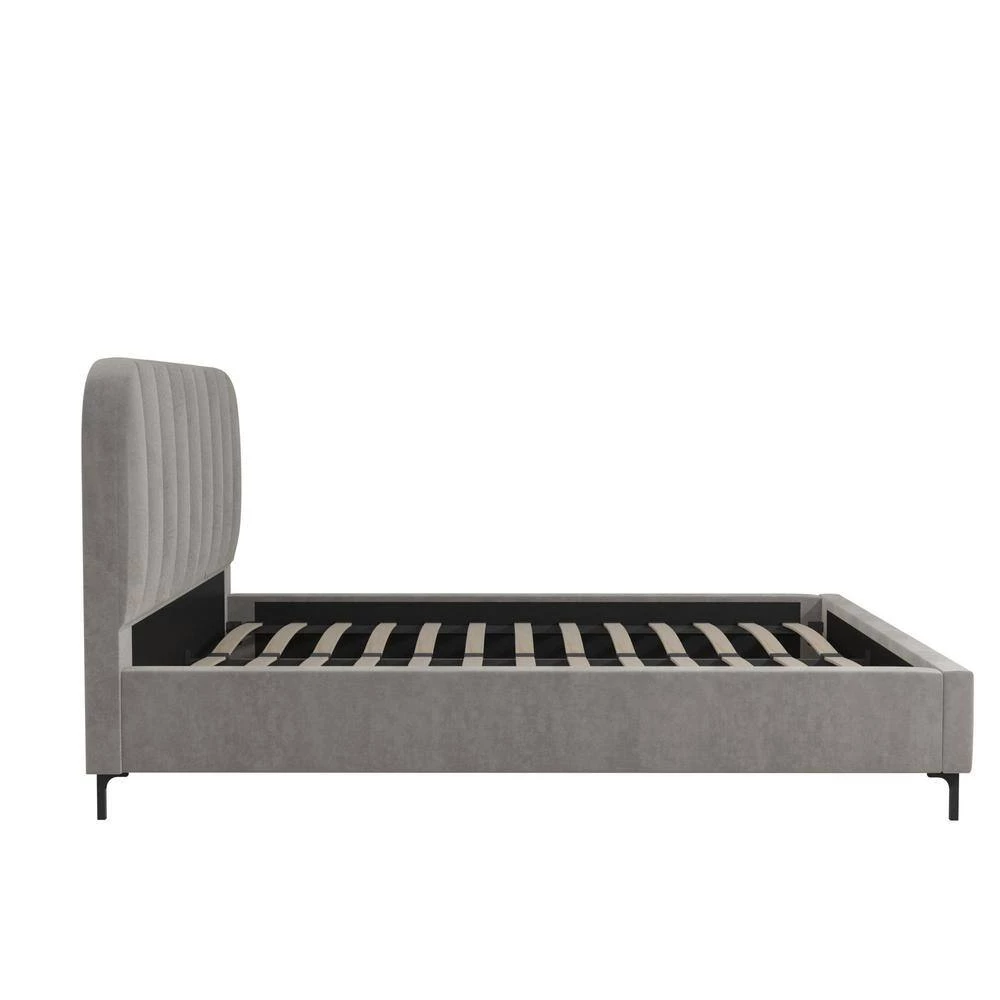 - Chic modern velvet upholstered bed with high profile ribbed tufted headboard and low profile foot board.