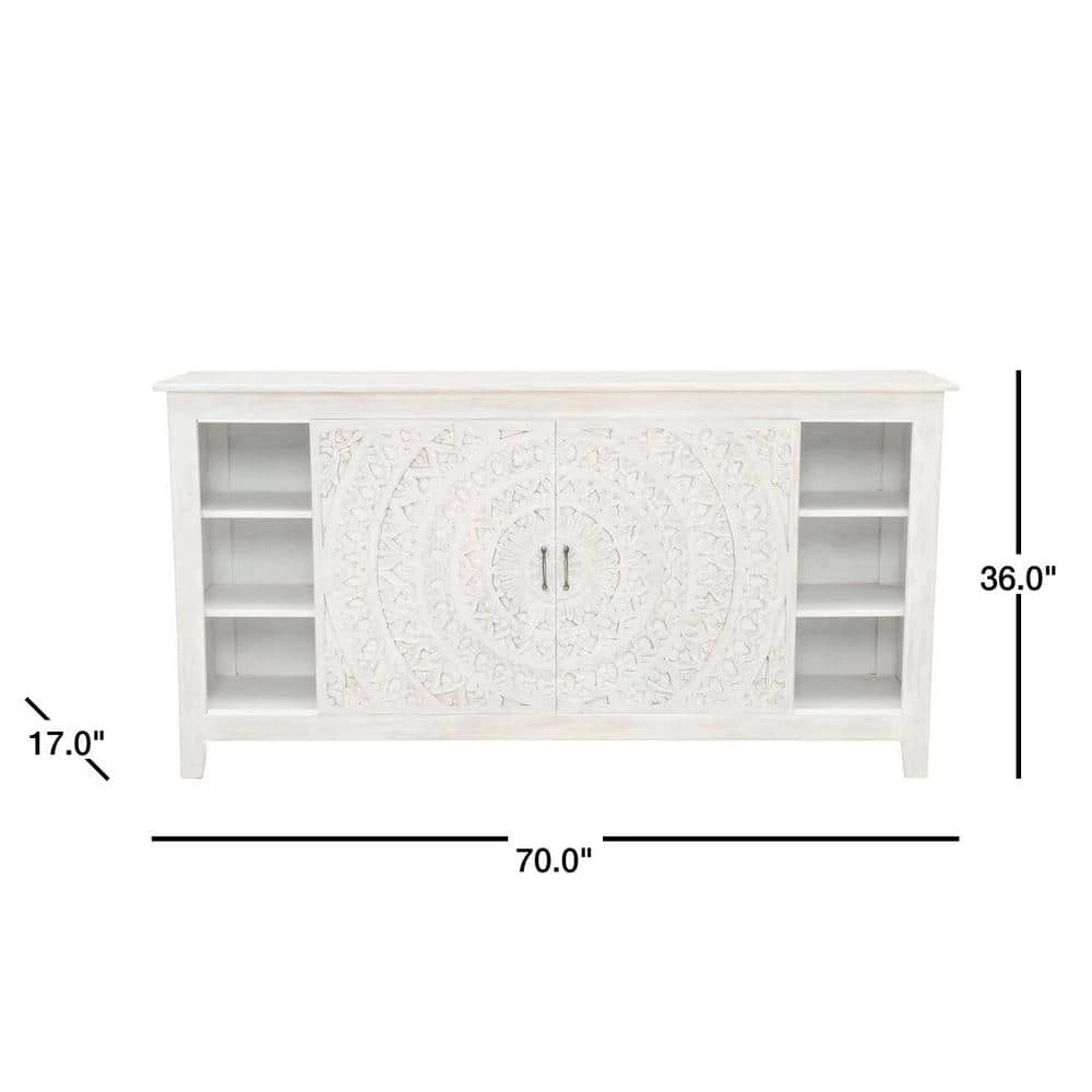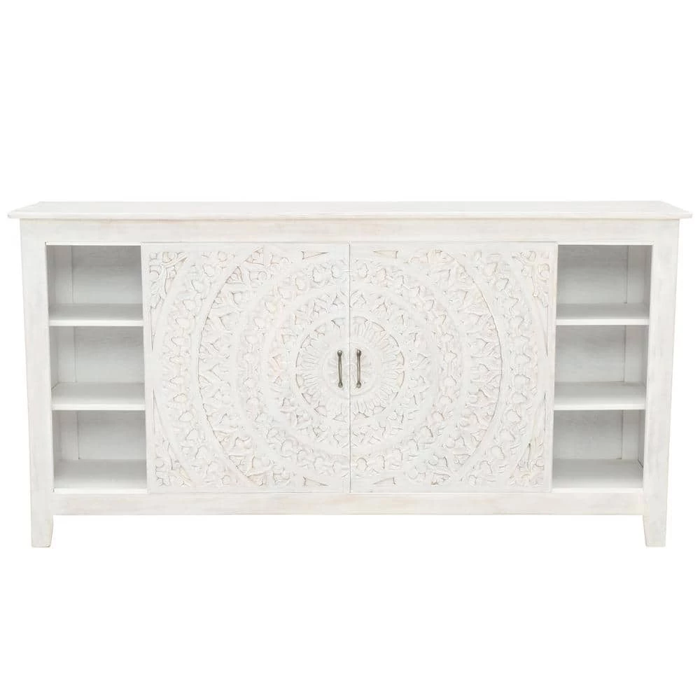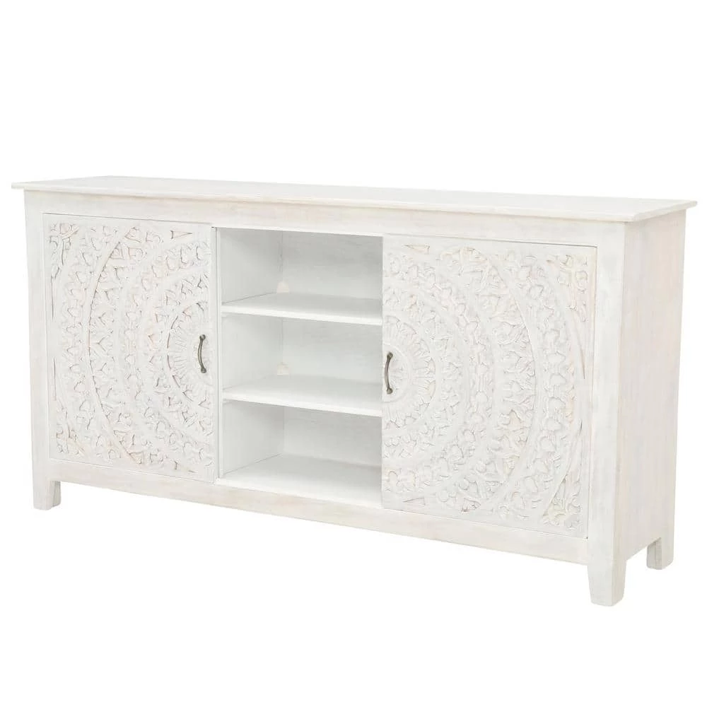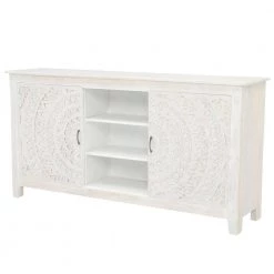 Introduce our unique Chennai Sliding Door Media Cabinet into your living room to add a world beat aesthetic. Crafted of mango wood, this TV stand features a stunning medallion design that spans the 2 sliding doors. The area behind the doors is separated into 3 sets of 3 shelves.