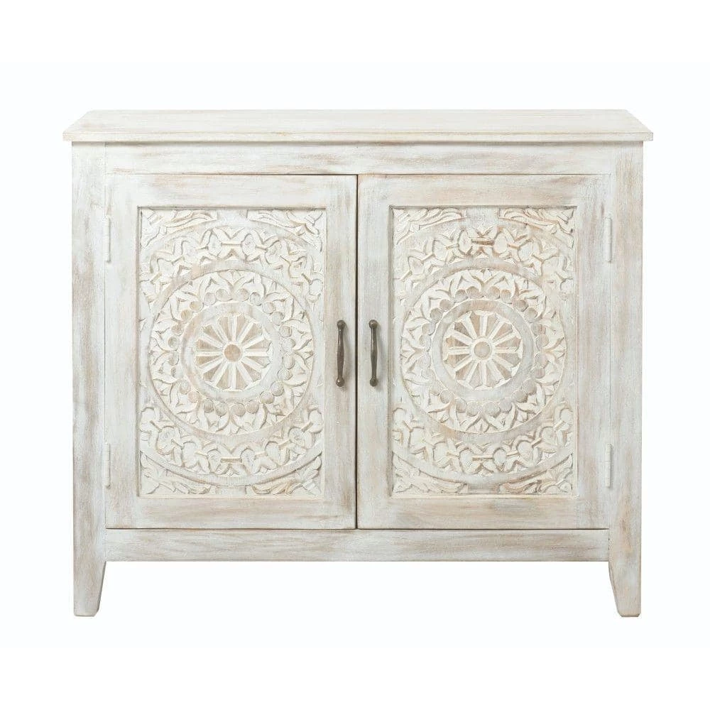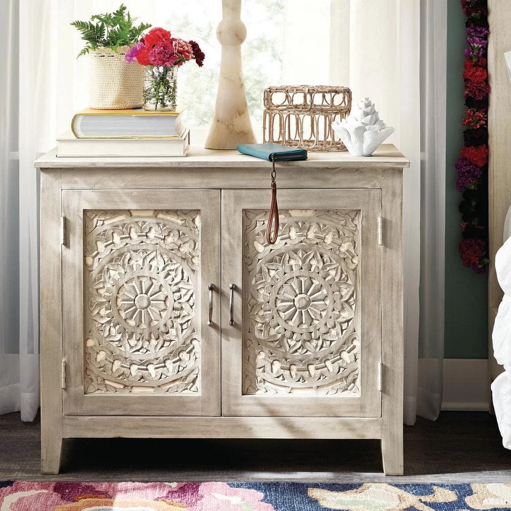 With an intricate medallion design carved into each door, our Chennai Nightstand is the perfect accessory for your bedroom. Mango wood in a whitewash finish gives this bedside table world-beat appeal. Try complementing it with vintage or cottage decor in muted colors. This wooden nightstand is roomy as well as stylish. Thanks to the removable interior shelf, you can fit anything inside, from books and remotes to your computer and nighttime slippers.