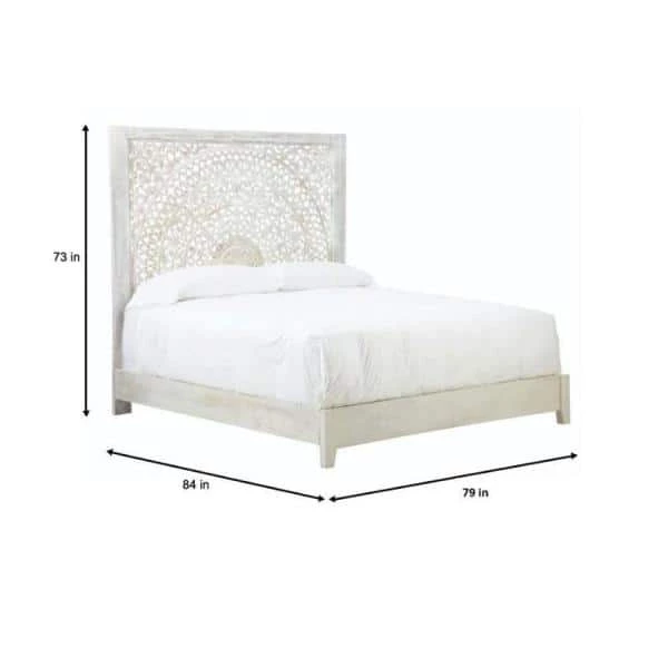 Our Chennai Bed’s elaborately carved headboard makes it the ultimate focal point for your bedroom. This beautiful platform bed is crafted of mango wood in a whitewash finish, adding a touch of cottage style to the world-beat design. Pair this wooden bed with a solid-colored bedspread so as not to distract from the elaborate medallion motif.