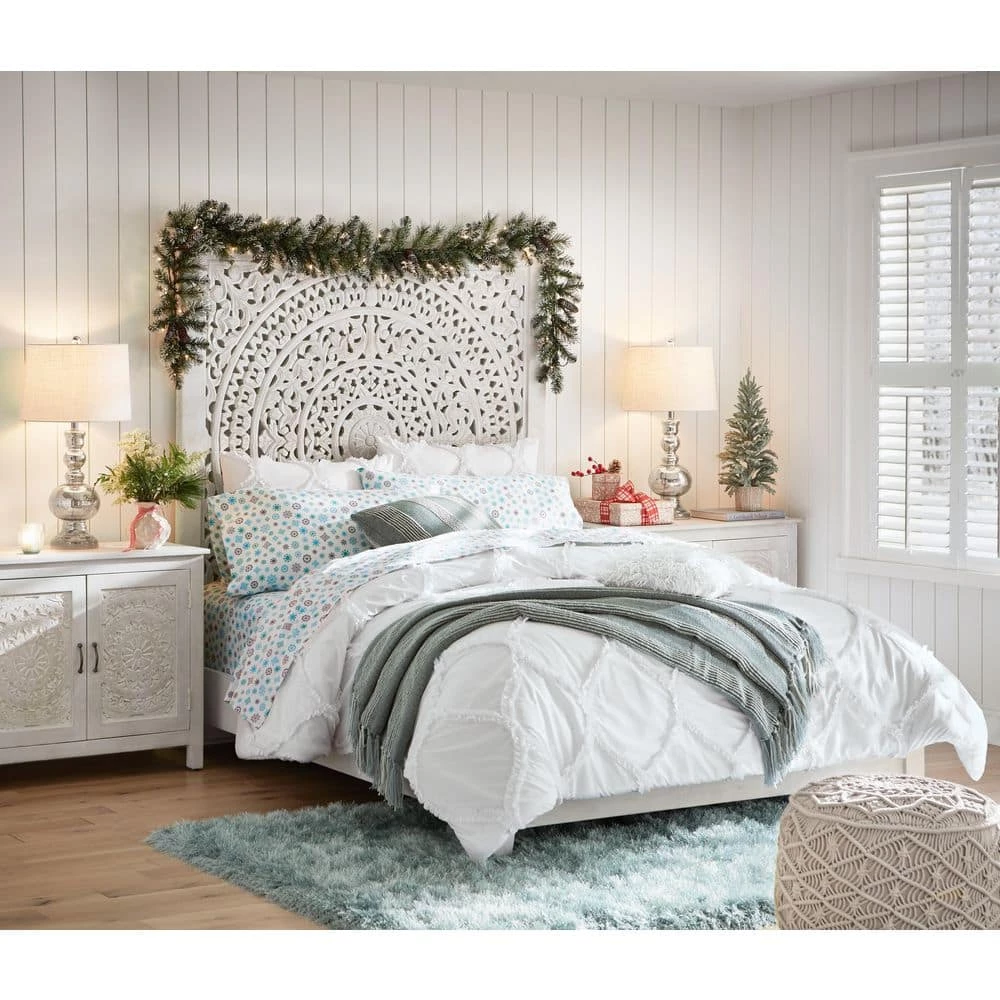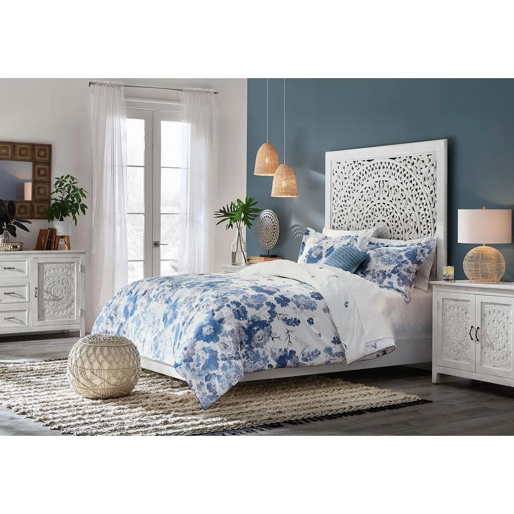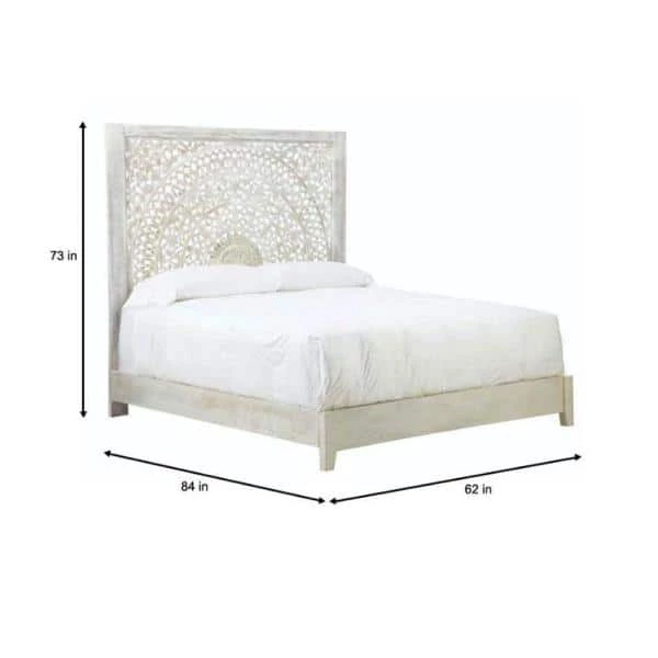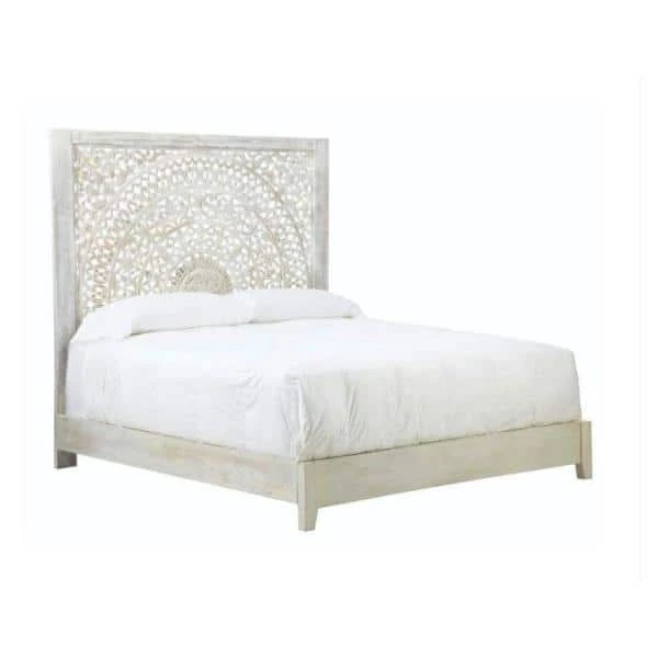 Our Chennai Bed’s elaborately carved headboard makes it the ultimate focal point for your bedroom. This beautiful platform bed is crafted of mango wood in a whitewash finish, adding a touch of cottage style to the world-beat design. Pair this wooden bed with a solid-colored bedspread so as not to distract from the elaborate medallion motif.