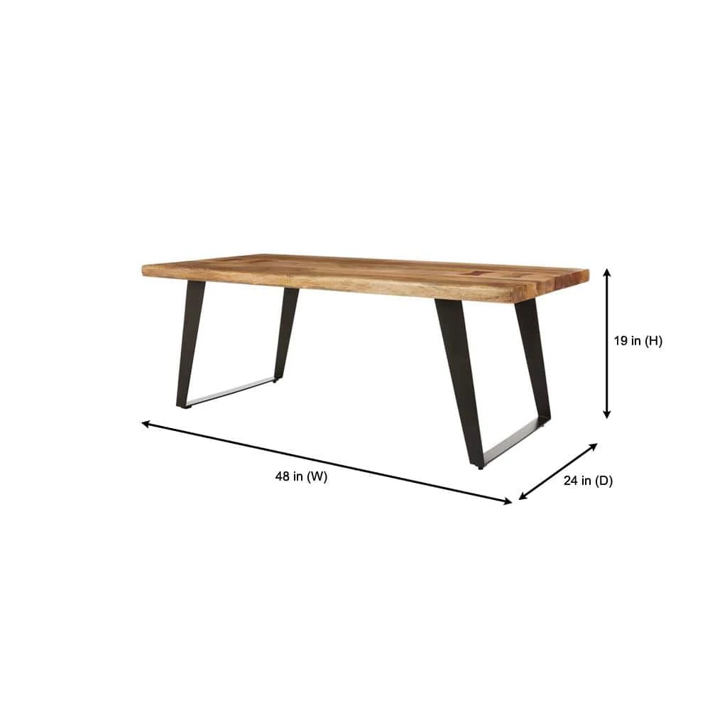 Our Home Decorators Collection Crosbyne coffee table is a blend of modern and organic influences. Its natural mango wood top is finished to appear as if it has live edges. Splayed metal legs counterbalance the rectangular tabletop. The table is a stylish choice for modern, rustic and farmhouse furnished living rooms.