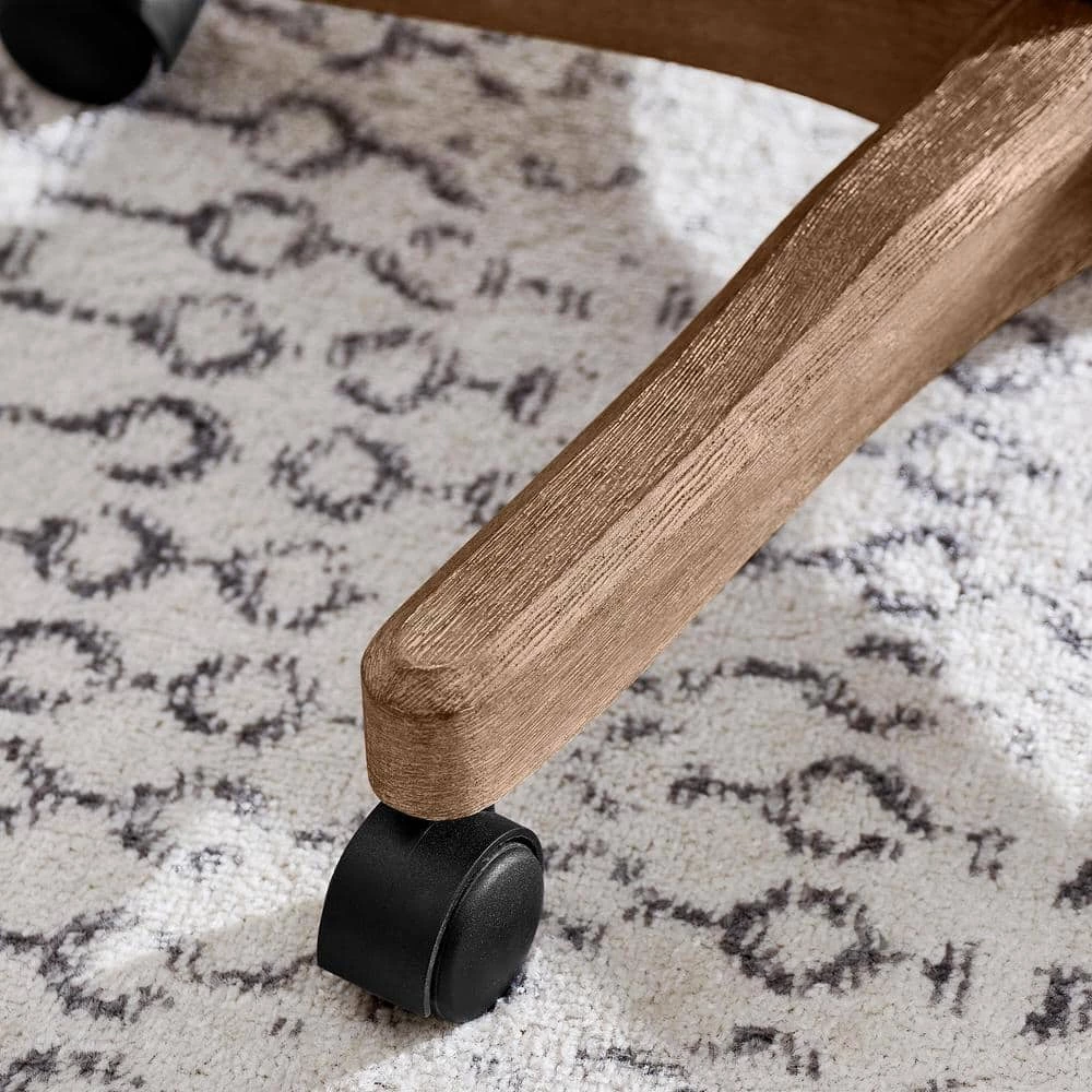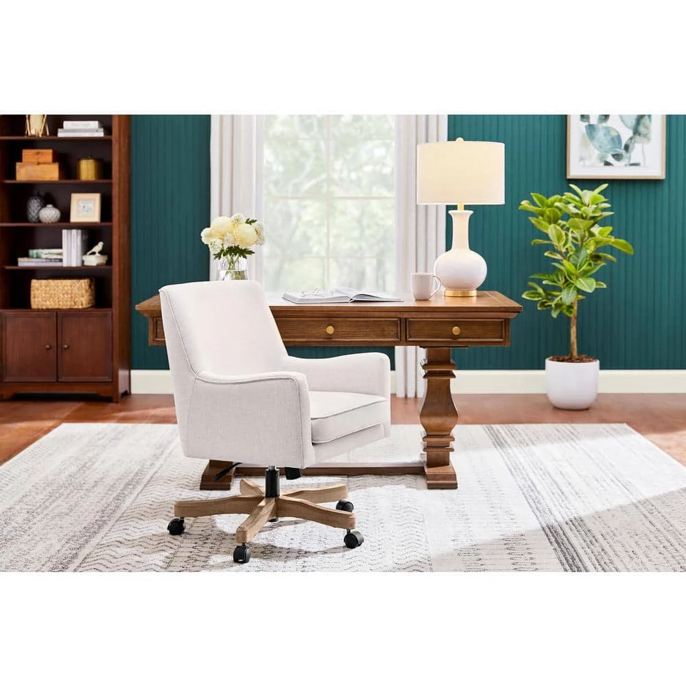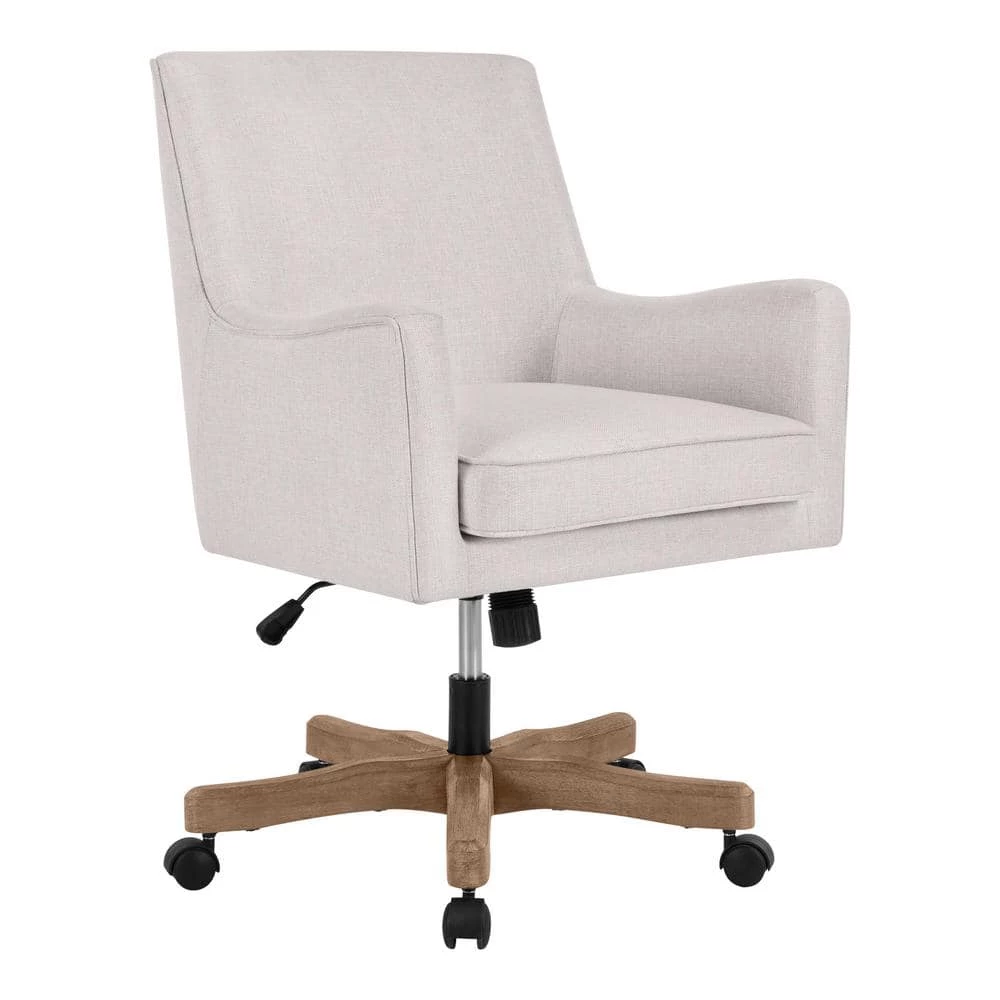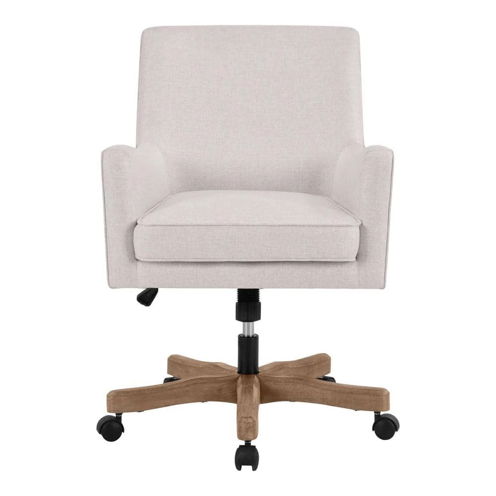 Style your office with the charming Cosgrove Biscuit Fabric Upholstered Office Chair exclusively offered by The Home Decorators Collection. This office chair is covered in a neutral biscuit tan fabric and sits atop a rustic gray-washed wood base with five rolling caster wheels. This chair includes a 360° swivel function and adjustable seat height, making it a versatile fit to your home office set up. The fixed-height arms feature soft padding for ultimate comfort and support. The neutral, biscuit tan upholstery makes this chair a must-have addition for any style room! Don’t forget to add a coordinating desk to complete your home office set up.