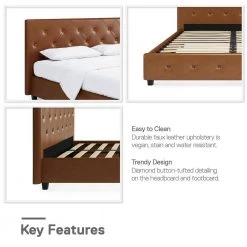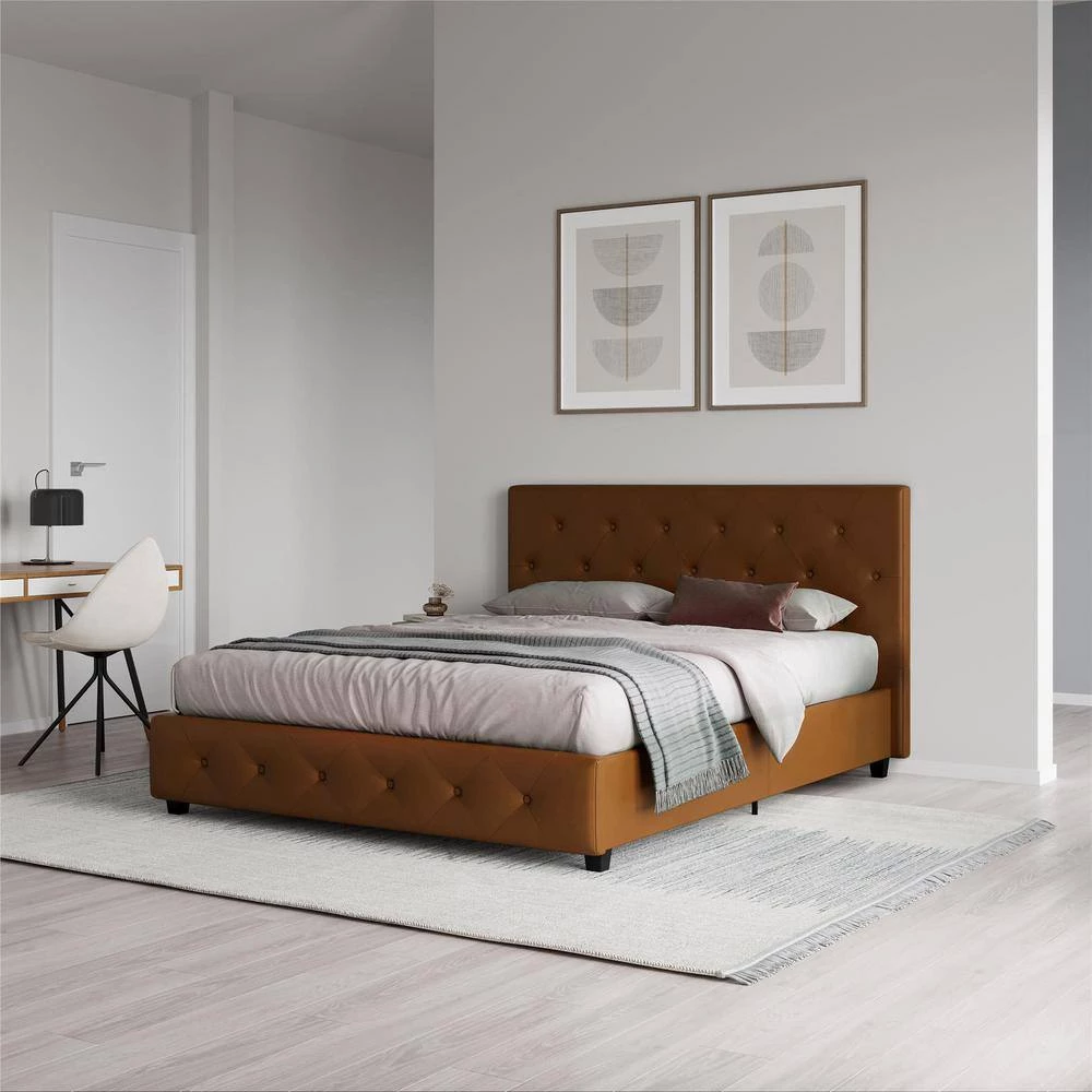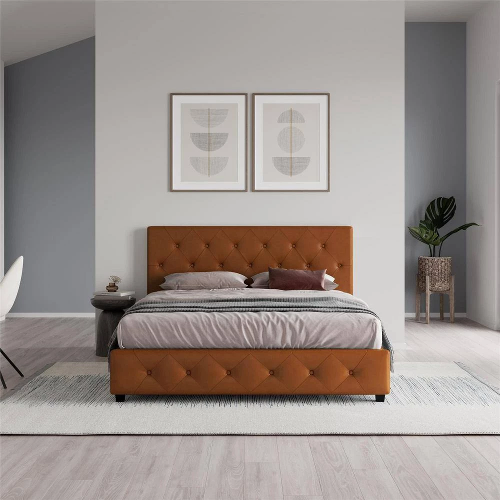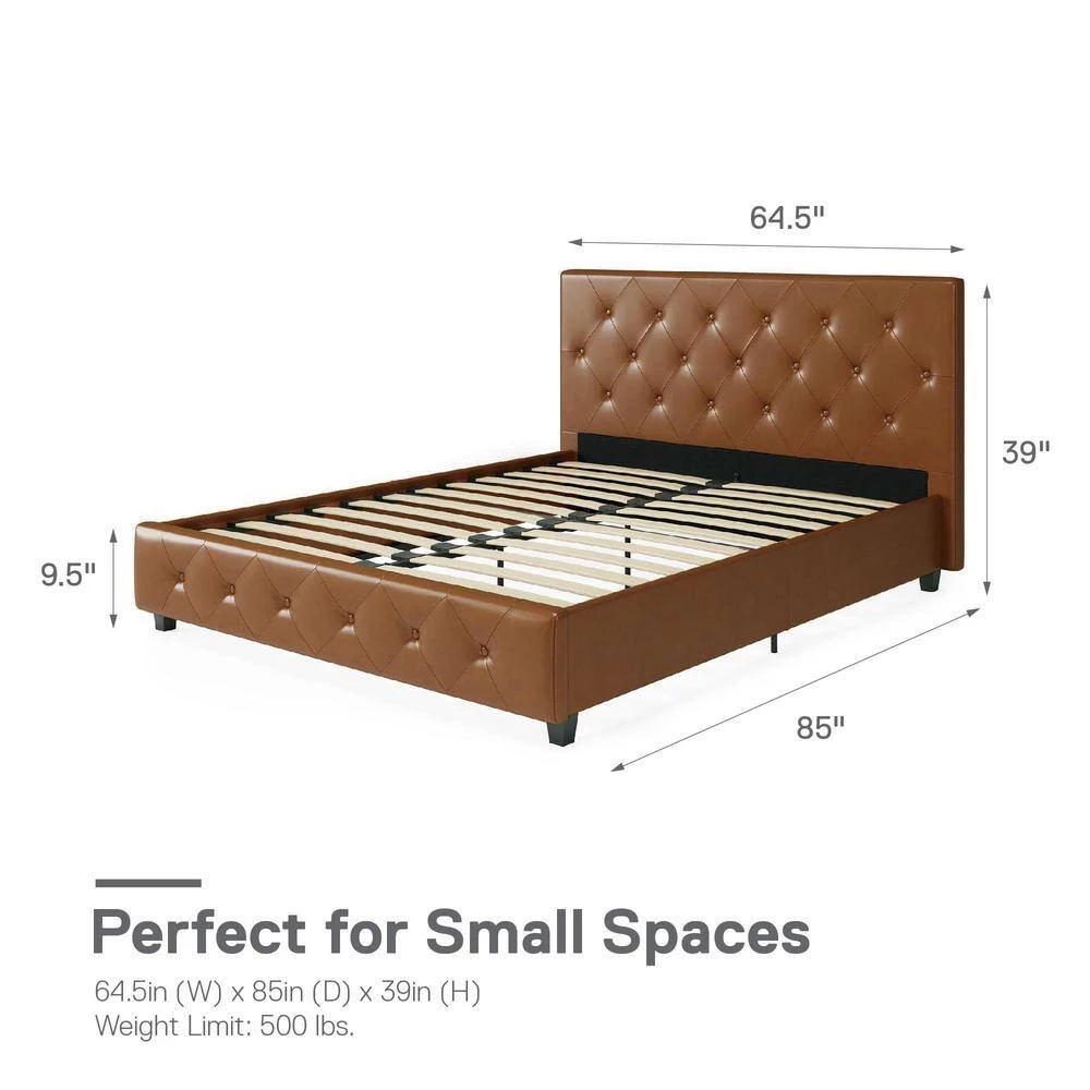 Style up your bedroom with the DHP Dean Upholstered Bed. With an elegant headboard that features diamond button tufted detailing, this bed radiates a contemporary chic look. Upholstered in faux leather with padding for extra comfort, the Dean is designed to infuse style and comfort into your room decor. It is built with solid wooden slats for extra support and does not require a box spring. This exquisite bed will give you the style and luxury you are looking for.