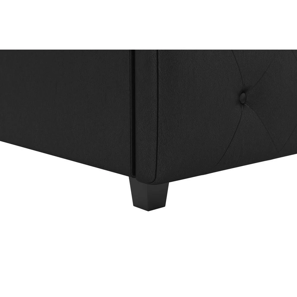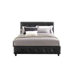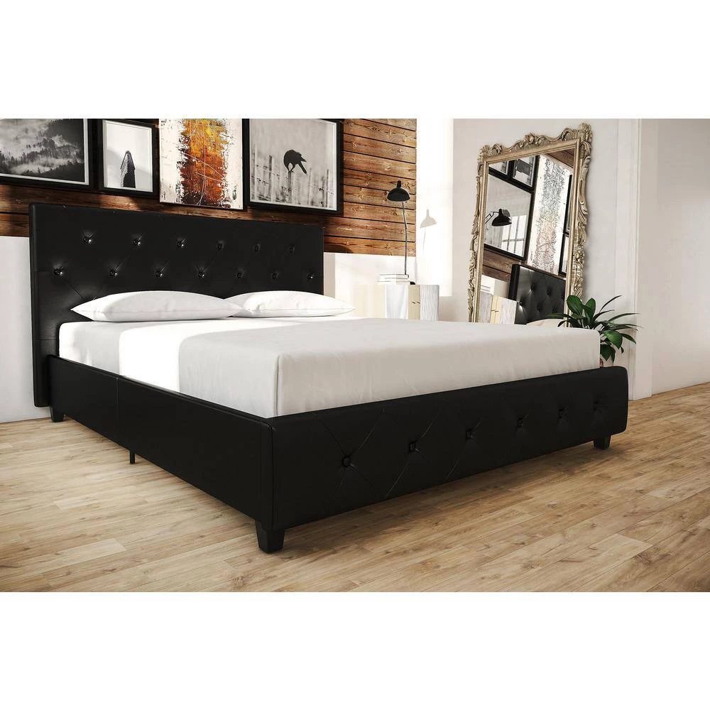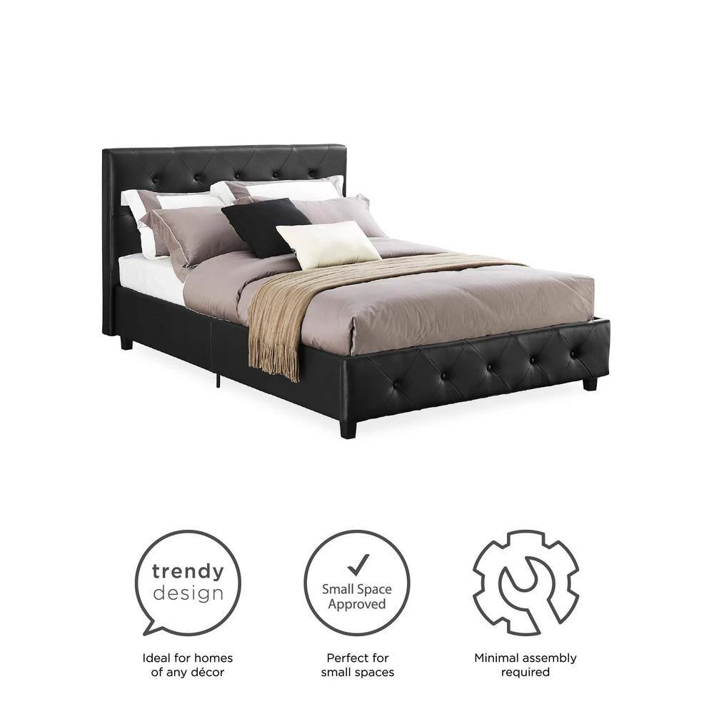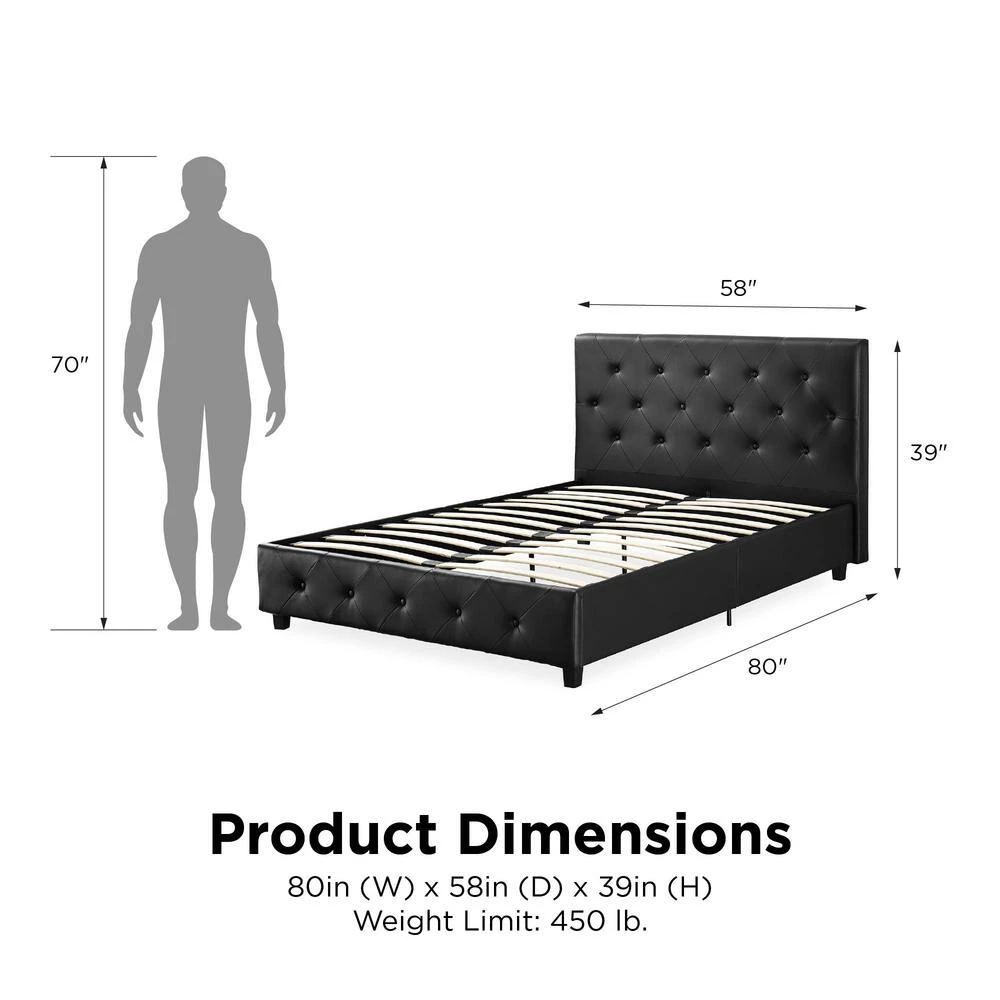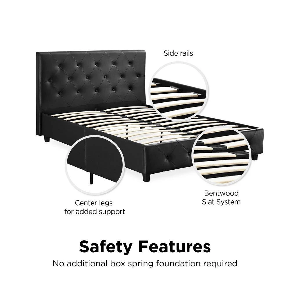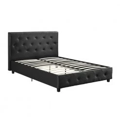 Style up your bedroom with the DHP Dean Black Faux Leather upholstered bed. With an elegant headboard that features diamond button tufted detailing, this bed radiates a contemporary chic look. Upholstered in faux leather with padding for extra comfort, the Dean is designed to infuse style and comfort into your room decor. It is built with solid wooden slats for extra support and does not require a box spring. This exquisite bed will give you the style and luxury you are looking for.