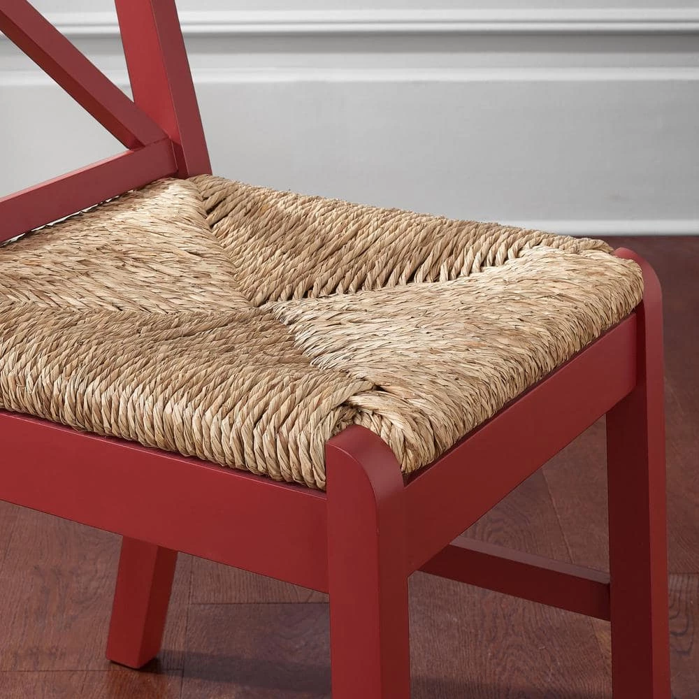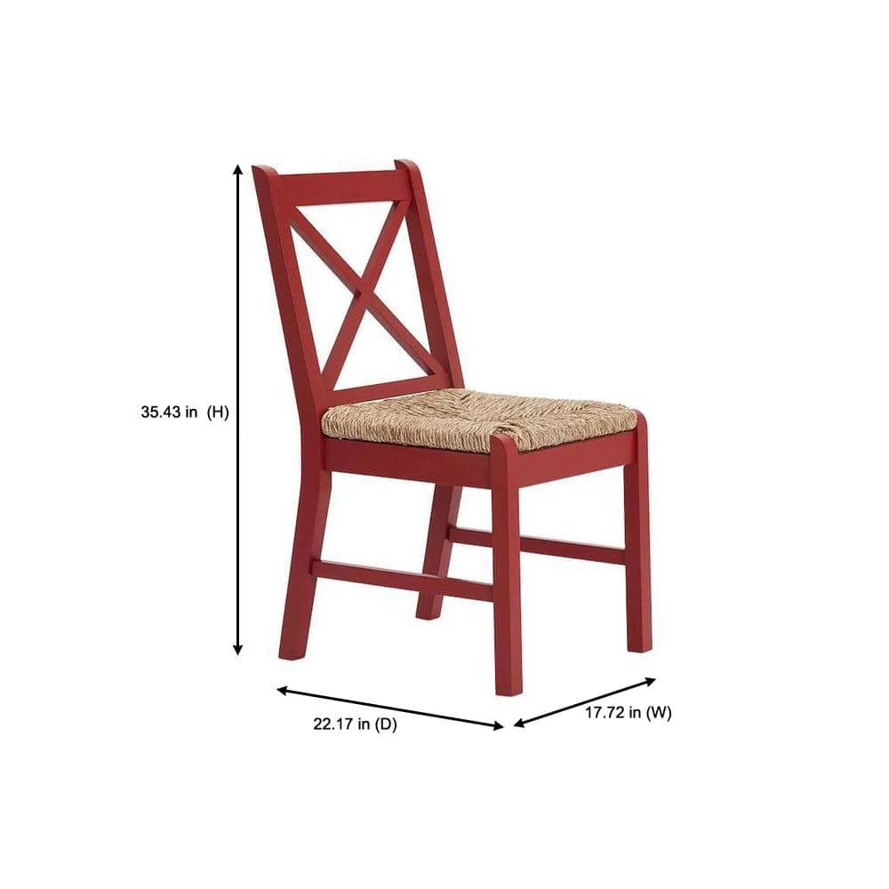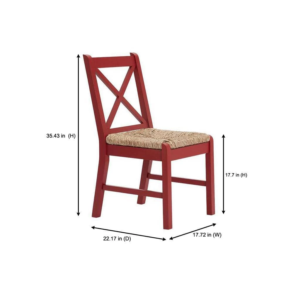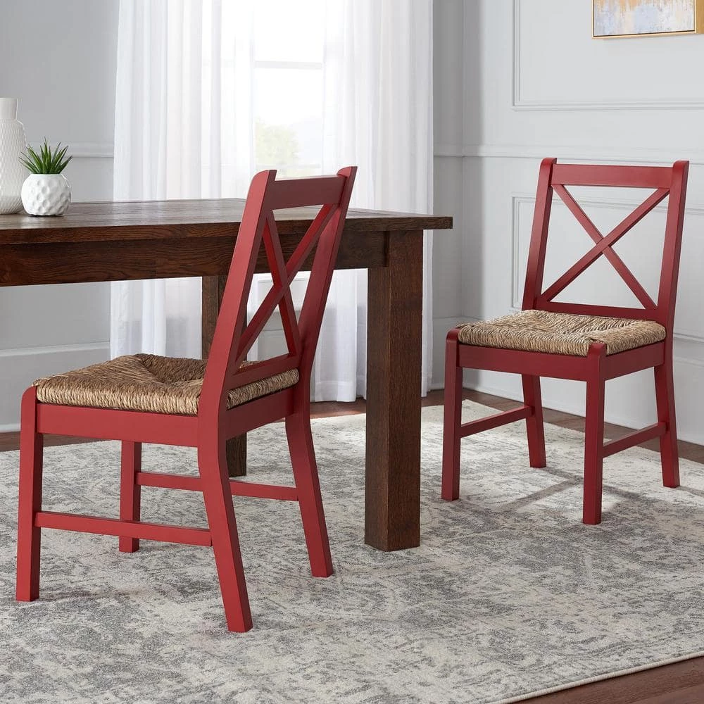 The Home Decorators Collection Dorsey dining chairs are a classic in the making. Modeled on a century-old farmhouse chair, ours have high X-backs and comfortable woven rush seats. The deep red hue refreshes any dining room space in an instant.