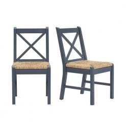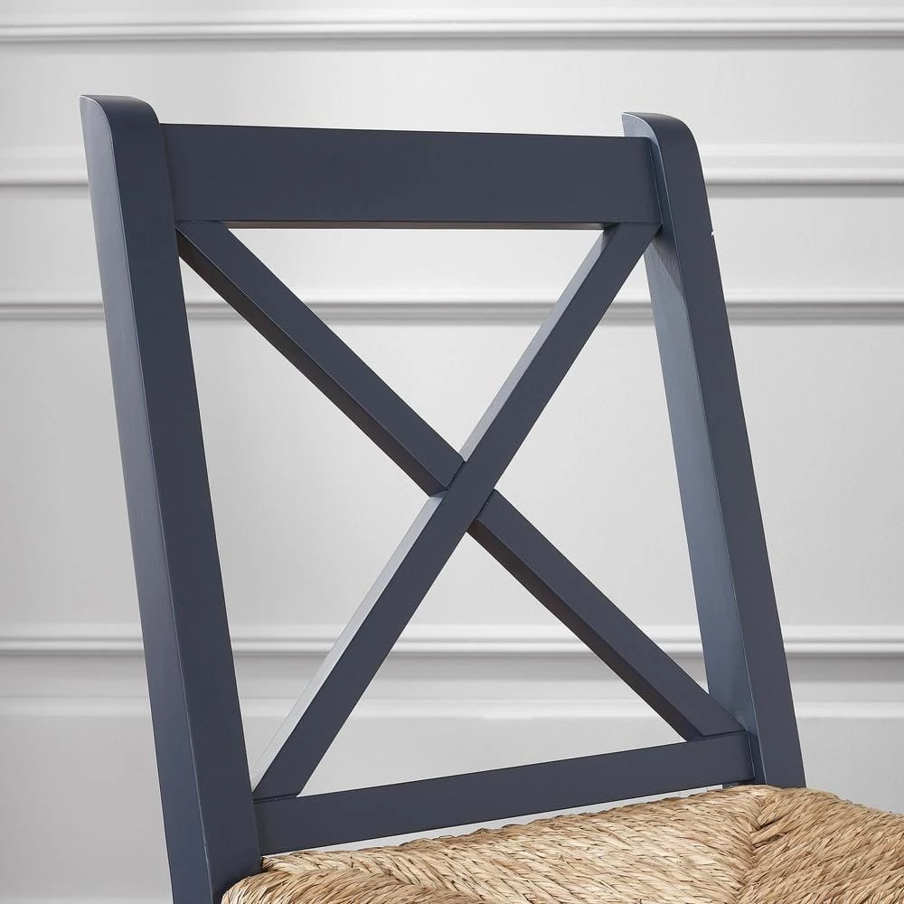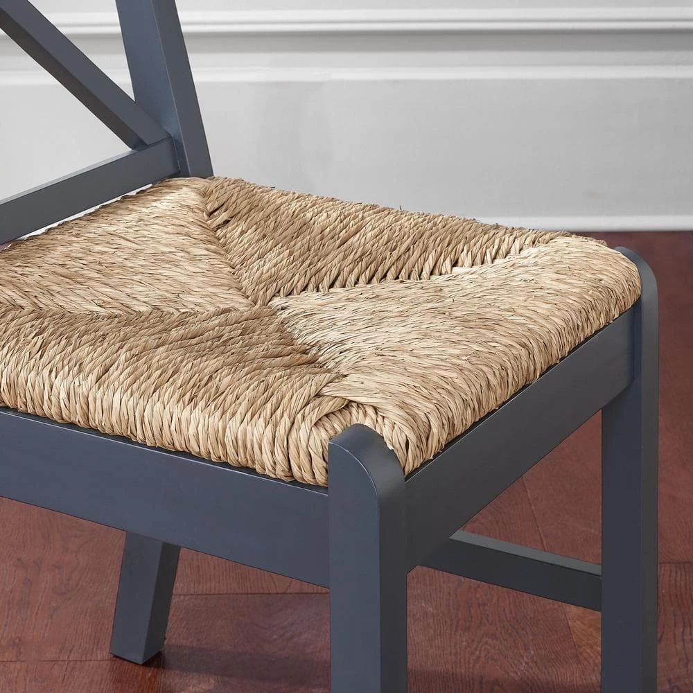 The Home Decorators Collection Dorsey dining chairs are a classic in the making. Modeled on a century-old farmhouse chair, ours have high X-backs and comfortable woven rush seats. The deep blue hue refreshes any dining room space in an instant.