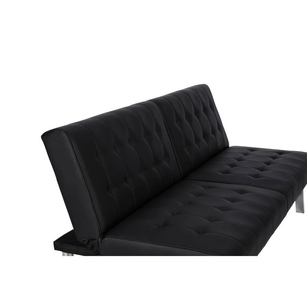 - Modern low profile design futon frame with chrome metal legs and square tufted backrest and seating