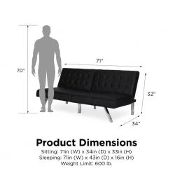 - Futon dimensions: 71″L x 34″W x 32″H. Sleeping dimensions: 71″L x 43″W x 16″H. Weight limit: 600 lb. Shipping dimensions: 45″L x 36″W x 13″H. Net weight: 70.5 lb. Gross weight: 84 lb.