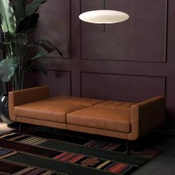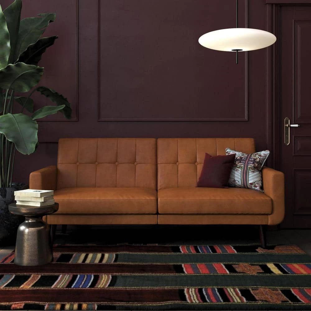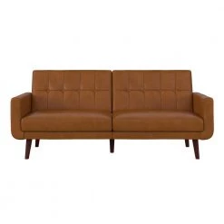 Bringing back the 1950’s in style with the DHP Fay Modern Futon. This unique sofa bed brings a fashionable blend of mid-century and modern style. Designed with boasting bold lines, sturdy tapered wooden legs and a visual appealing faux leather upholstery with a tufted back. The Fay Futon is a multi-functional piece that can be placed in any room – even small living spaces. Its split back design allows you to convert this futon into a lounging or sofa bed position within seconds – suiting all of your needs. This clever mechanism allows you to accommodate up to two guests – eliminating the need for a guest bedroom. The sturdy wooden features wide track arms that provide optimal comfort for you and your guests to enjoy. Can support up to 600lb in maximum weight and ships in one box. Little assembly requires make this furniture setup easy and fast. To complete the look of your room, pair this futon with the matching Fay Chair – guaranteeing to bring a stylish look into your home.