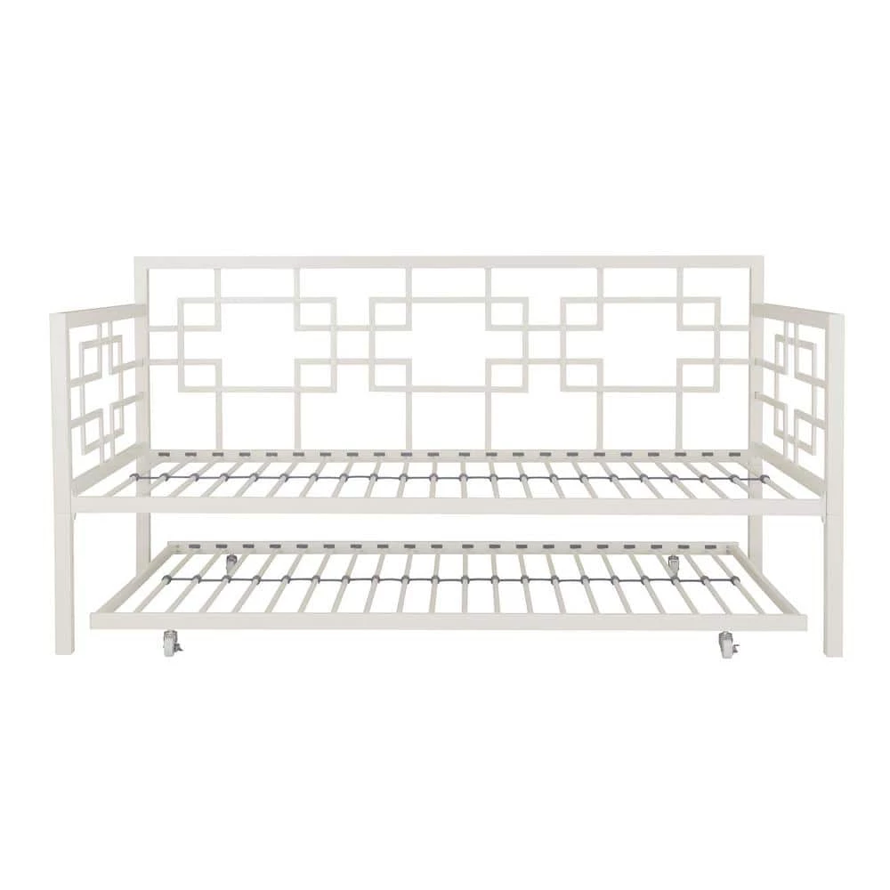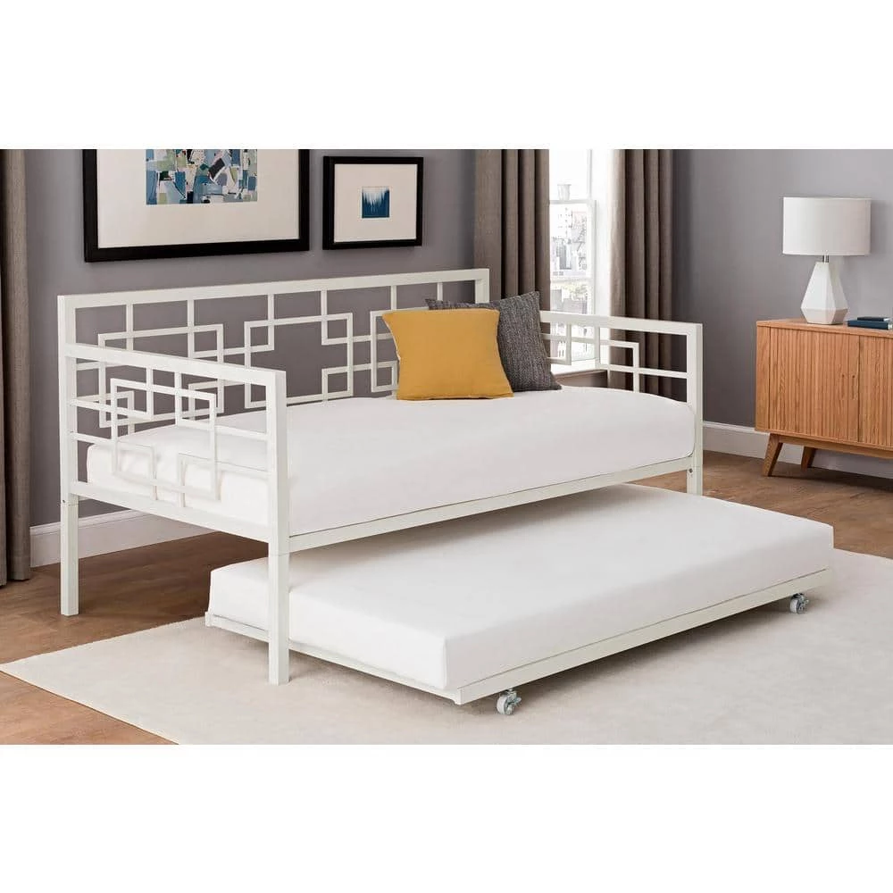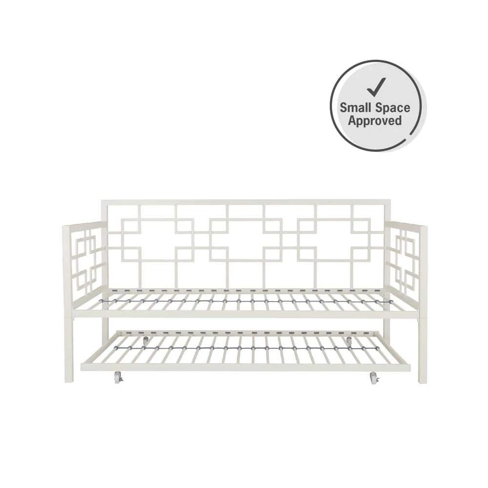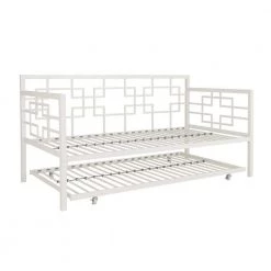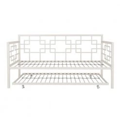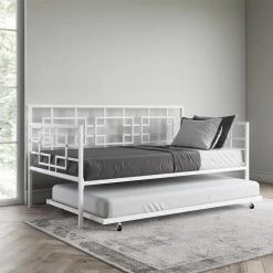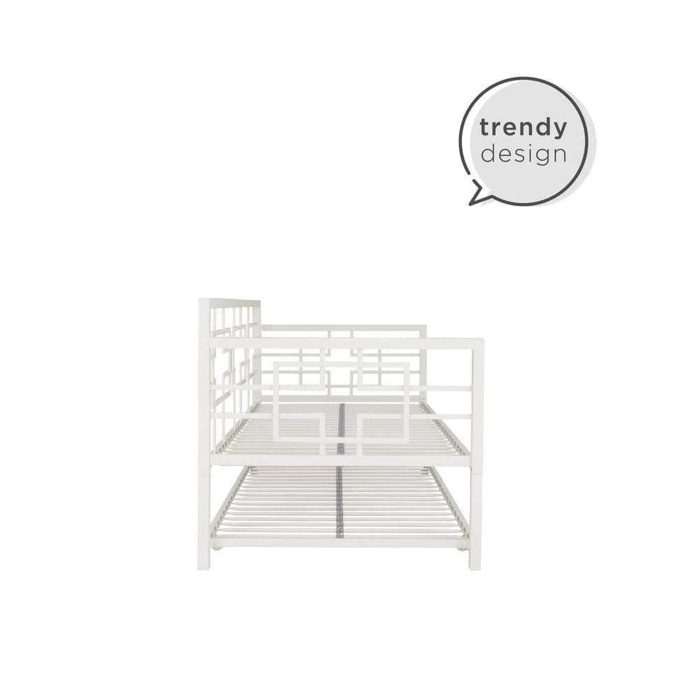 Space-saving and stylish define the DHP Giada Twin Daybed with Trundle. This sturdy metal bed frame is designed to add a modern luxury charm to any bedroom with its clean and sleek silhouette. Neatly tucked away under the daybed is a trundle that offers ultimate in-space functionality. The trundle comes with caster wheels that lock in place and can be rolled in and out easily when required. Designed to accommodate two twin mattresses (sold separately), both bed bases are equipped with secured metal slats that provide ample support and allow for air circulation for the mattress. Enjoy the daybed as a lounging area by day and a comfy bed by night. Available in multiple colors, choose the DHP Giada Twin Daybed with Trundle that matches your home and style!