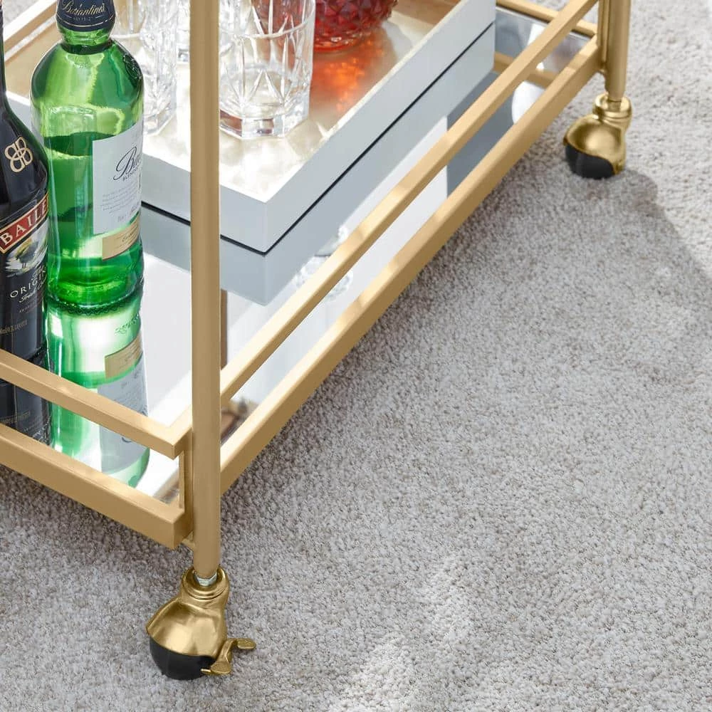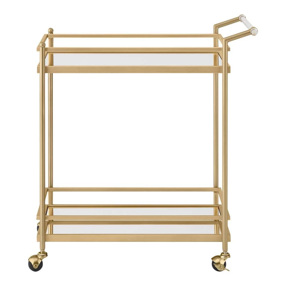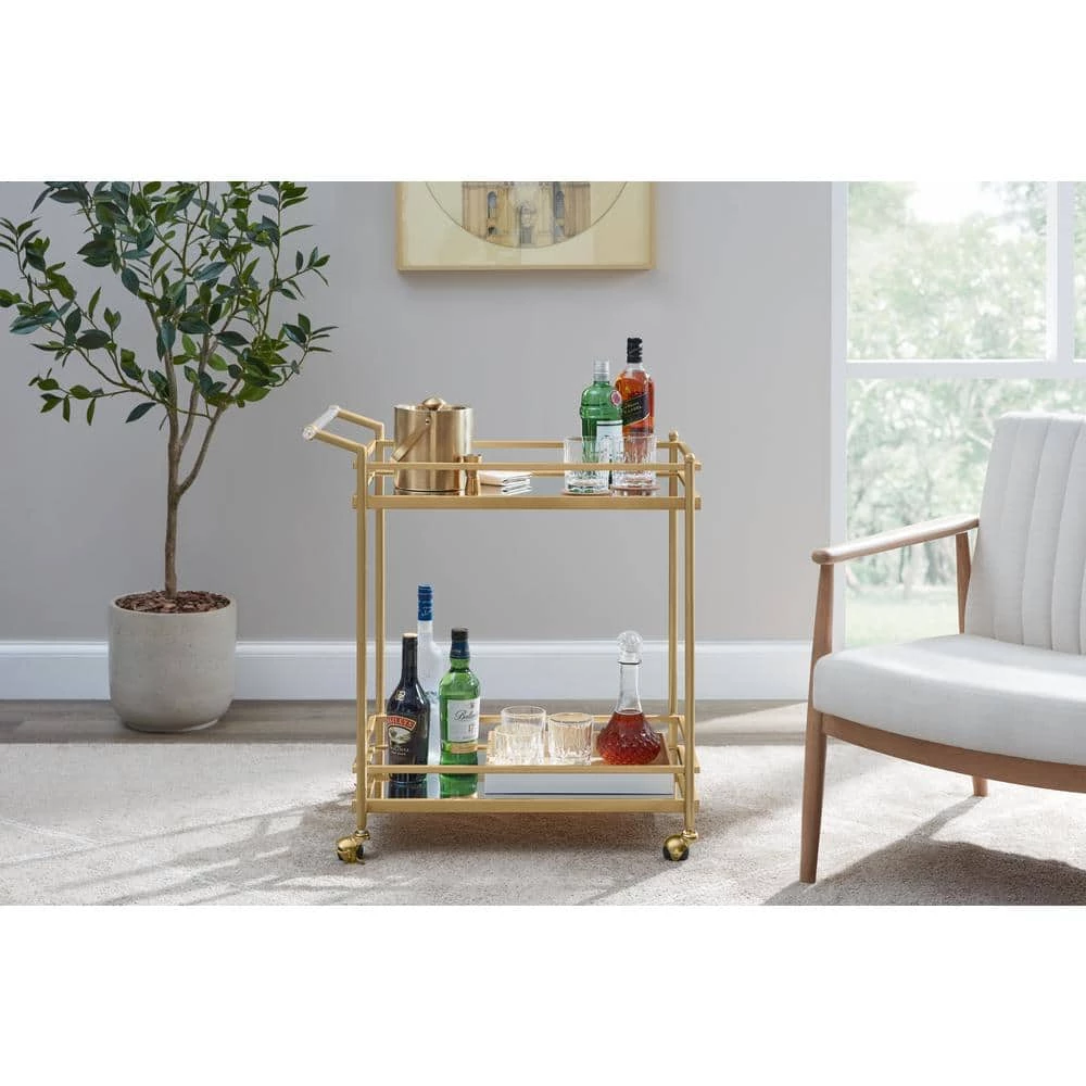 Take the party wherever you want with the Gold Metal Bar Cart with Mirrored Glass Shelves exclusively offered by the Home Decorators Collection. This cart exudes a modern, glamorous style with its gold metal construction and two mirrored shelves that add stunning dimension to your finest barware. With lockable rolling casters, easily move this bar cart between rooms when entertaining guests. This stylish cart is versatile and will make the perfect addition to any dining room, living room, kitchen, or office in need of additional chic storage.