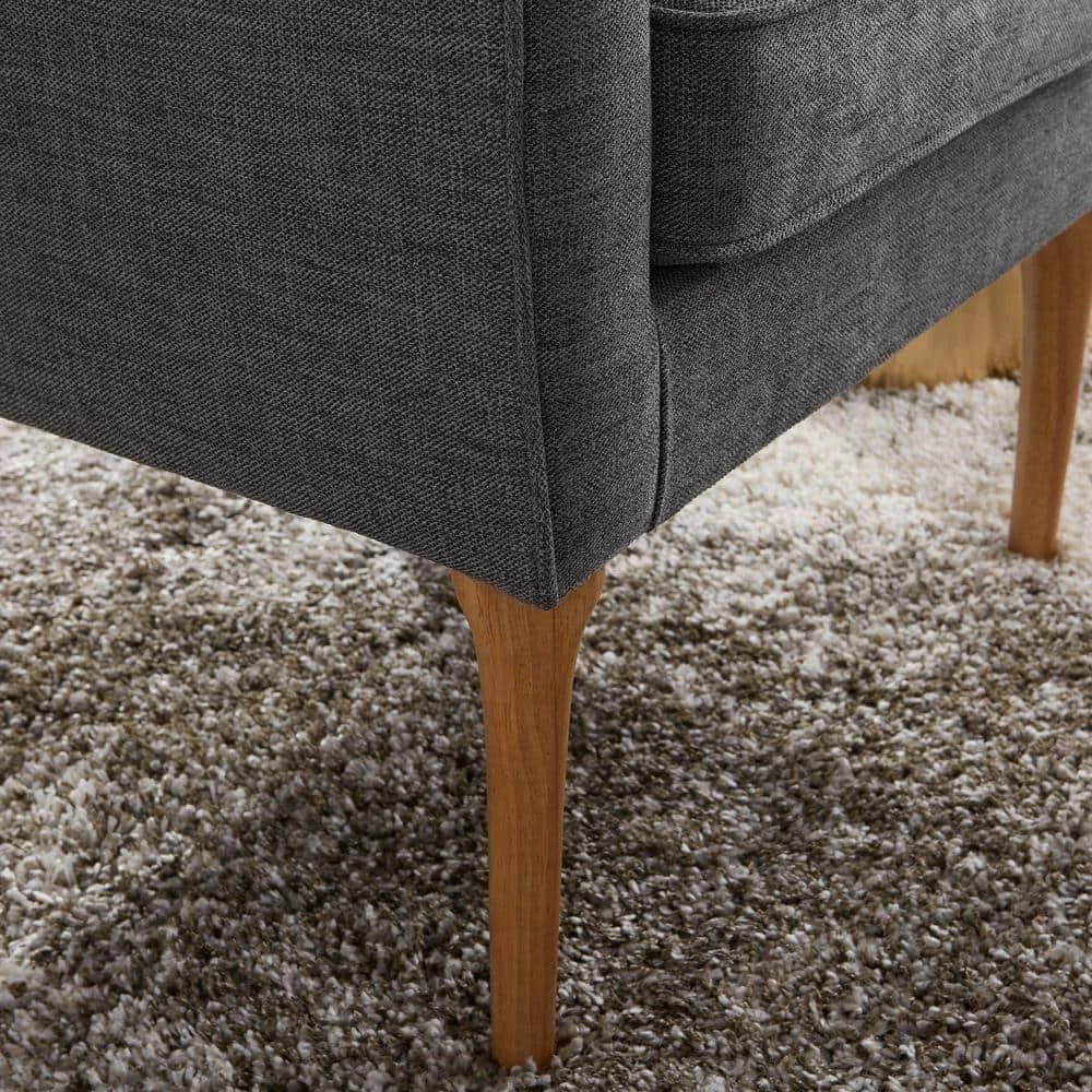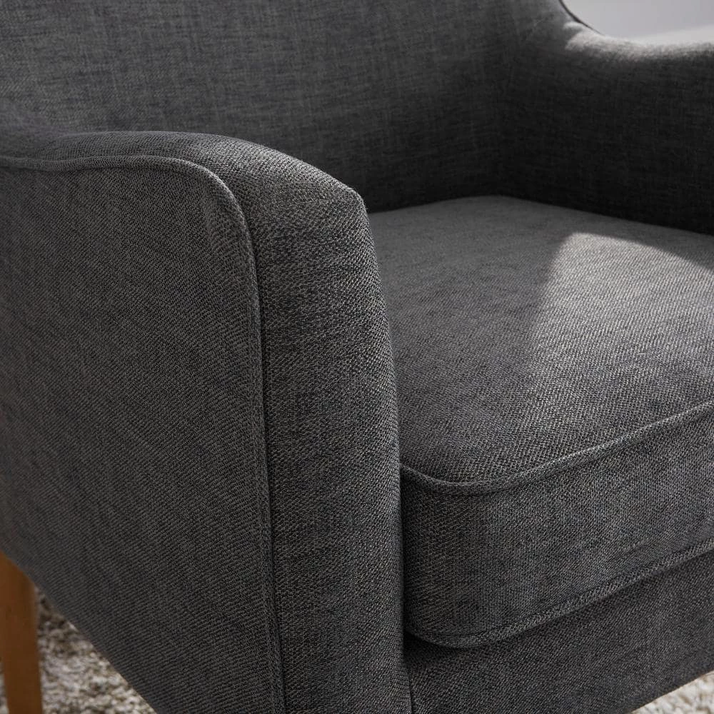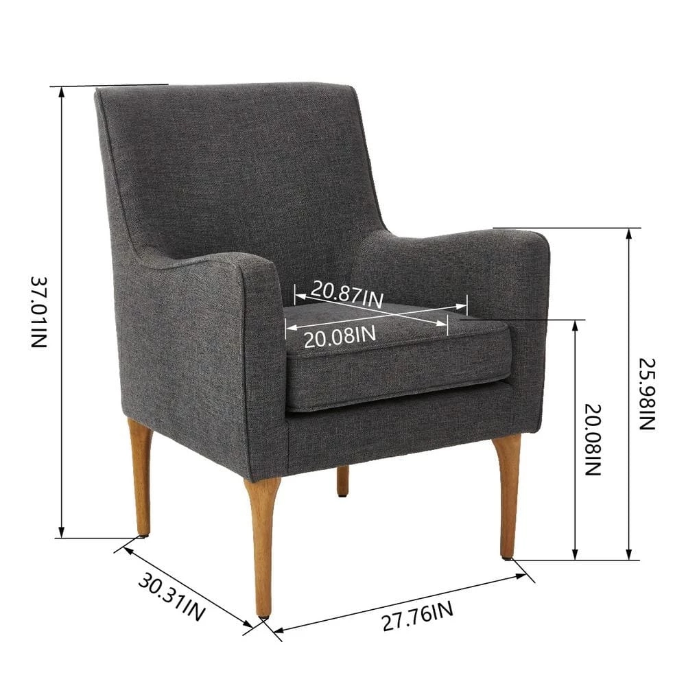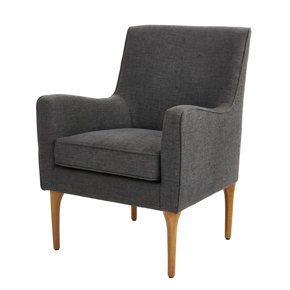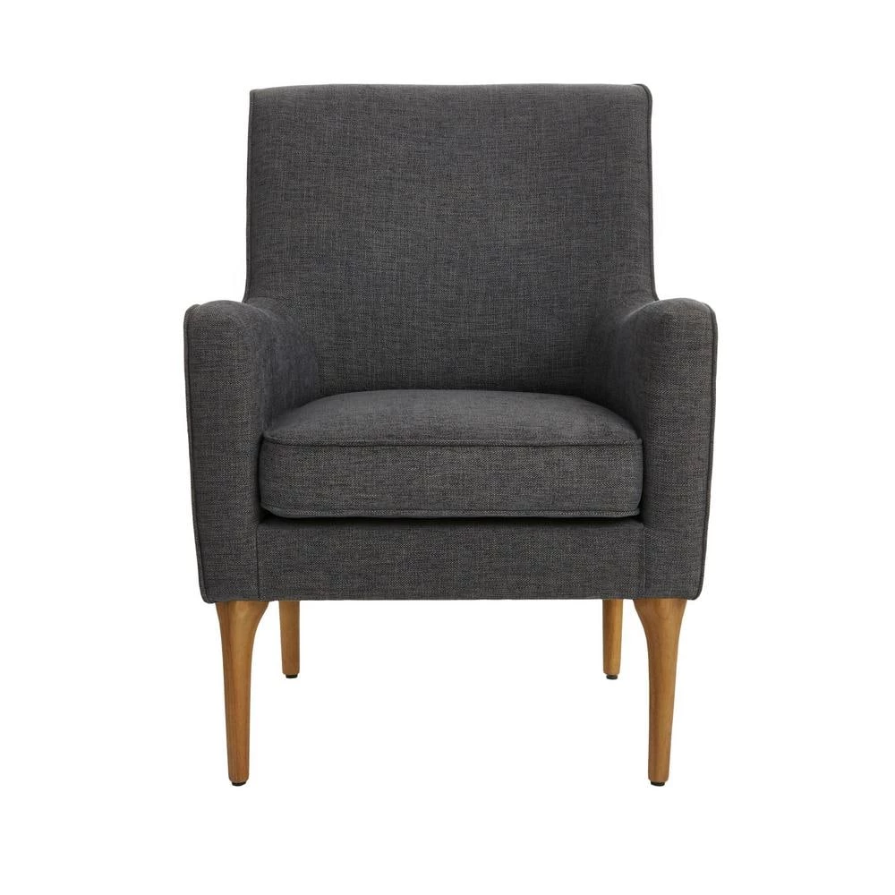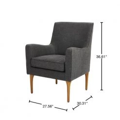 Showcase a vintage-inspired look in your living room or den with this HDC Greenlee upholstered armchair. Solid wood construction delivers lasting use in your seating area, while the high back and square arms provide added comfort and support. The Solartex upholstery boasts a charcoal gray color to coordinate beautifully with a range of furnishings. A light patina wood finish gives the spindle legs a touch of mid-century modern charm. With a simple silhouette, this HDC Grenlee upholstered armchair pairs perfectly with a side table or sofa set.