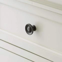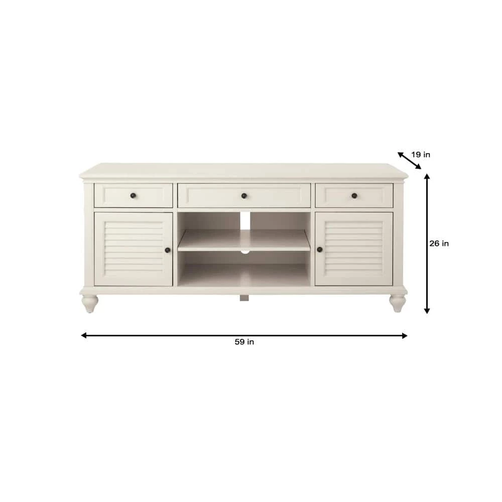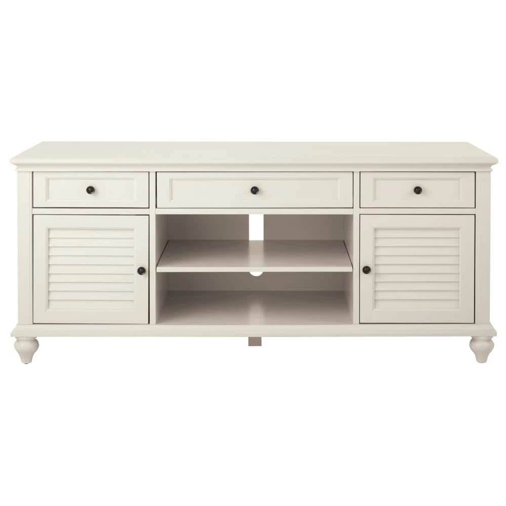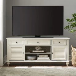 With 3-drawers and 6-shelves, our Hamilton TV Stand definitely isn’t running low on storage space. Smaller items like remotes can be placed in the top drawers, and the shelves are perfect for your movie collection. Convenient cord access also makes it easy to set up your cable box or DVD player. Louvered details give this entertainment center a chic look that will complement any traditional or cottage-style living room.