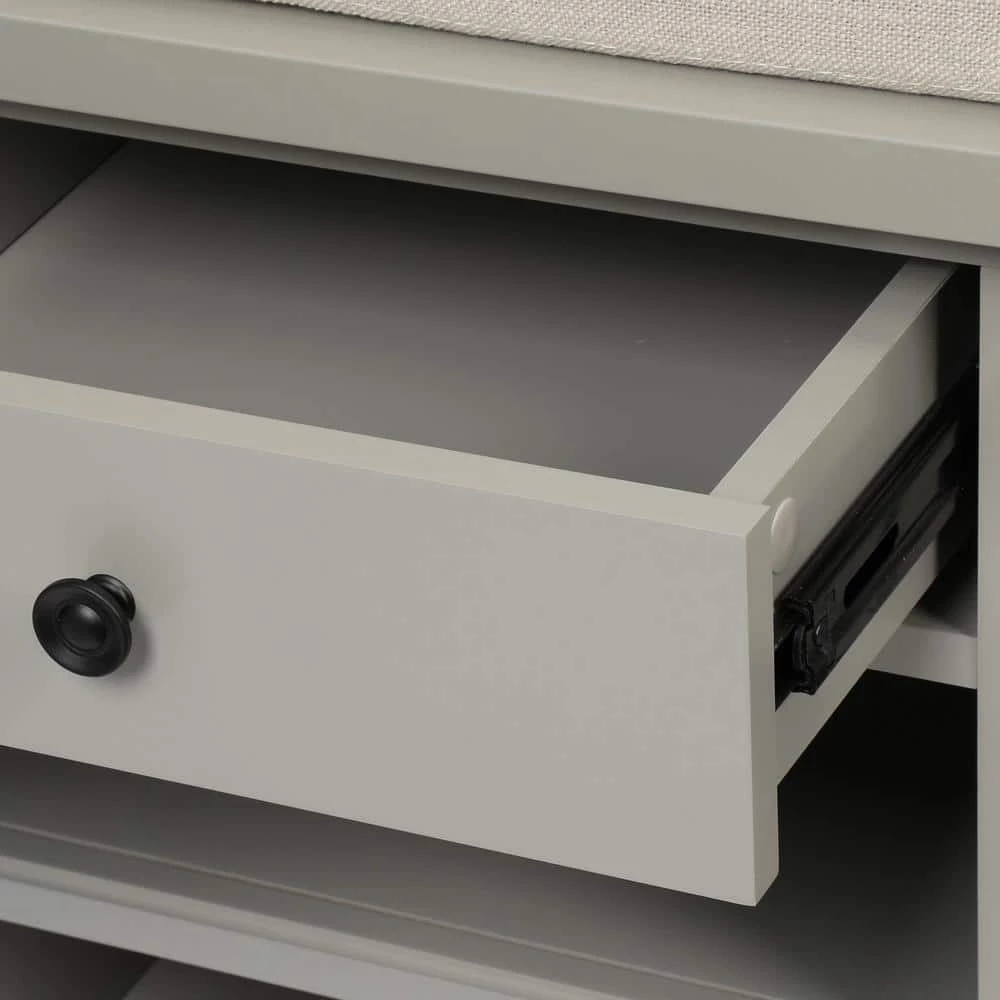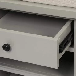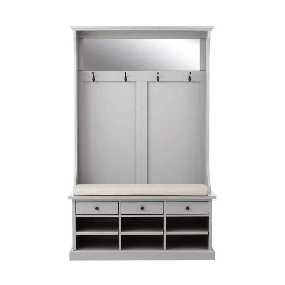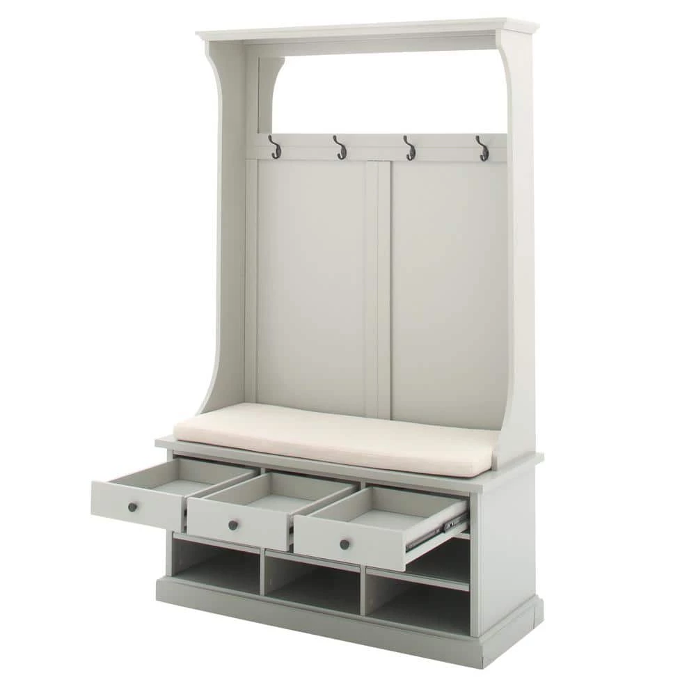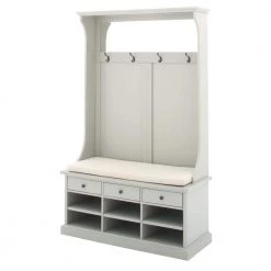 The Hampton Hall Tree adds so much storage that your entryway may begin to feel like a whole new space. Four sturdy double hooks catch scarves, backpacks, dog leashes, caps and more while your shoes find a home in the six cubbies of this mudroom storage bench. Three handy drawers hold socks, shoe horns and sundry mudroom items. This hall tree bench includes a seat cushion to make wearing and taking off footwear more comfortable. The wide mirror above is both functional and decorative.