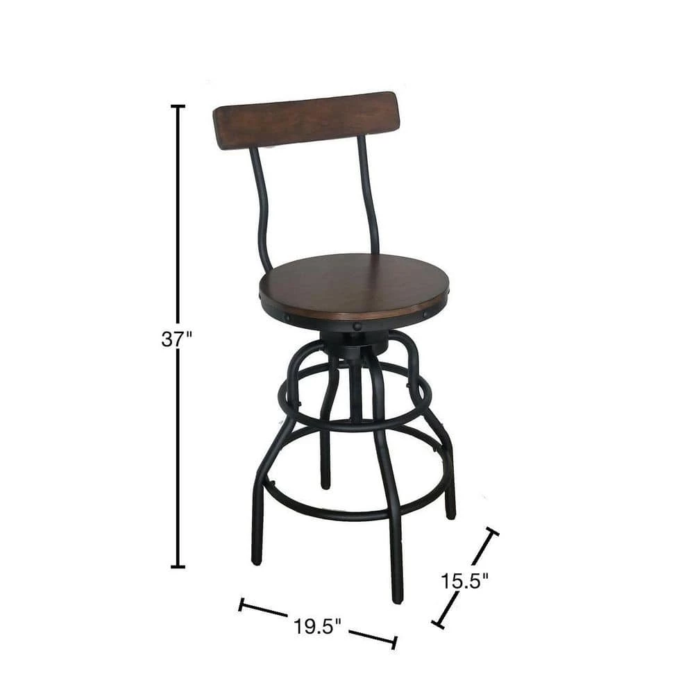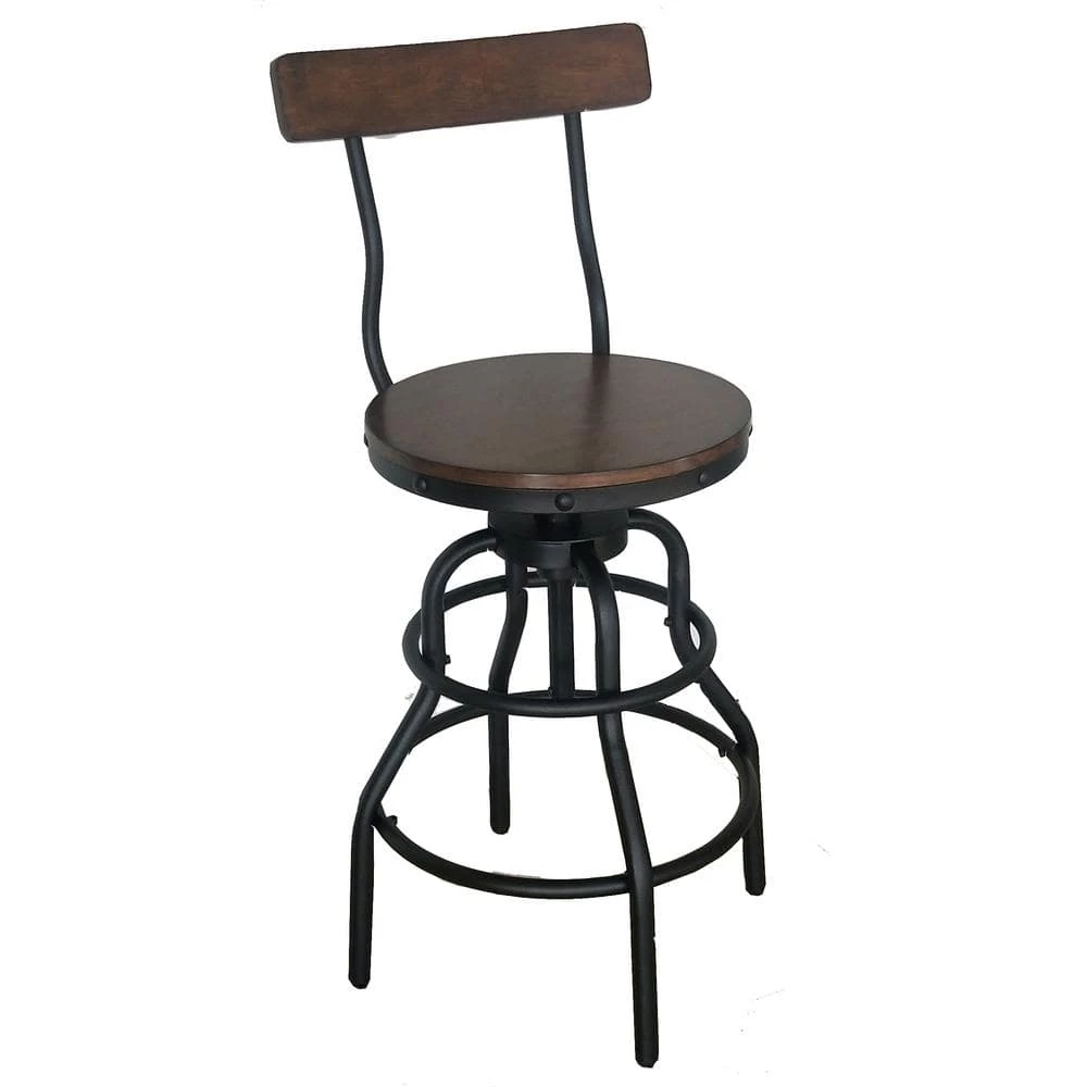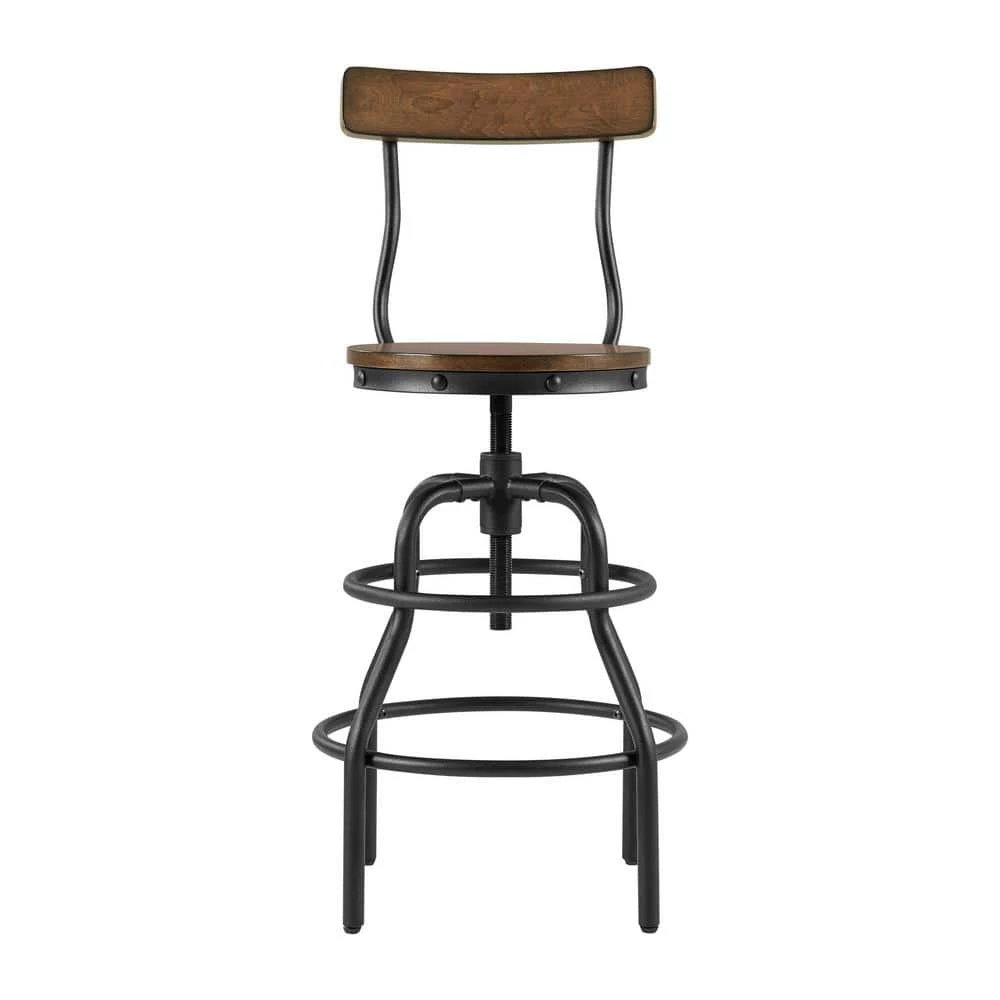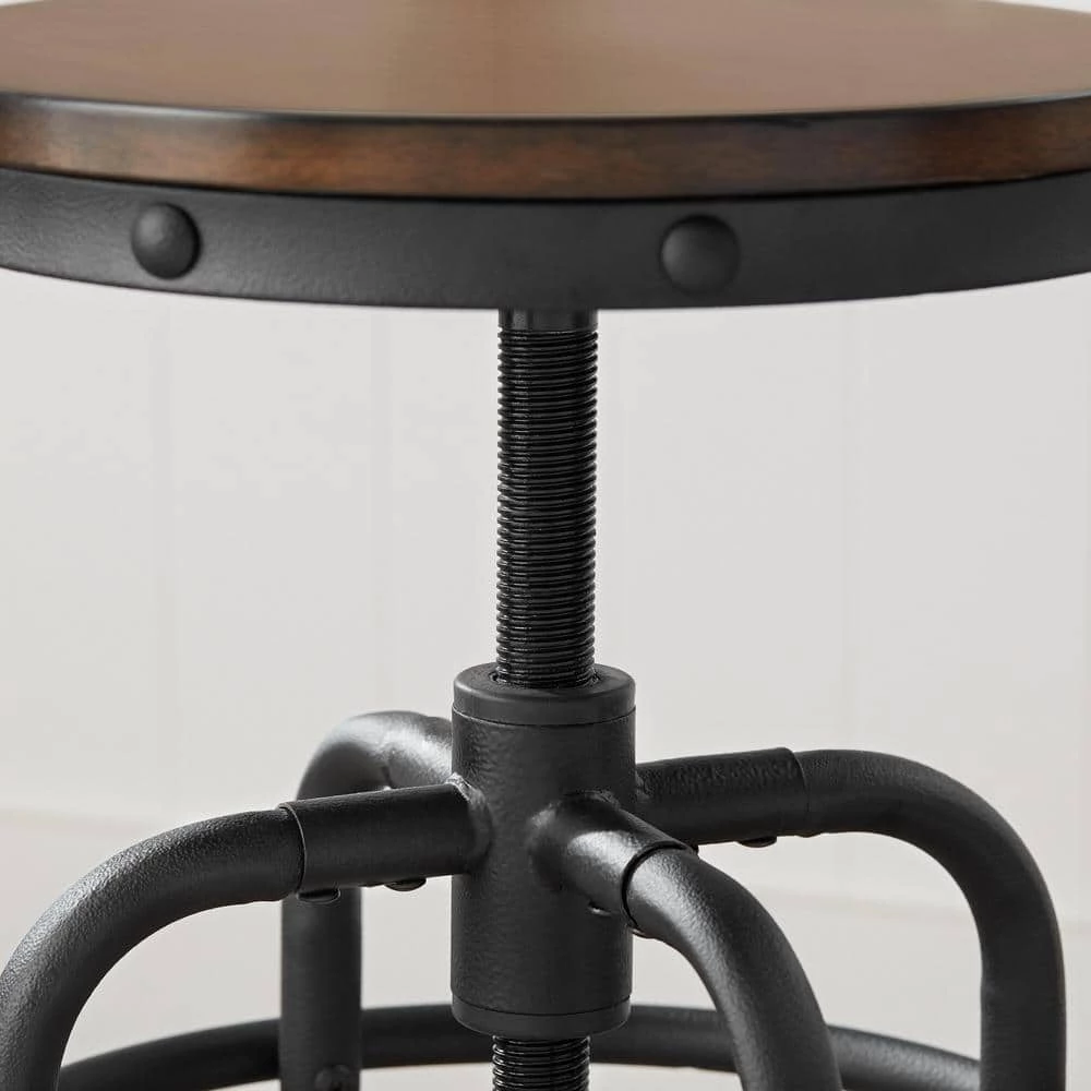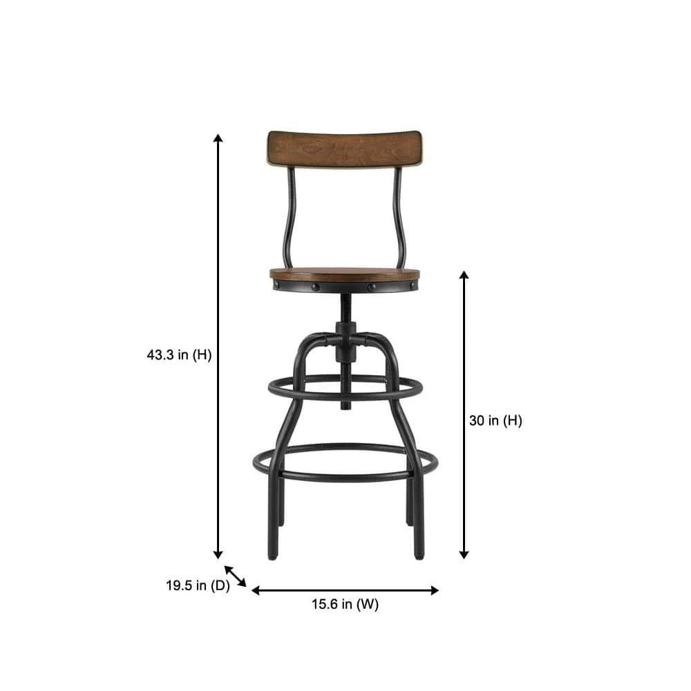 The Home Decorators Collection Industrial Hamrick Stool is durably crafted of iron with an adjustable seat height of 24 in. to 30 in. The wood seat, in a rich brown finish, features a swivel motion for added convenience of raising the stool to your desired height. The subtle curve of the twin back braces echo the curves of the sturdy base. The seat back is also curved to support your back comfortably. This striking stool design is the perfect industrial addition to your home office, bar or kitchen.