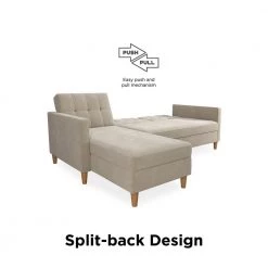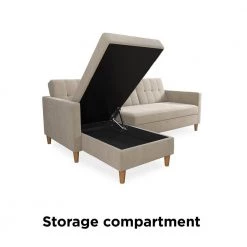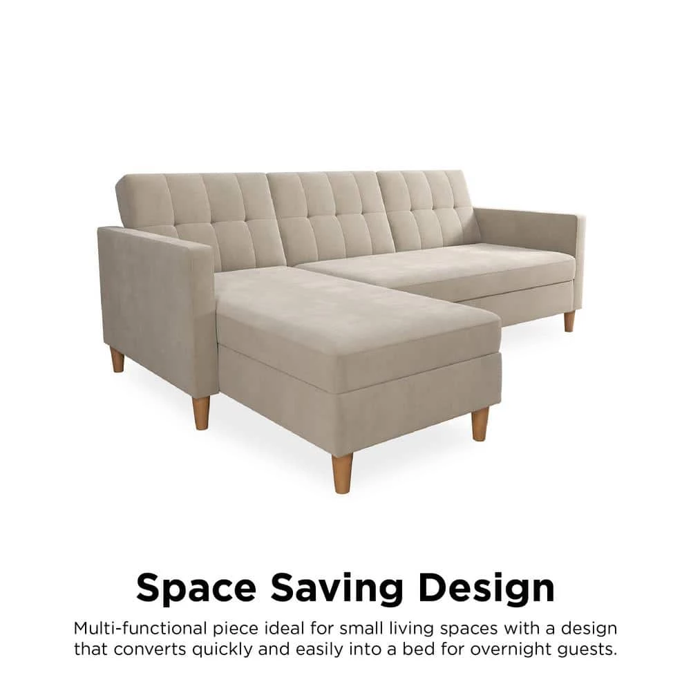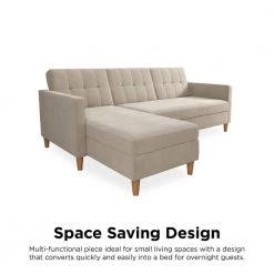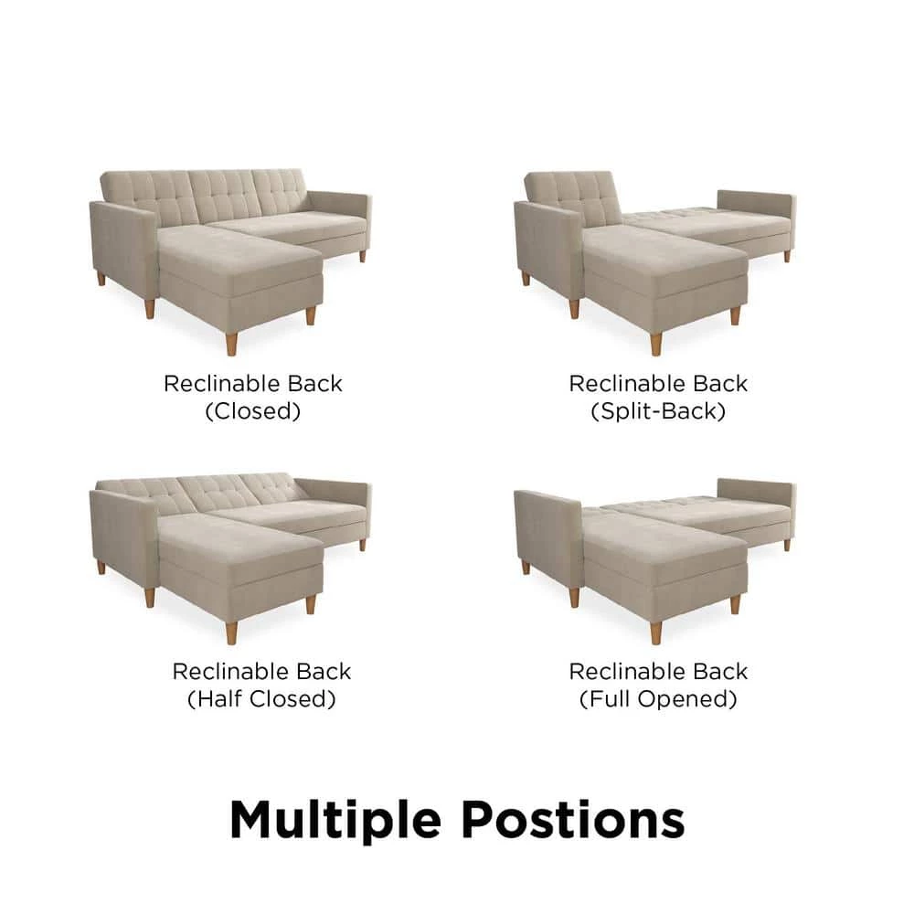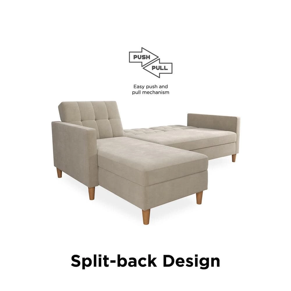 Unwind and relax on our DHP Hanna Storage Futon/Sectional. This contemporary sectional will nicely compliment your living room with its clean and relaxed look. The chaise is interchangeable, allowing you to choose from whichever side looks and fits best for your home. Designed with an innovative click-clack feature, convert your sofa into a lounger or bed within seconds. Whether you’re watching television, lounging around or in need of an extra sleep space – this futon sectional is guaranteed to satisfy all of your needs. But wait, there’s more. Keep the clutter contained with the extra storage compartment in your chaise – ideal for organizing your pillows and blankets. Founded on a sturdy frame, we guarantee optimal stability and durability, up to 600 lb. Easy to assemble and clean, our sectional is available in various colors including Tan Chenille, Light Grey Chenille, Blue Chenille, Grey Chenille and Black Faux Leather. With premium quality and comfort, you can’t go wrong with our DHP Hanna Storage Futon/Sectional.