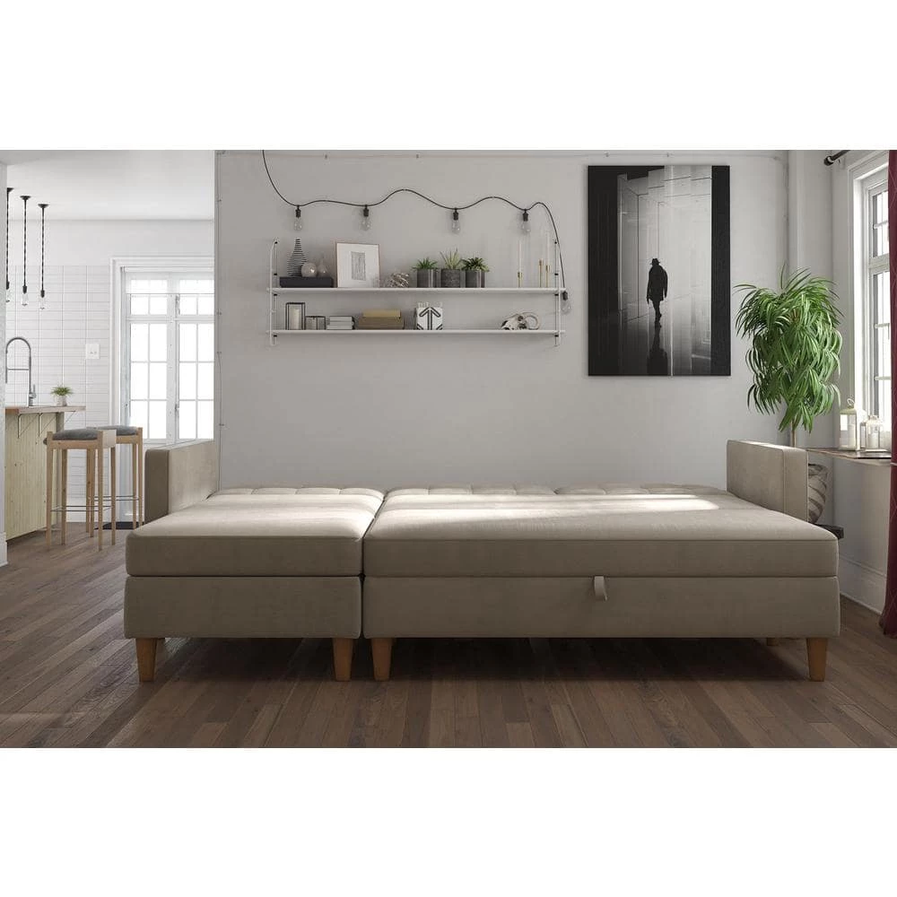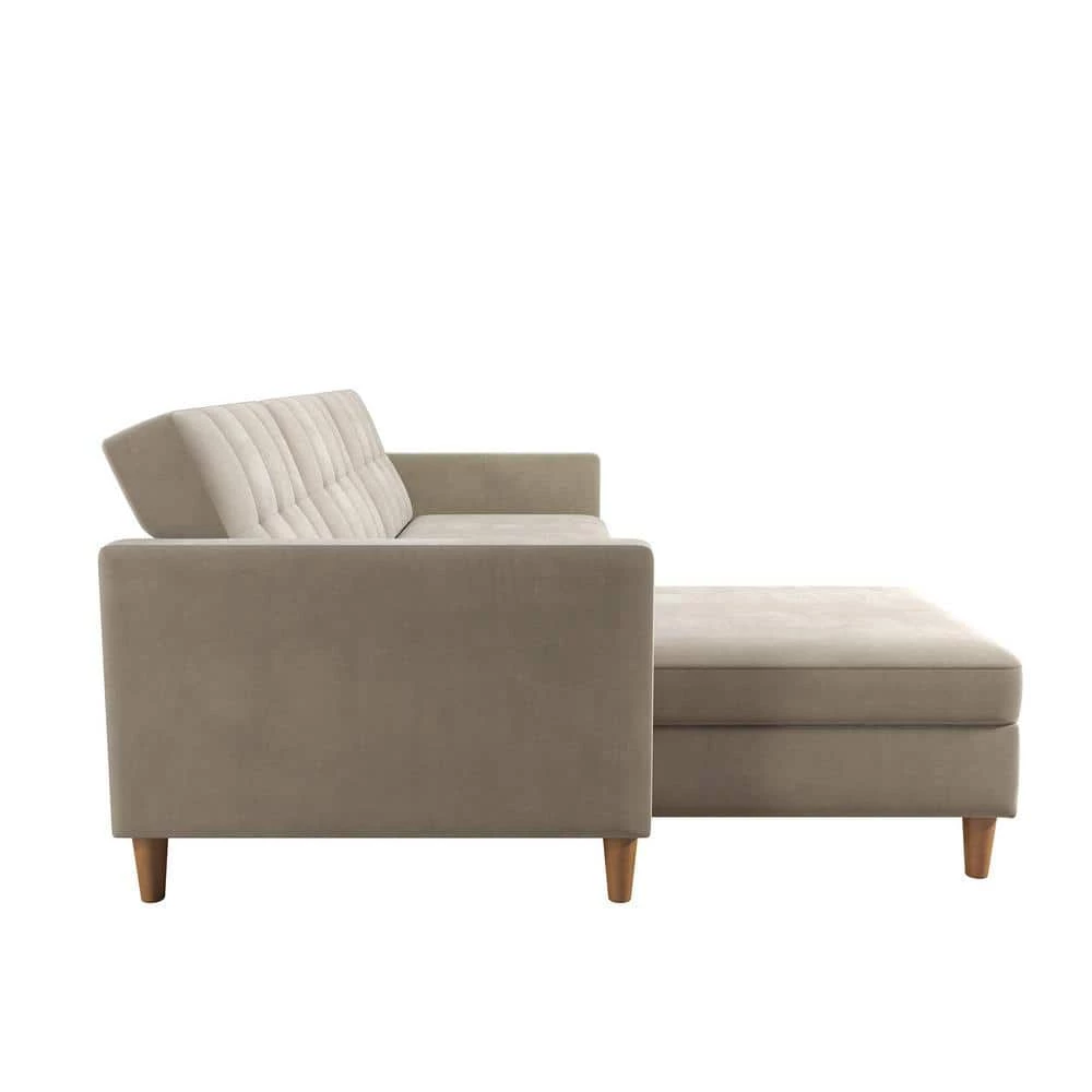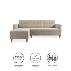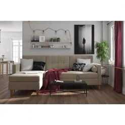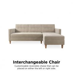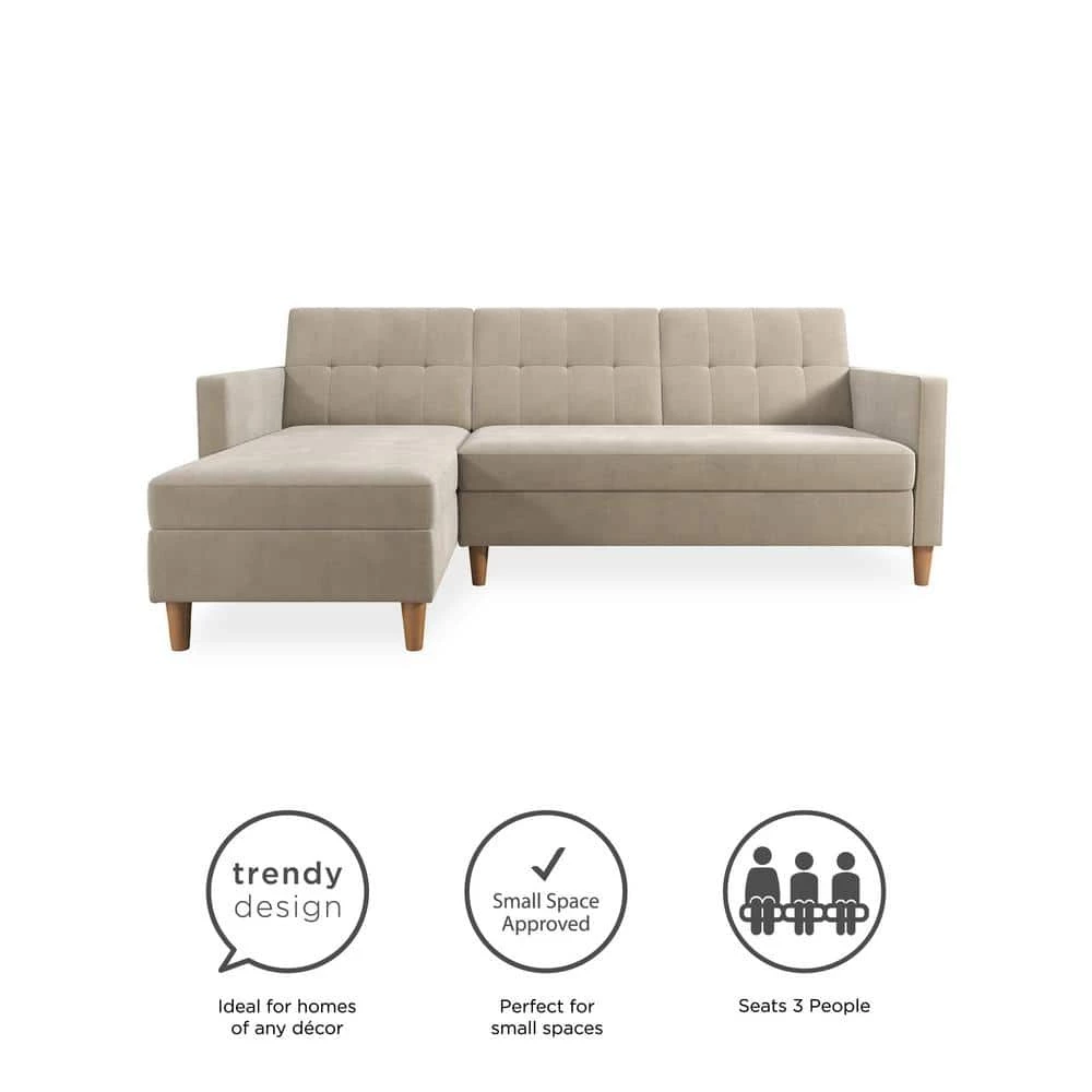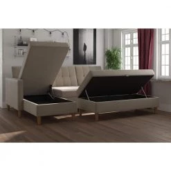 Unwind and relax on our DHP Hanna Storage Futon/Sectional. This contemporary sectional will nicely compliment your living room with its clean and relaxed look. The chaise is interchangeable, allowing you to choose from whichever side looks and fits best for your home. Designed with an innovative click-clack feature, convert your sofa into a lounger or bed within seconds. Whether you’re watching television, lounging around or in need of an extra sleep space – this futon sectional is guaranteed to satisfy all of your needs. But wait, there’s more. Keep the clutter contained with the extra storage compartment in your chaise – ideal for organizing your pillows and blankets. Founded on a sturdy frame, we guarantee optimal stability and durability, up to 600 lb. Easy to assemble and clean, our sectional is available in various colors including Tan Chenille, Light Grey Chenille, Blue Chenille, Grey Chenille and Black Faux Leather. With premium quality and comfort, you can’t go wrong with our DHP Hanna Storage Futon/Sectional.