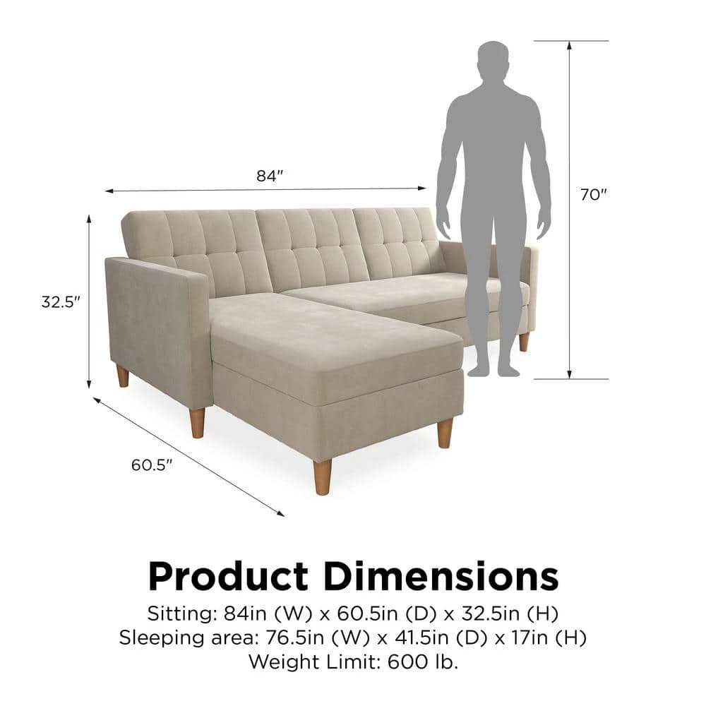- Sofa dimensions: 33 in. L x 54.5 in. W x 32.5 in. H, bed dimensions: 69 in. L x 84 in. W x 17 in. H, chaise dimensions: 60.5 in. L x 29 in. W x 32.5 in. H, weight limit: 600 lb.