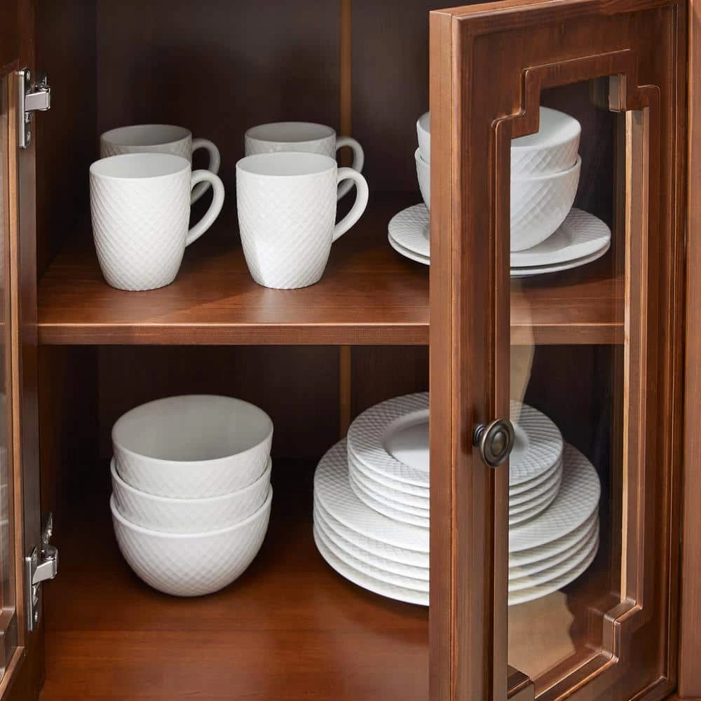 This classic walnut buffet from our Harriston Collection will add storage and style to your kitchen and dining room areas. Made of solid wood this piece provides long-lasting quality. Its ample storage space can be used for flatware, dishes or even table linens. The buffet feautures 3 generously sized drawers and 4 glass doors that open up to 3 storage comparments with an adjustable shelf in each. Antique bronze hardware adds rustic charm to this piece of furniture.