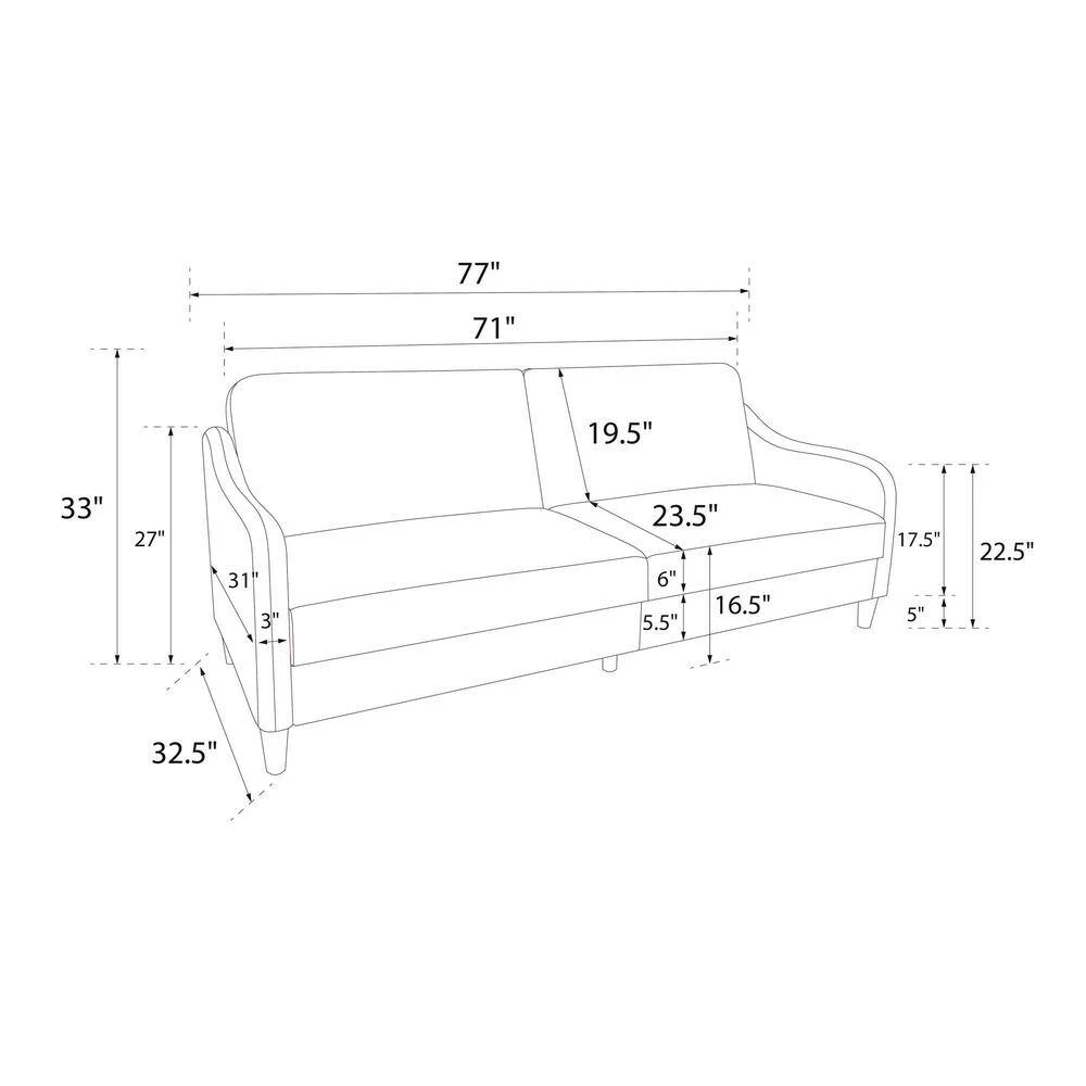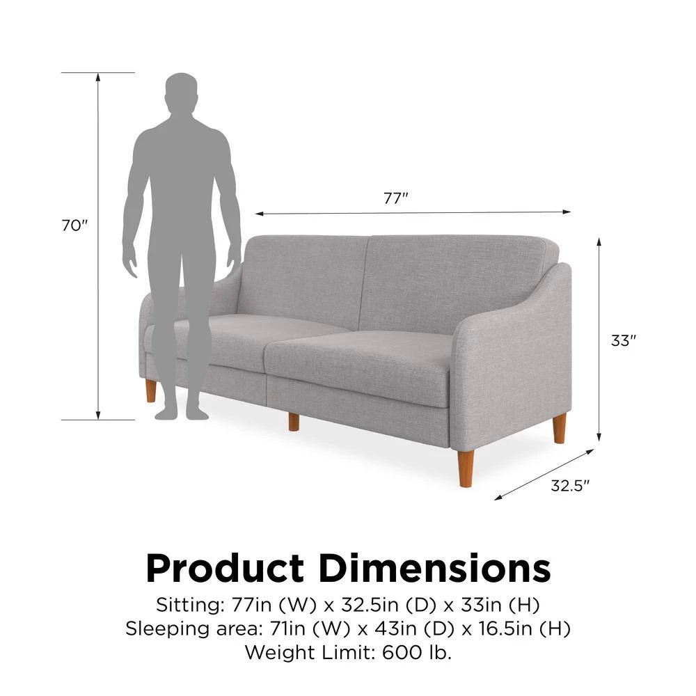 - Futon dimensions: 77 in. L x 32.5 in. W x 33 in. H, sleeping dimensions: 71 in. L x 43.5 in. W x 16.5 in. H, weight limit: 600 lb. shipping dimensions: 45 in. L x 36 in. W x 15 in. H, product weight: 101.5 lb. shipping weight: 114 lb.