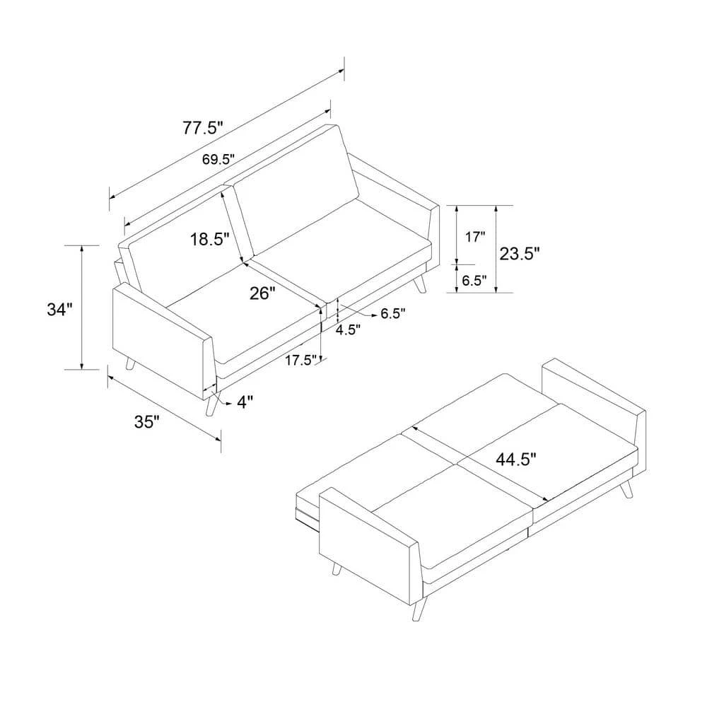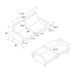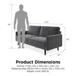 - Futon dimensions: 77.5 in. L x 35 in. W x 34 in. H, sleeping dimensions: 69.5 in. L x 44.5 in. W x 17.5 in. H, weight limit: 600 lb., shipping dimensions: 45 in. L x 36 in. W x 13 in. H, net weight: 103.5 lb., gross weight: 116.5 lb.