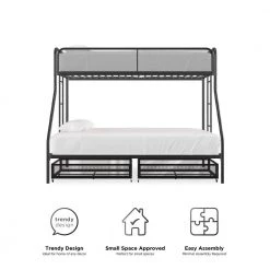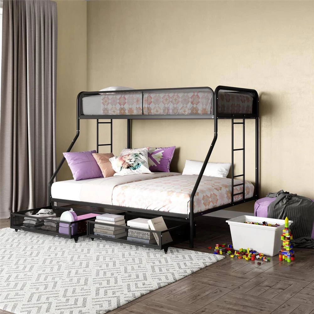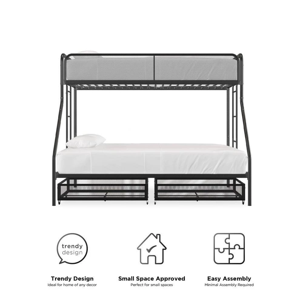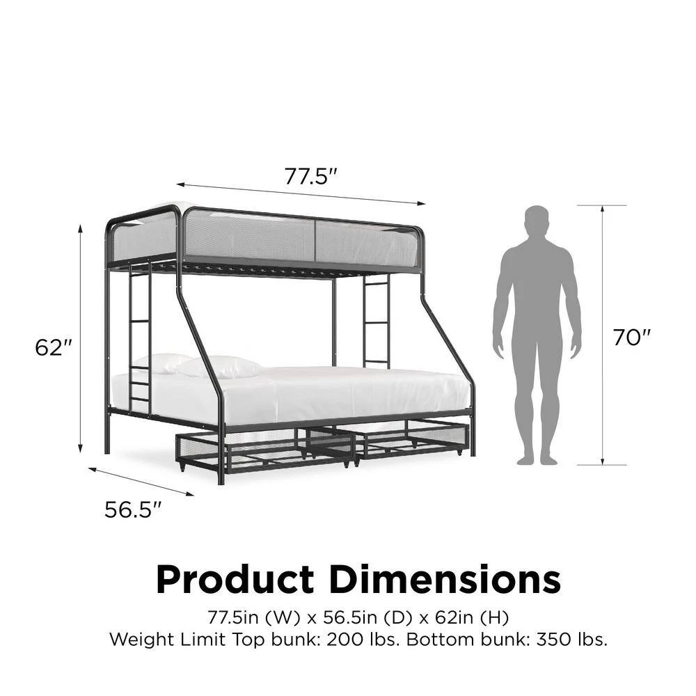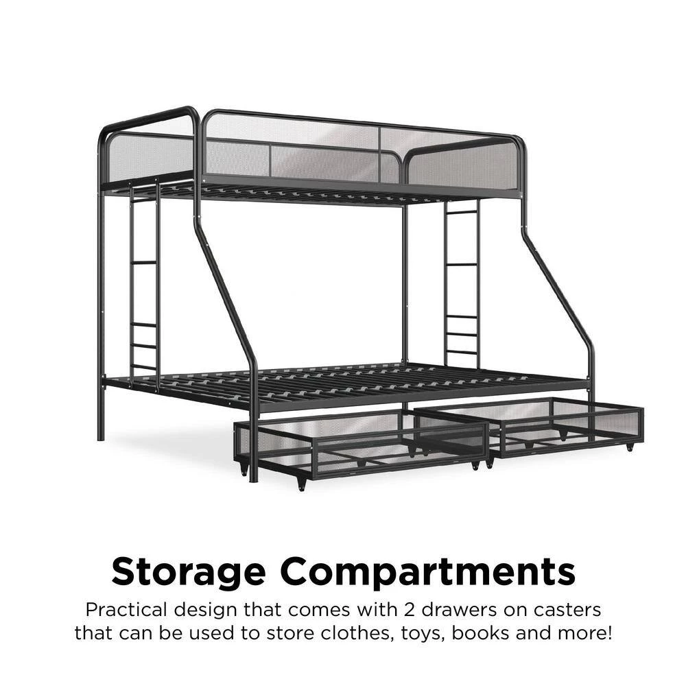 The DHP Juliet Twin/Full Metal Bunk Bed with storage is the ideal companion for your littles ones through their sleep journeys. This bunk bed optimizes the limited floor space. For a growing family and offers extra storage. For the essentials. The modern design comprises of clean-lined silhouette, accented with metal mesh on the upper guardrails and drawers. perfectly complement any bedroom arrangement. The DHP Juliet is made of a sturdy metal frame, full-length guardrails and an integrated ladder that allows your little ones to hop on and off. In addition, both beds come with a metal slats system that ensures stability and also allows air circulations for the mattresses. This bed is perfect for limited space. bedroom as it fits one standard twin size mattress and one standard full size mattress (sold separately) without needing a foundation. What’s more, this bunk bed makes the most out of the space.given by including two wide storage.drawers.on casters underneath the bed, makes it ideal for keeping toys, sheets and off-season clothing away. Expect nothing less than smiles and laughter when your little ones sleep on the DHP Juliet Twin/Full Metal Bunk Bed with storage.