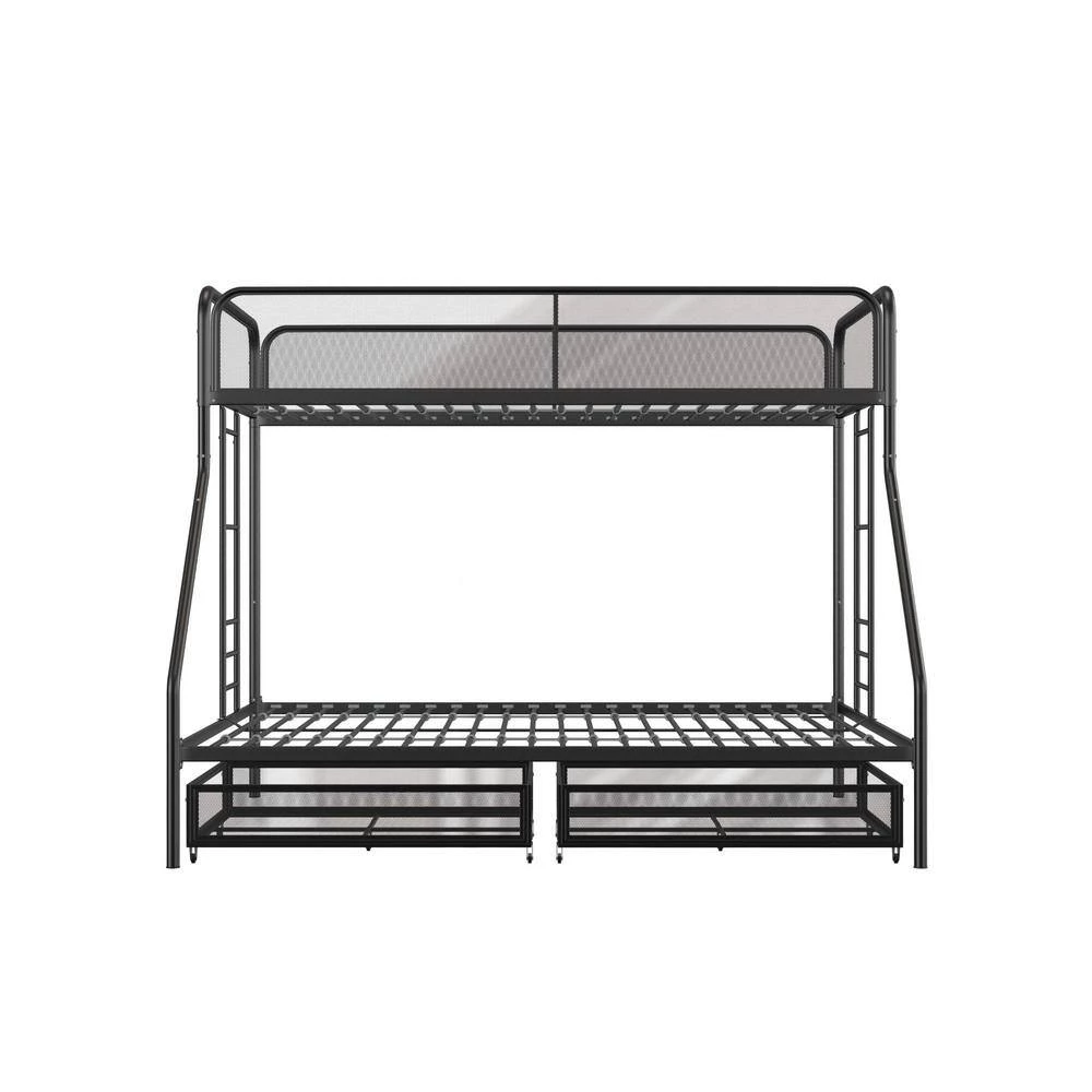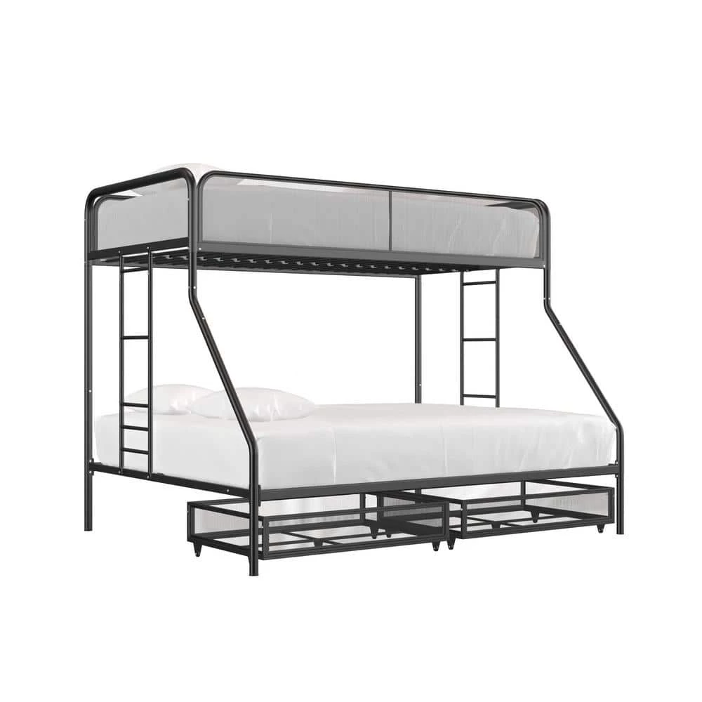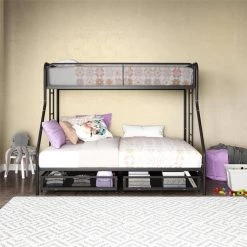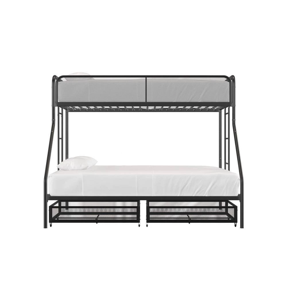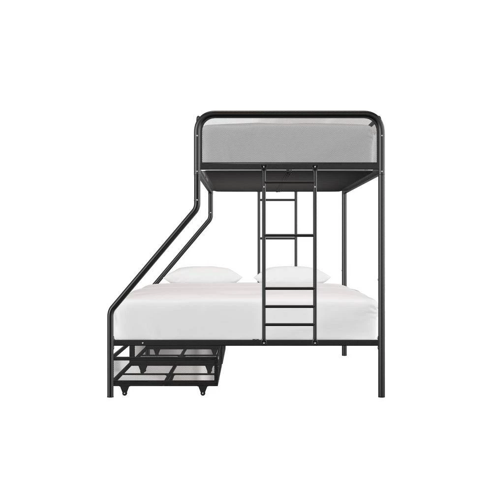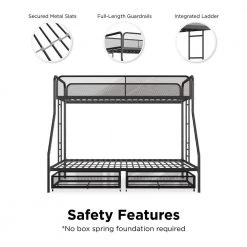 The DHP Juliet Twin/Full Metal Bunk Bed with storage is the ideal companion for your littles ones through their sleep journeys. This bunk bed optimizes the limited floor space. For a growing family and offers extra storage. For the essentials. The modern design comprises of clean-lined silhouette, accented with metal mesh on the upper guardrails and drawers. perfectly complement any bedroom arrangement. The DHP Juliet is made of a sturdy metal frame, full-length guardrails and an integrated ladder that allows your little ones to hop on and off. In addition, both beds come with a metal slats system that ensures stability and also allows air circulations for the mattresses. This bed is perfect for limited space. bedroom as it fits one standard twin size mattress and one standard full size mattress (sold separately) without needing a foundation. What’s more, this bunk bed makes the most out of the space.given by including two wide storage.drawers.on casters underneath the bed, makes it ideal for keeping toys, sheets and off-season clothing away. Expect nothing less than smiles and laughter when your little ones sleep on the DHP Juliet Twin/Full Metal Bunk Bed with storage.