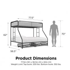 - Bunk bed dimensions: 77.5 in. l x 56 in. w x 62 in. h, net weight: 117 lbs. top bunk weight limit: 200 lbs., bottom bunk weight limit: 350 lbs. storage drawers weight limit: 40 lbs. carton dimensions: 86 in. l x 15 in. w x 9 in. h, gross weight: 127 lbs.