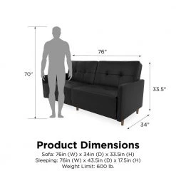 - Sofa dimensions: 76 in. L x 34 in. W x 33.5 in. H, sleeping dimensions: 76 in. L x 43.5 in. W x 17.5 in. H, carton dimensions: 45.5 in. L x 36 in. W x 17.5 in. H, weight limit: 600 lbs.