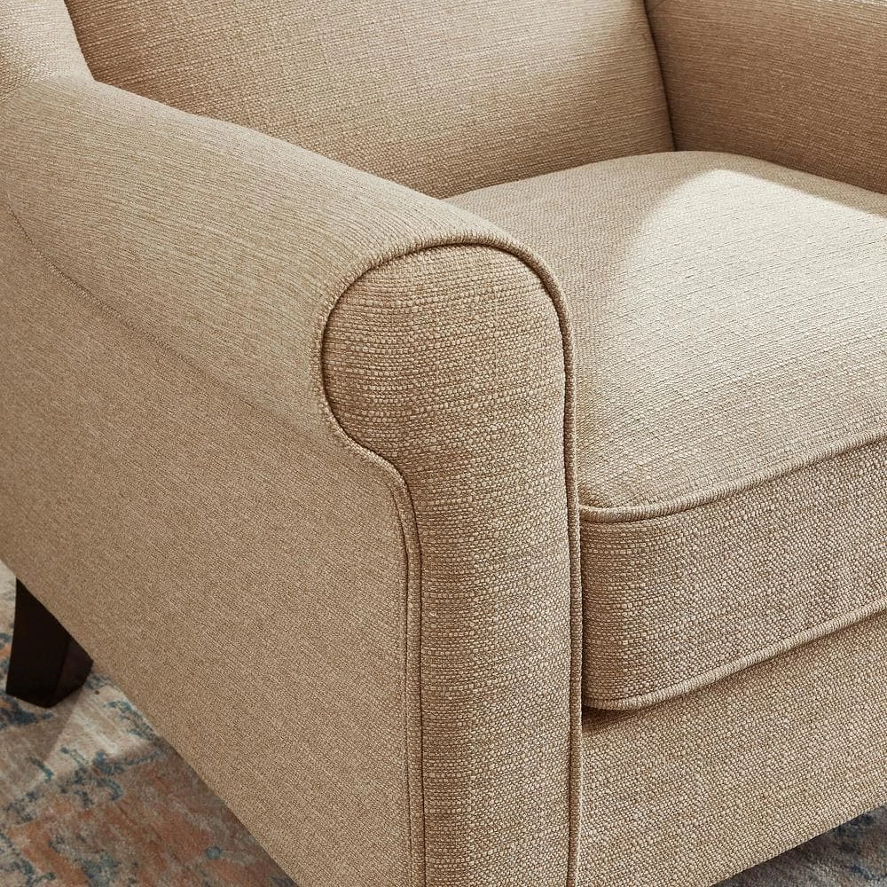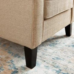 - Neutral khaki fabric upholstery pairs perfectly with a range of decor themes