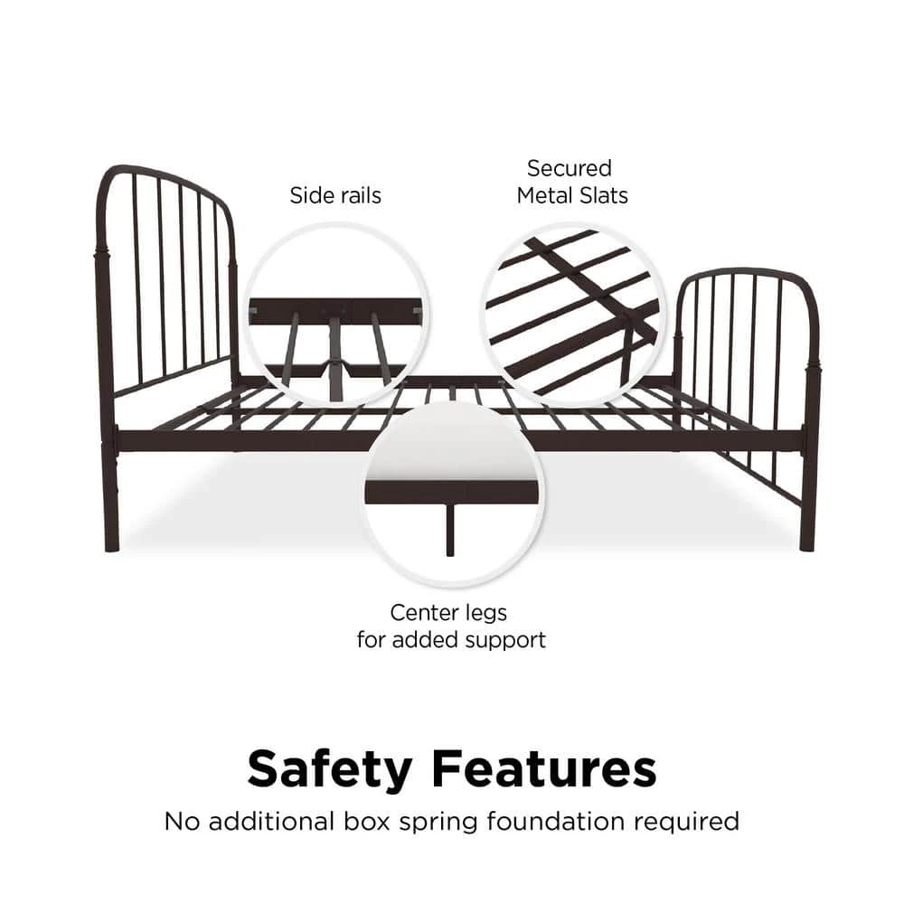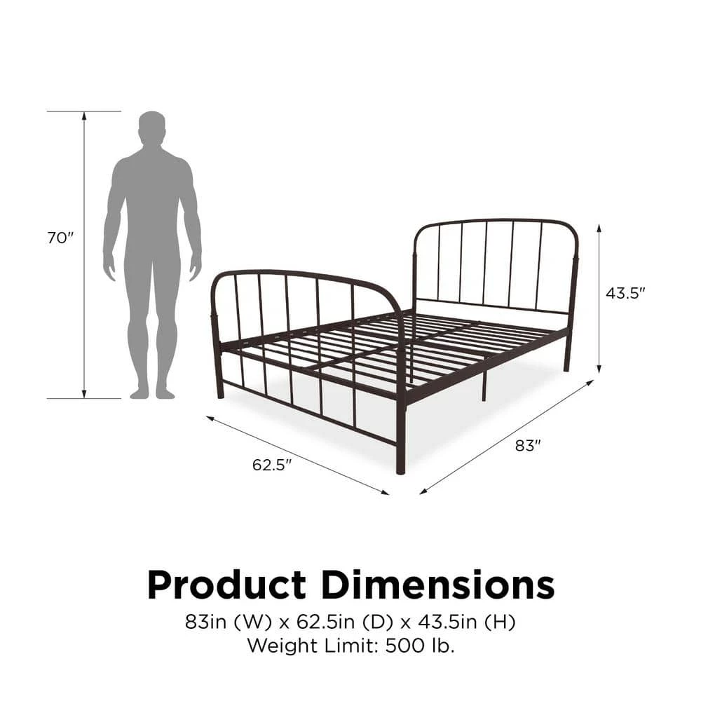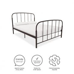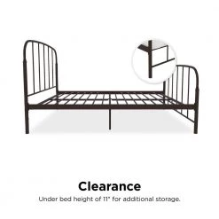 Going to bed has never been more pleasing with the DHP Lilia Metal Bed. This classic bed frame has a clean-lined silhouette to perfectly fit in any room. Made with strong metal, the Lilia comes with secured metal slats so no foundation or box spring is required. The arched headboard and footboard add a stunning appeal to the timeless design of this piece, allowing you to mix and match your style whether it’s rustic or modern. With an ample under-bed clearance of 11 in., you can use the space to store away extra seasonal clothes and shoes, magazines and toys. Just liven up the Lilia with a comfortable mattress (sold separately), some colorful about solid sheets, a plush pillow and warm blanket and enjoy a sound rest. Available in twin, full, queen, king, the DHP Lilia Metal Bed will be a delightful addition to a master bedroom, a guest room, a child’s room, a college dorm room.