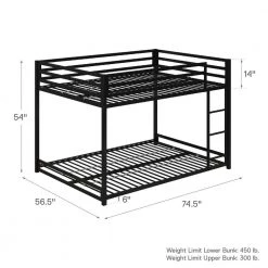 - Full-full bed dimensions: 77.5 in. L x 56.5 in. W x 54 in. H, upper bunk weight limit: 300 lb. lower bunk weight limit: 450 lb.