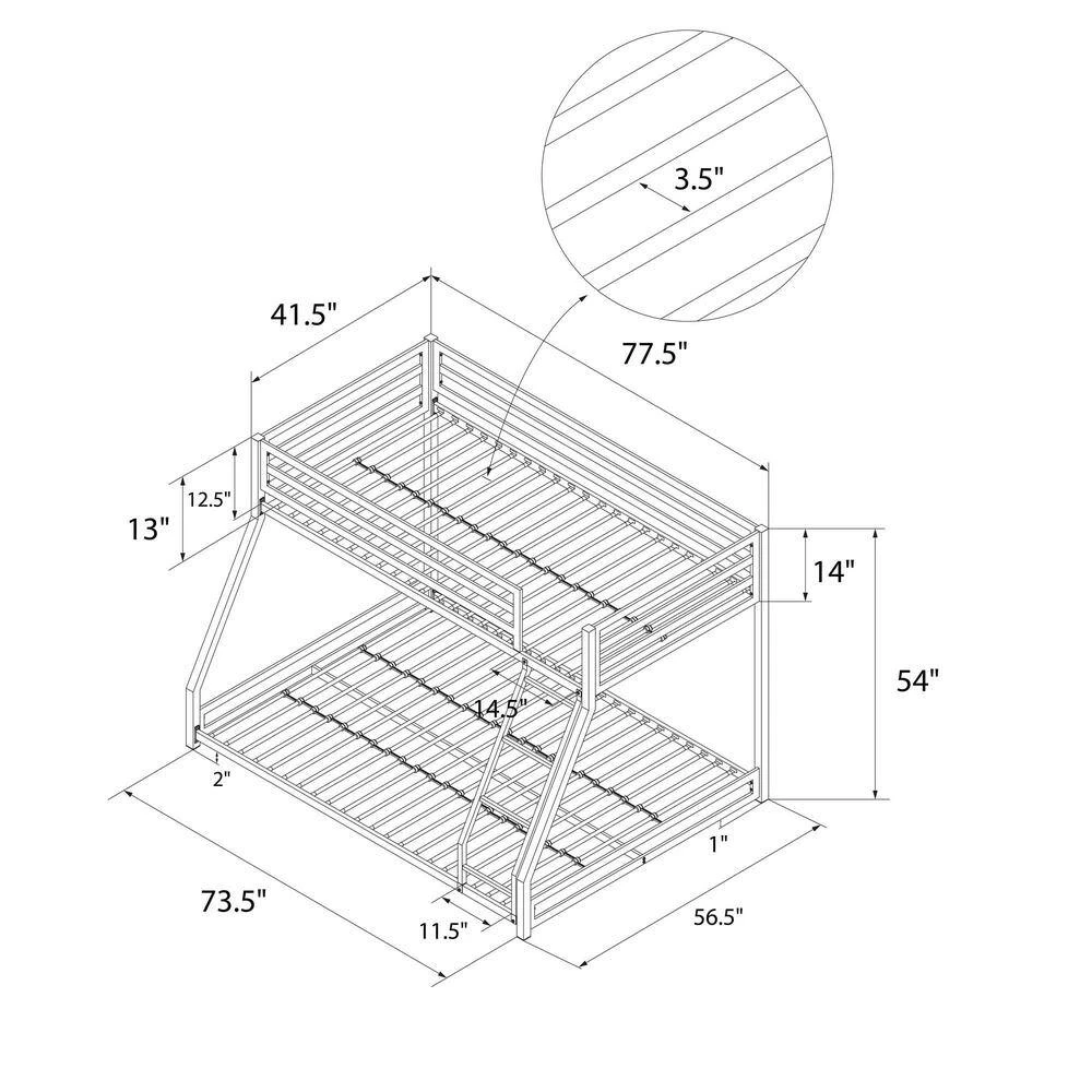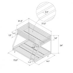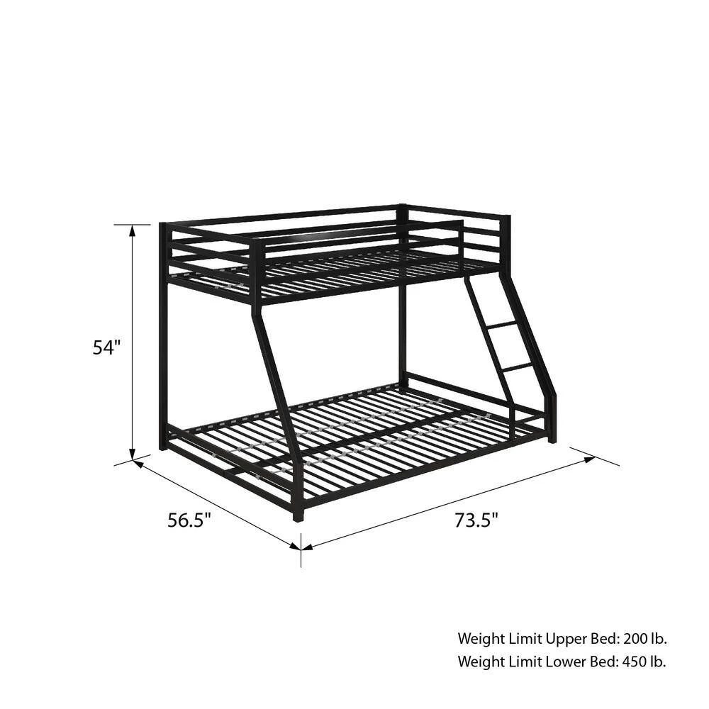 - Twin-full bed dimensions: 77.5 in. L x 56.5 in. W x 54 in. H, lower bunk weight limit: 450 lb. upper bunk weight limit: 200 lb.