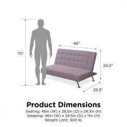 - Sofa dimensions: 46 in. L x 28.5 in. W x 24.5 in. H, bed dimensions: 46 in. L x 34.5 in. W x 11 in. H, weight limit: 300 lb.