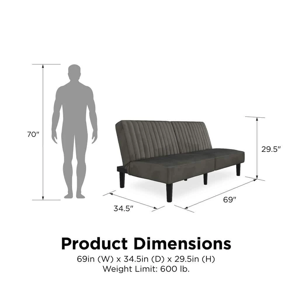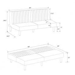 - Product dimensions: sofa – 69 in. L x 34.5 in. W x 29.5 in. H, sleeping – 69 in. L x 39 in. W x 15 in. H, weight limit: 600 lbs, net weight: 63 lbs, shipping dimensions: 35 in. L x 39 in. W x 13 in. H, gross weight: 70 lbs.