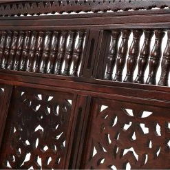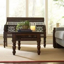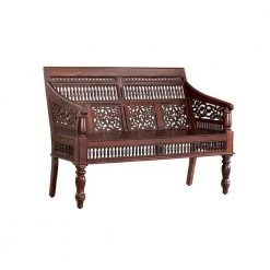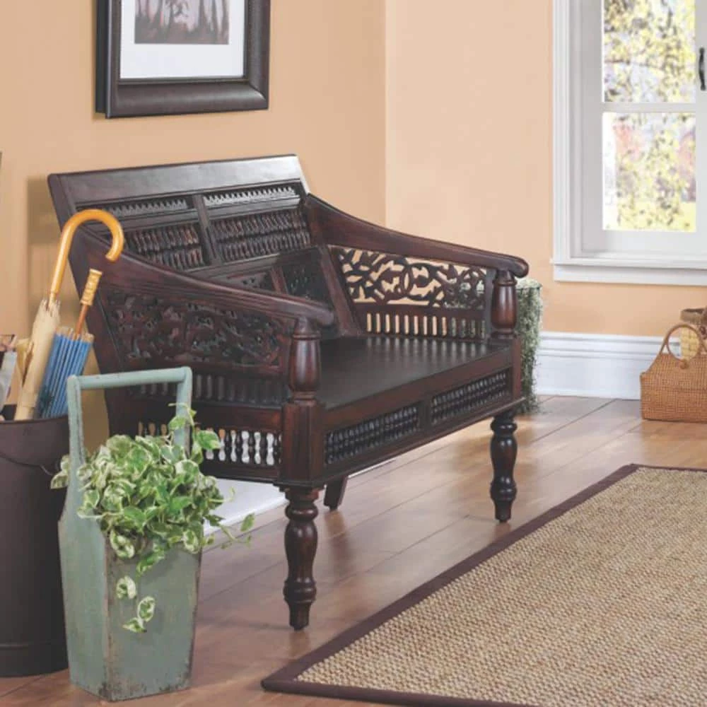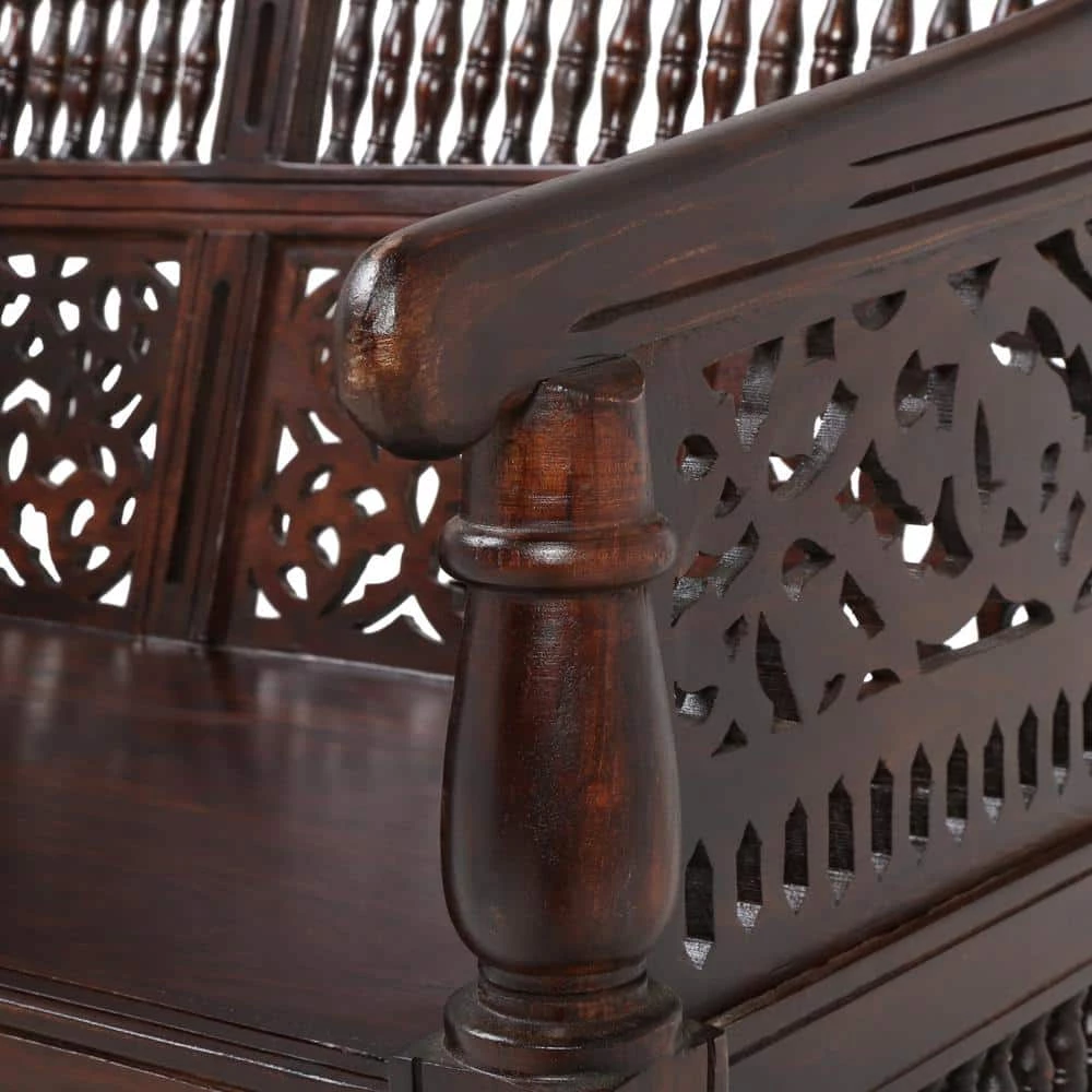 The meticulous hand-carved details of our Maharaja Settee include delicate fretwork panels, turned columns and front legs, and rows of short spindle ornamentation. The deceptively delicate look of this sturdy bench creates a gorgeous and functional focal point. This settee endows your entryway or living room with handcrafted beauty.